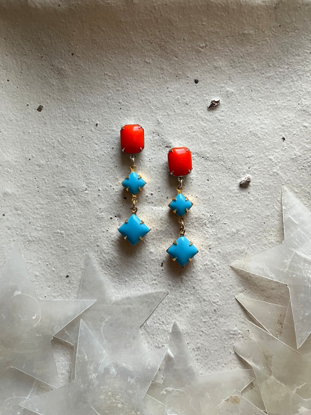 ※ご購入前に「attention」のページをご一読ください。 ※受注生産になりますのでお支払い完了を確認後にお届けまで1~2週間ほどいただきます。お急ぎの方はメッセージや備考欄に明記をお願いします。ご要望に合わせて出来る限りの対応はさせていただきます。 それぞれが魅力的なヴィンテージのガラスストーンを組み合わせてピアスにしました。 トップは透明感の無いオレンジ色のガラスストーン。下の最高にかわいい発色のターコイズに近いブルーとのコントラストをシンプルに楽しんでいただきたくて制作しました。 発色の良さで華やかな雰囲気ではありますが、ヴィンテージガラスならではの上品かつ落ち着いた彩度の素晴らしさが際立つのでカジュアルな装いにも楽しんでお着けいただけます。 サイズ:全長約5.2㎝ 素材:ヴィンテージガラス・合金+メッキ・合金・ピアスポスト(軸)はチタン