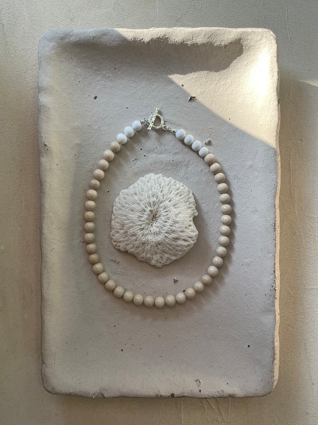◇Milk tea choker◇ ※受注生産になりますのでお支払い完了を確認後にお届けまで1~2週間ほどいただきます。お急ぎの方はメッセージや備考欄に明記をお願いします。ご要望に合わせて出来る限りの対応はさせていただきます。 肌なじみの良いミルクティー色のリバーストーンに惹かれて作ったチョーカータイプのネックレス。天然石の持つ魅力と力強さ、ヴィンテージのガラスビーズが放つ歪さと愛くるしさとのマリアージュもお楽しみください。 ベージュのの8mm丸玉はリバーストーン。ほんのりと模様が入っていてボリュームもしっかりあります。HUEらしさを少し含みたく、ジャパンヴィンテージの丸玉ビーズをエンドパーツの近くに7粒入れました。留め具に使ったマンテルはカレンシルバー(95%以上シルバー)になります。 単品でももちろん満足感のある商品ですが、これからの季節におすすめの重ね着けを楽しめるようにそれぞれを違う長さでお作りしました。シンプルなニットやスウェットに合わせたりリネンのシャツに合わせたり。 以前に販売しているHUEの他のネックレスやチャームとの合わせやすさも意識して制作致しました。 永く使えるビーズネックレスに仕上げたかったので、金具は高級感のあるsilver製のものを使用しています。マンテルのハンマートーンのテクスチャーも良い感じです◎ 長さ:約39cm ※リバーストーンの玉の数2つ分までサービスで長さを足す事は可能です。ご希望の方は1粒(8mm)追加、又は2粒(16mm)追加を【備考欄】に書いて下さい。 ※2連等でブレスレットは中に通しているワイヤーが変形してしまうためおすすめ致しません 素材:リバーストーン、日本製ヴィンテージガラス、金具はsilver製(925又は950)