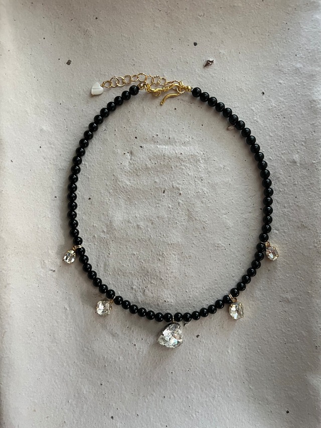 ※受注生産になりますのでお支払い完了を確認後にお届けまで1~2週間ほどいただきます。お急ぎの方はメッセージや備考欄に明記をお願いします。ご要望に合わせて出来る限りの対応はさせていただきます。 ヨーロッパのvintageのガラスストーンとブラックオニキスを合わせてチョーカーに 大人の遊び心を、とキラキラを楽しんでいただきたく形の違うガラスストーンを盛り込みました ヴィンテージならではのガラスストーンの控えめな美しさ カットや形も今のものにはないものもあります 真ん中のハートは斜めに入れて 短めでニットやスウェットからガラスストーンが少しだけ出るのが良いなあと思って制作しましたが、装いや気分で長さを変えられるように数センチのアジャスターをつけております サイズ:全長約38cm+アジャスター5cm 素材:オニキス、ヴィンテージガラス(セッティング台とピンとカンは合金+メッキ) 留め具→silver925+メッキ アジャスターチェーン→14kgf アジャスターのハート→貝