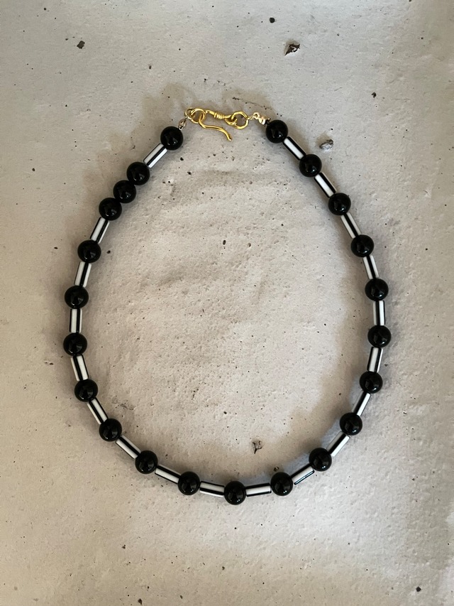※2025年3月留め具近くのビーズ並びを一部分updateしました。着画以降が旧商品になります。 ◇black onyx and stripe beads choker◇ ※こちらは受注生産になりますのでお支払い完了を確認後にお届けまで1-2週間ほどいただきます。お急ぎの方はメッセージや備考欄に明記をお願いします。ご要望に合わせて出来る限りの対応はさせていただきます。 つやつやのブラックオニキスの丸玉ビーズと、ストライプの筒状のガラスビーズを並べたチョーカー。正球に近いオニキスと手作りならではの揺らぎのあるストライプビーズの組み合わせはシティにもバカンスにも合います。 留め具はsilver925+ゴールドメッキのフック型で古代の装飾品を思わせるような少し高級感のあるものをチョイスしました。留め具近くはアクセントとしてオニキスを三つ連ねました。 オニキスは「迷いのない信念」を象徴する石と言われていて、心に落ち着きを与え、意志の強さをもたらすことで、対人関係を良好に保ったり、悪縁を断ち、新しい出会いへと導いてくれる効果が期待できるとの事。 「黒」という色の中にも様々な彩度や強さがあり、合わせる素材によってそれが際立ちます。モノトーンの素材の組み合わせですが、ストライプビーズの揺らぎからでる柔らかさもあり、カジュアルな装いが多い私の日常にも活躍してくれています。 長さ:約38.5-39cm 素材:オニキス、ガラス、金具→14kgf.silver925+GP