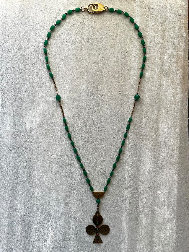 ※こちらは【green&cross】の購入ページになります。 長らくロザリオが好きです、たたずまいのその姿かたちが単純に。 クリスチャンではないので小さな頃から身近なものというわけではありません。しばらく訪れていませんがヨーロッパに行くと大小問わず教会に入るのが好きで、ステンドグラスや装飾、そして街の雑踏からの静けさとひんやりした場所になぜか何となく安堵感を抱き、「しばらくお邪魔させていただきます」と心の中で呟き、しばらくの時間を過ごしたりしました。 大きめな教会の入り口には、使われているビーズも値段も様々なロザリオが売っているのをじっと眺めたり。 今でこそ似た形のアクセサリーはたくさんありますが、いざ意味を調べてみると本来は首から下げるものではなく祈りを唱える際に手に握るもののようです。 Y字のロザリオをソースに制作したネックレスですが、ビーズの数やトップのクロスではないものにアレンジしているので本来のロザリオとは辿り着いた形は大きく変わりましたが、とてもお気に入りの作品が出来ました。長さもたっぷりとしたデザインになっています。 ※天然素材やヴィンテージの素材には個々に差があるものがございます。それぞれの素材の特性をご理解いただいた上でのご購入をお願いします。 長さ:全長→約70cm、Y字の下部分→約7cm、クロスチャーム→縦2.8cm×横1.8㎝ 素材:ヴィンテージガラス、淡水パール、合金+メッキ、合金