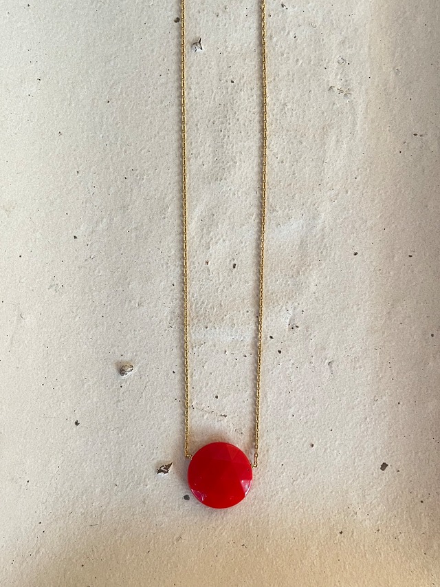 ※ご購入前にAttentionをご一読ください。 ※受注生産になります。お支払いを確認後に制作に入るためお届けまで2-3週間ほどいただいております。お急ぎの方はメッセージや備考欄に明記をお願いします。ご要望に合わせて出来る限りの対応はさせていただきます。 ※天然素材やヴィンテージの素材には個々に差があるものがございます。それぞれの素材の特性をご理解いただいた上でのご購入をお願いします。 Red moon necklace(chain) こちらはチェーンタイプの購入ページになります 真っ赤なお月さまのような2㎝ほどのアンティークガラスパーツをメインにシンプルに14kgf製のチェーンやドイツ製の丸玉ビーズを合わせてシンプルなネックレスに。 なんといっても主役は赤いガラスパーツ! 今では見かけない三角形が並んだような美しいカットが入っていて、 光を受けるカットがより魅力的に見えます。 使用しているチェーンやワイヤーには14kgf製のものを使用しています。ゴールドの膜を圧着しているのでメッキより長持ちすると言われています。チェーンには繊細な筋が入っていて華奢ではありつつも程よく存在感があります。 チェーンタイプは胸元よりも少し下にくるので、チョーカータイプのビーズネックレスやチェーンのジュエリーなどとの重ね付けも素敵です。 2wayにするか制作途中でとても迷いましたが、1連のみで使えるようにしたので、潔く留め具はあえて付けませんでした。首の後ろにはヴィンテージの真っ赤なビーズを5粒並べました。 これからの季節、リネンのブラウスやワンピース、白いTシャツに合わせて。黒に合わせても赤の発色の良さが際立ちます。 size:長さ約74cm. 赤のガラスパーツ直径約2.2cm material:アンティークガラス、ヴィンテージガラス、金具は14kgf(ゴールドの膜を圧着したもの。メッキよりゴールドの厚みがあり剥がれにくいと言われています。)