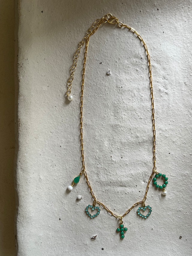 ※ご購入前にAttentionをご一読ください。 ※受注生産になります。お支払いを確認後に制作に入るためお届けまで2-3週間ほどいただいております。お急ぎの方はメッセージや備考欄に明記をお願いします。ご要望に合わせて出来る限りの対応はさせていただきます。 ※天然素材やヴィンテージの素材には個々に差があるものがございます。それぞれの素材の特性をご理解いただいた上でのご購入をお願いします。 シンプルな装いになりがちな暑い季節から秋冬の合わせも思い浮かべて、大人向けの遊びがあるチャームネックレスを制作しました。 全てヴィンテージのガラスストーンを埋め込んだチャームパーツになります。 約15ミリ以下の大きさが控えめなチャームたちがほとんどですが、それぞれに存在感のあるチャームをぶら下げました。発色のよいグリーンと赤のカットが入っていないガラスはスワロフスキーのヴィンテージストーン。今にはない透明感のないヴィンテージスワロフスキーの放つ色たちは貴重でもありデザイナー自身も個人的にも大好きです。ハーフムーンのクリアなストーンチャームも素敵です。ブラックにはカットが入った♥を。 長さは迷いに迷って40cm程にしました。アジャスターが10cm分あるので、最長50cm程でもご使用いただけます。 ※正面がはっきりしているネックレスの場合、基本的には右利きの方用に右側に開閉をする留め具をつけています。コメント欄に「左利き用で」と明記していただければ左側に留め具を付け変える対応致します。金具の位置が利き手用に変わるだけで着けやすさもぐっとあがります。 ※手首にしてブレスレットとしても使えますが、手元は首元よりも負荷がかかる事が多いのでラインストーンやチャーム自体が取れてしまう可能性がございます。 size:約41cm+アジャスターチェーン10㎝ material:チェーン及び金具→合金+ゴールドメッキ(GP) (メインのチェーンのメッキは厚みがあるものをチョイスしました) アンティークガラス、ヴィンテージガラス、ホワイトオニキス、淡水パール