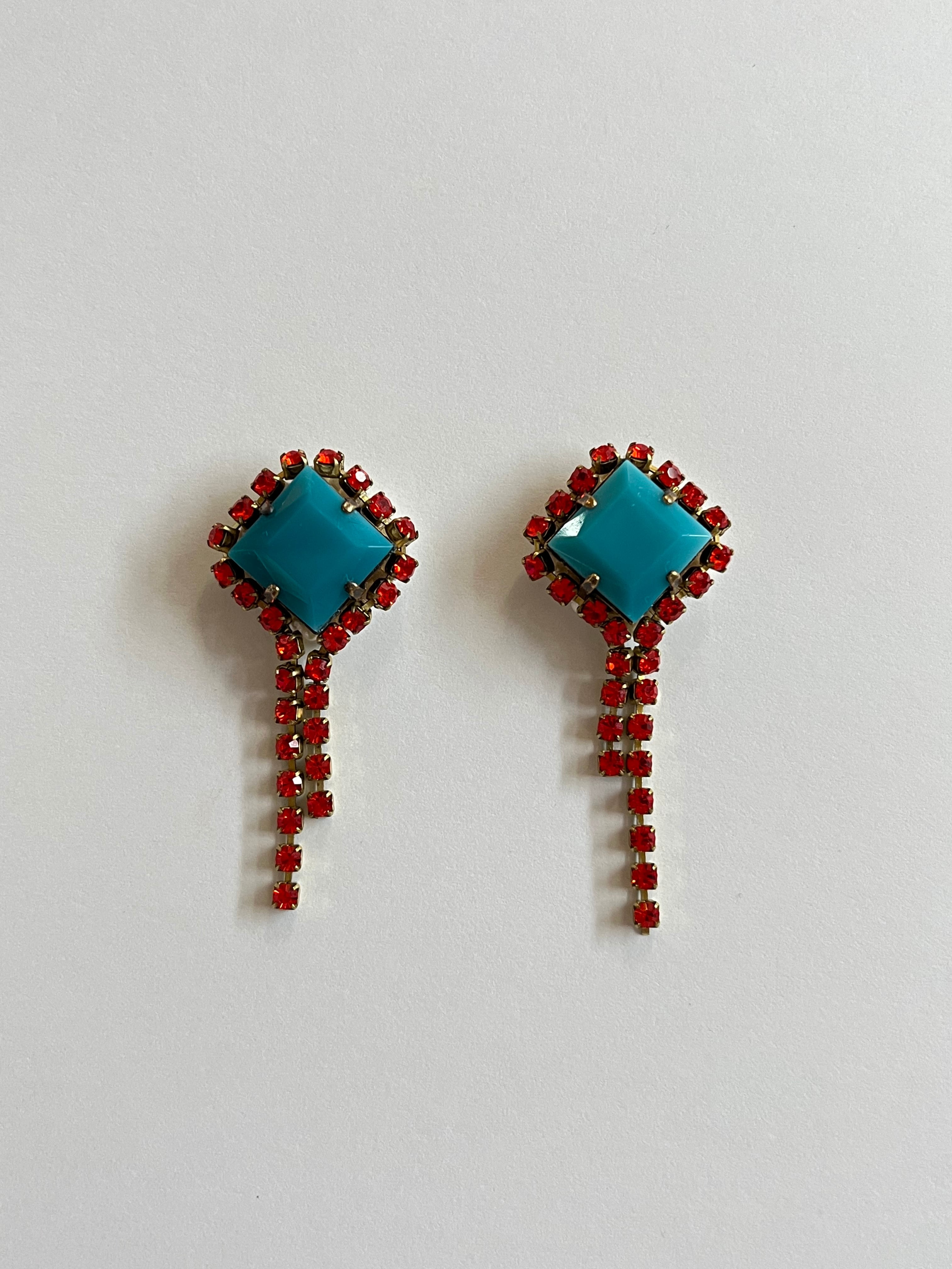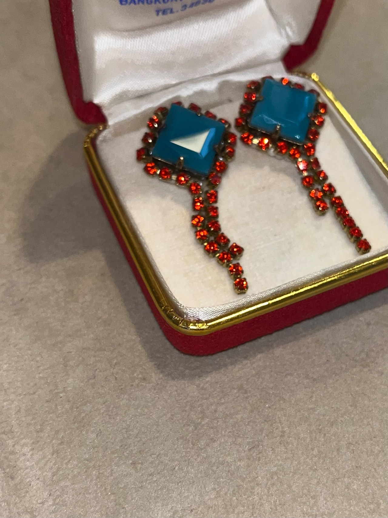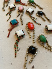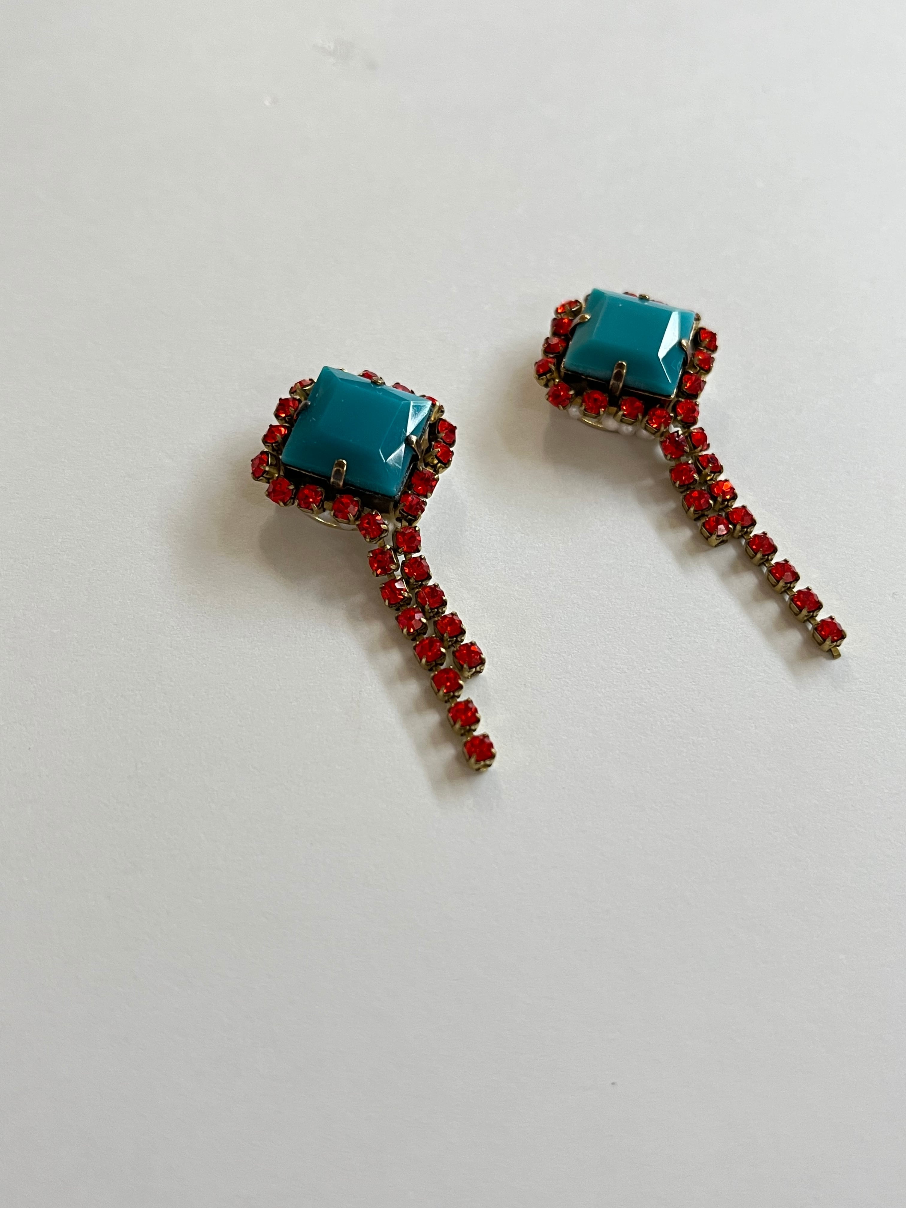 発色の良いピーコックブルー色のヨーロッパ製のガラスストーンの周りに鮮やかなオレンジ寄りのバーミリオンカラーのガラスが埋まっているストーンチェーンを纏わせて小さな彗星のようなピアスを制作しました。