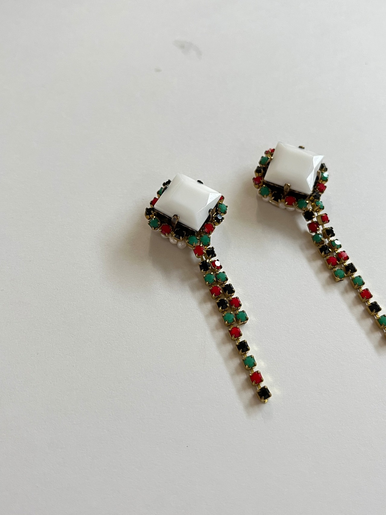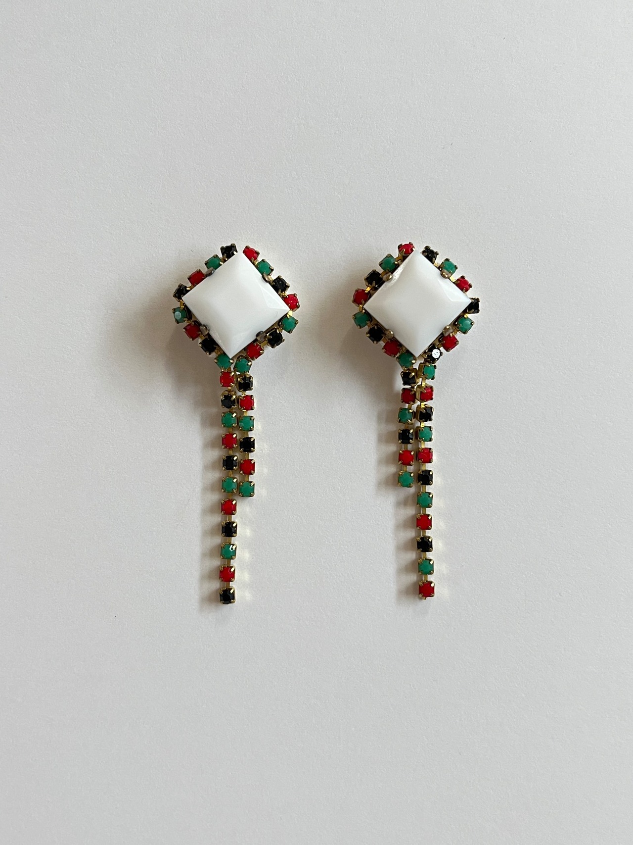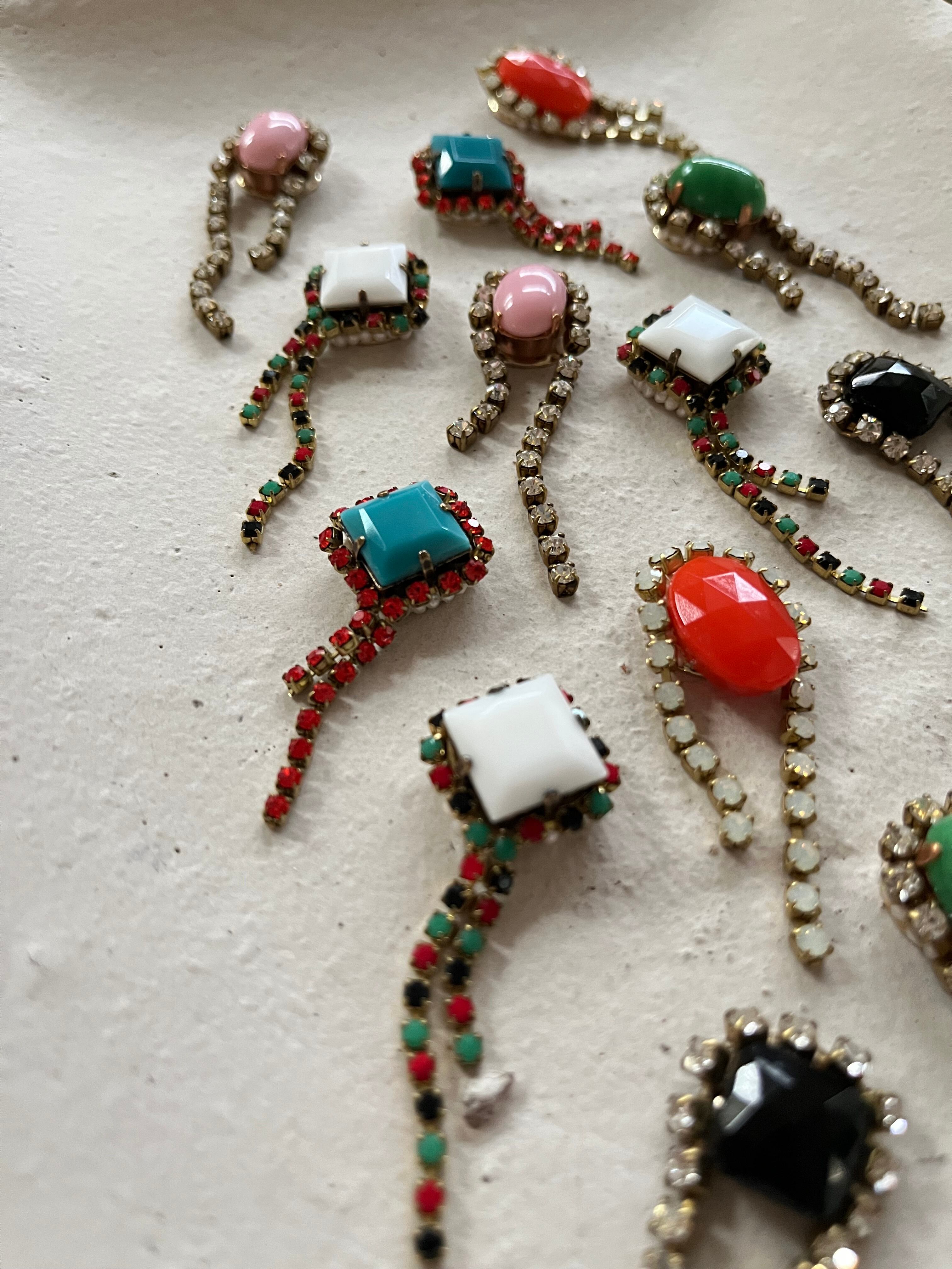 オフホワイトのヨーロッパ製のガラスストーンの周りに鮮やかな黒・赤・グリーンカラーのガラスストーンが埋まっているチェーンを纏わせて小さな彗星のようなピアスを制作しました。