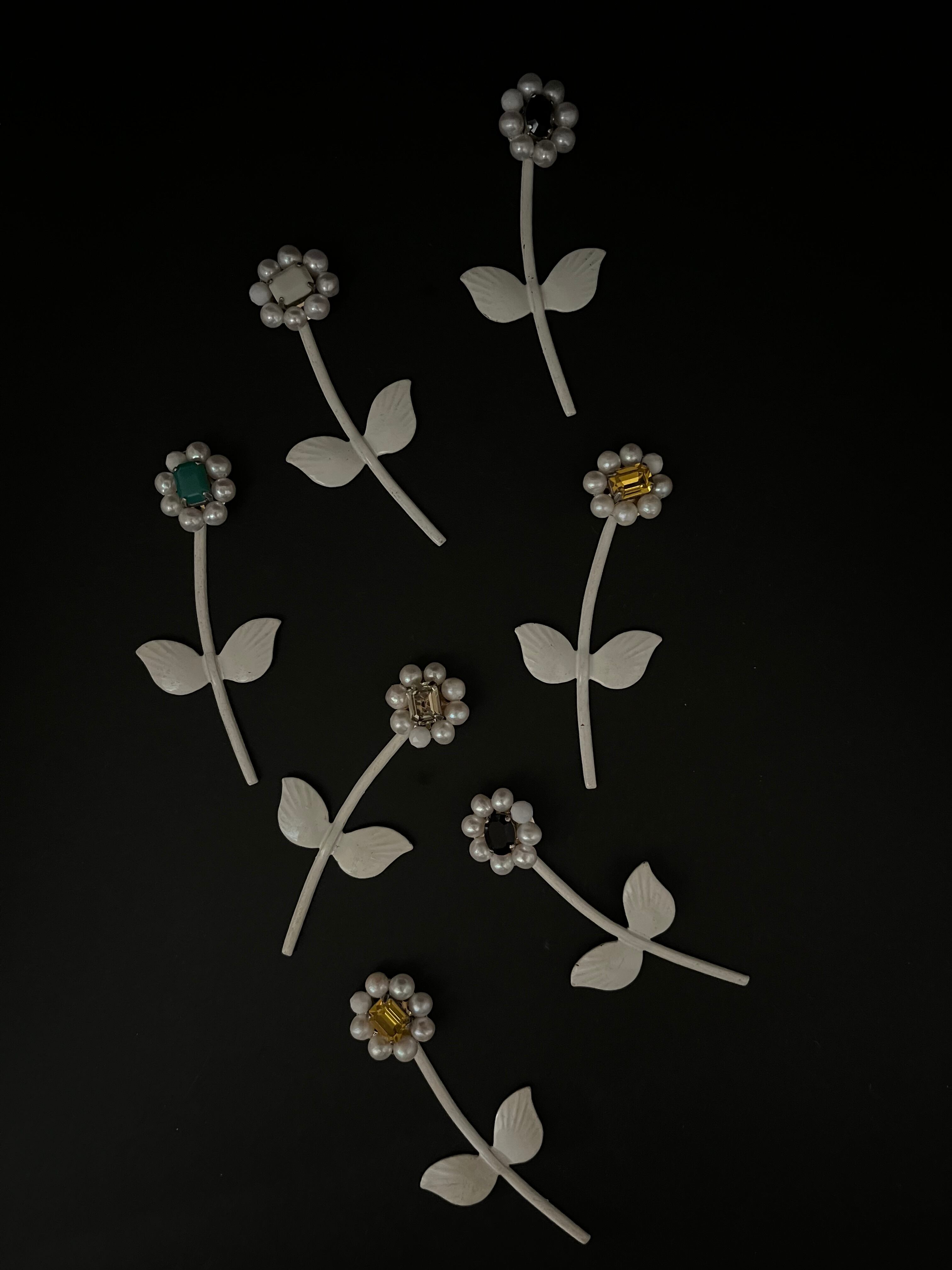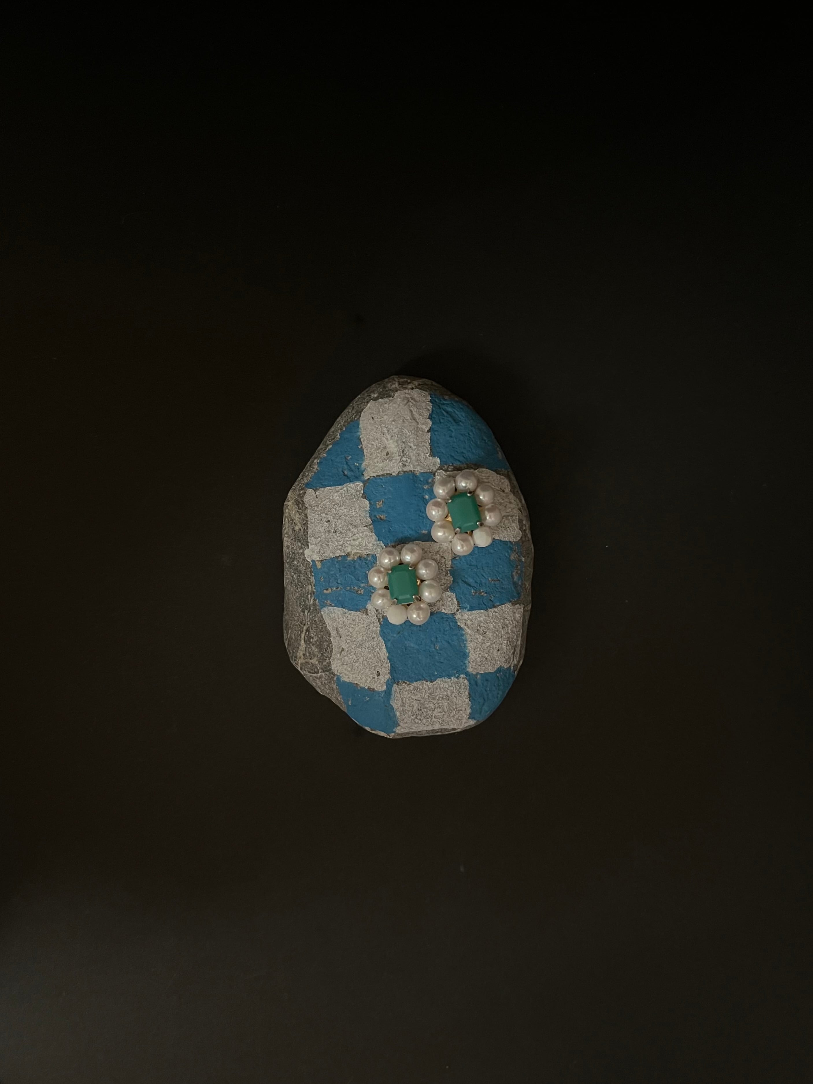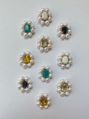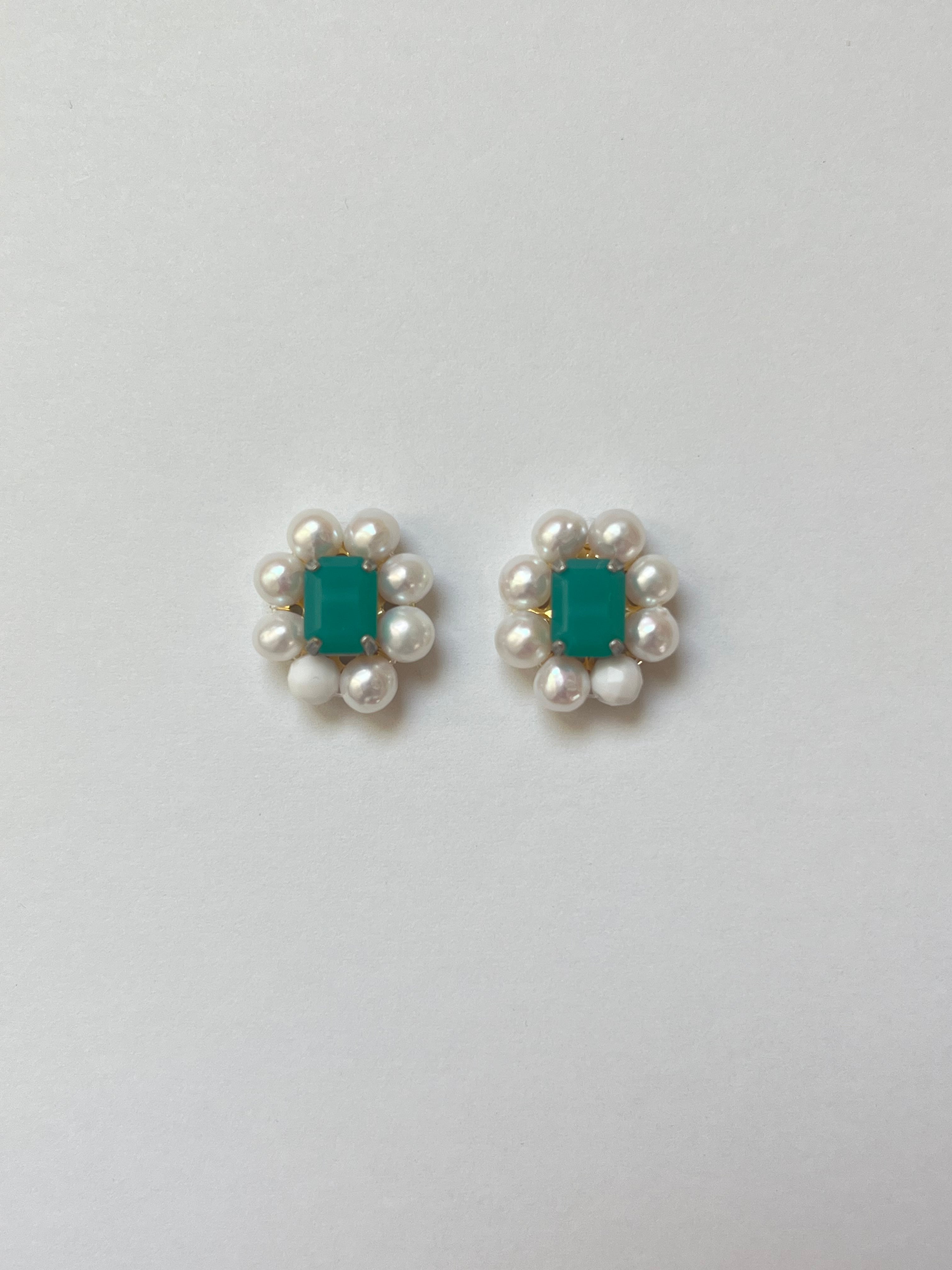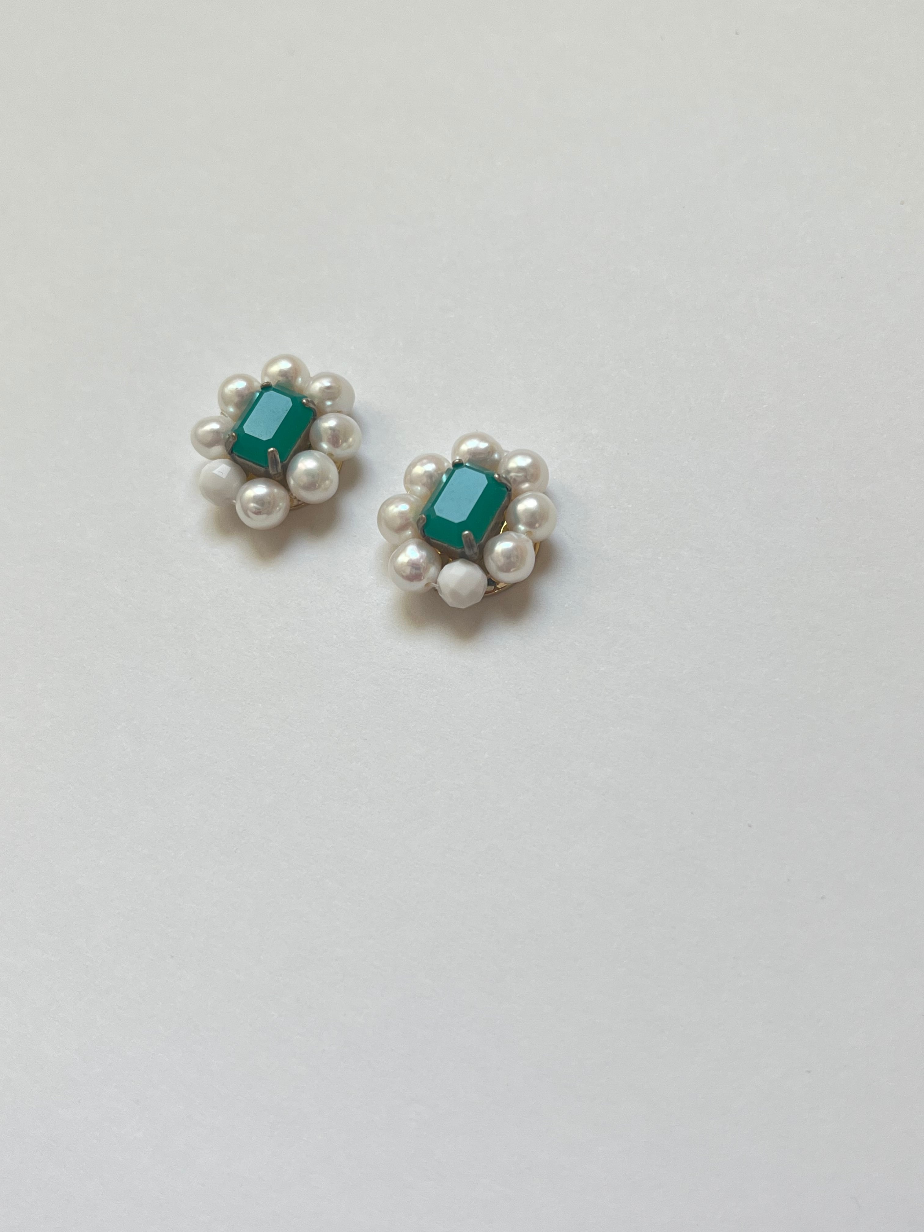 ヴィンテージのスワロフスキーのガラスストーンの周りに淡水パールを纏わせて、小さなお花のピアスを作りました。ワンポイントで細かいカットの入ったホワイトオニキスを一粒入れました。お花モチーフですが色と素材使いで大人の方でもさらっと着けていただける甘すぎない仕上がりになっています。