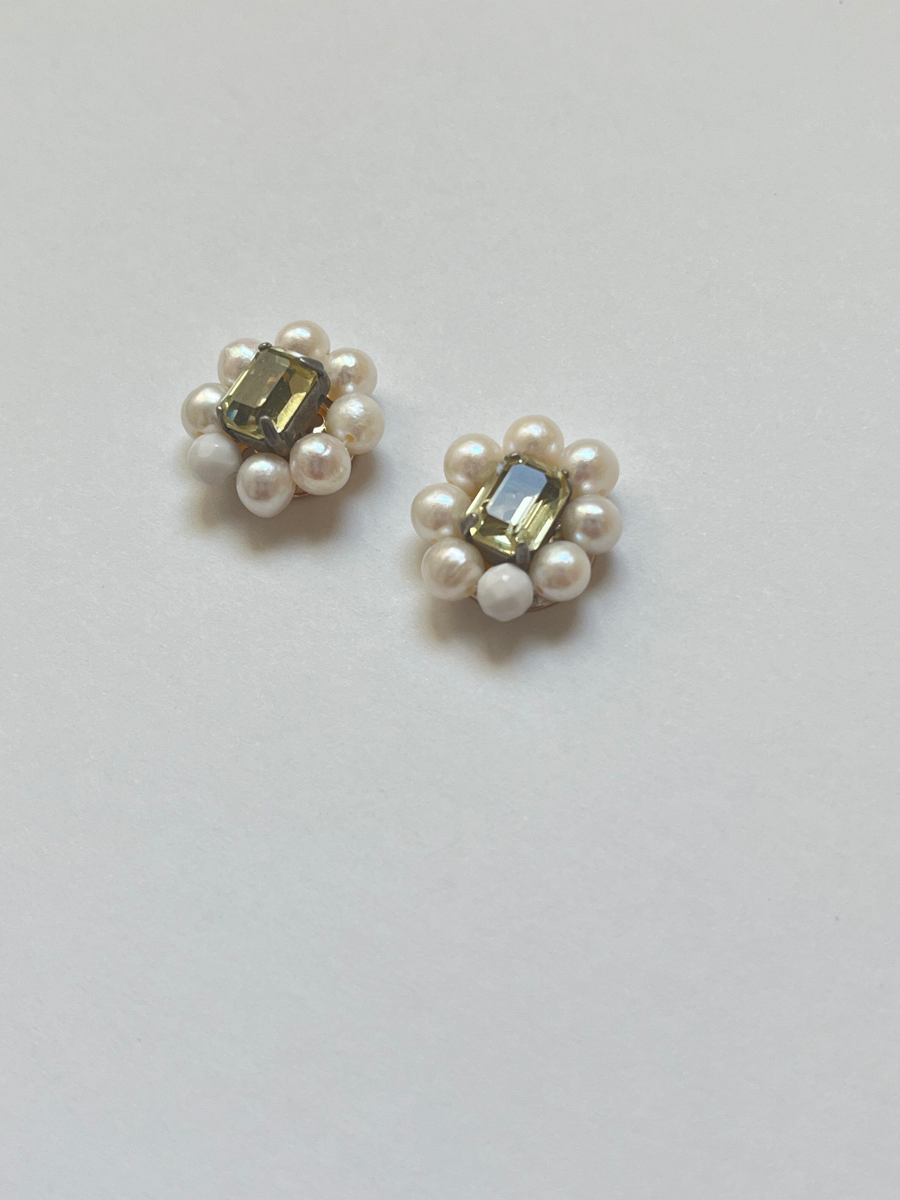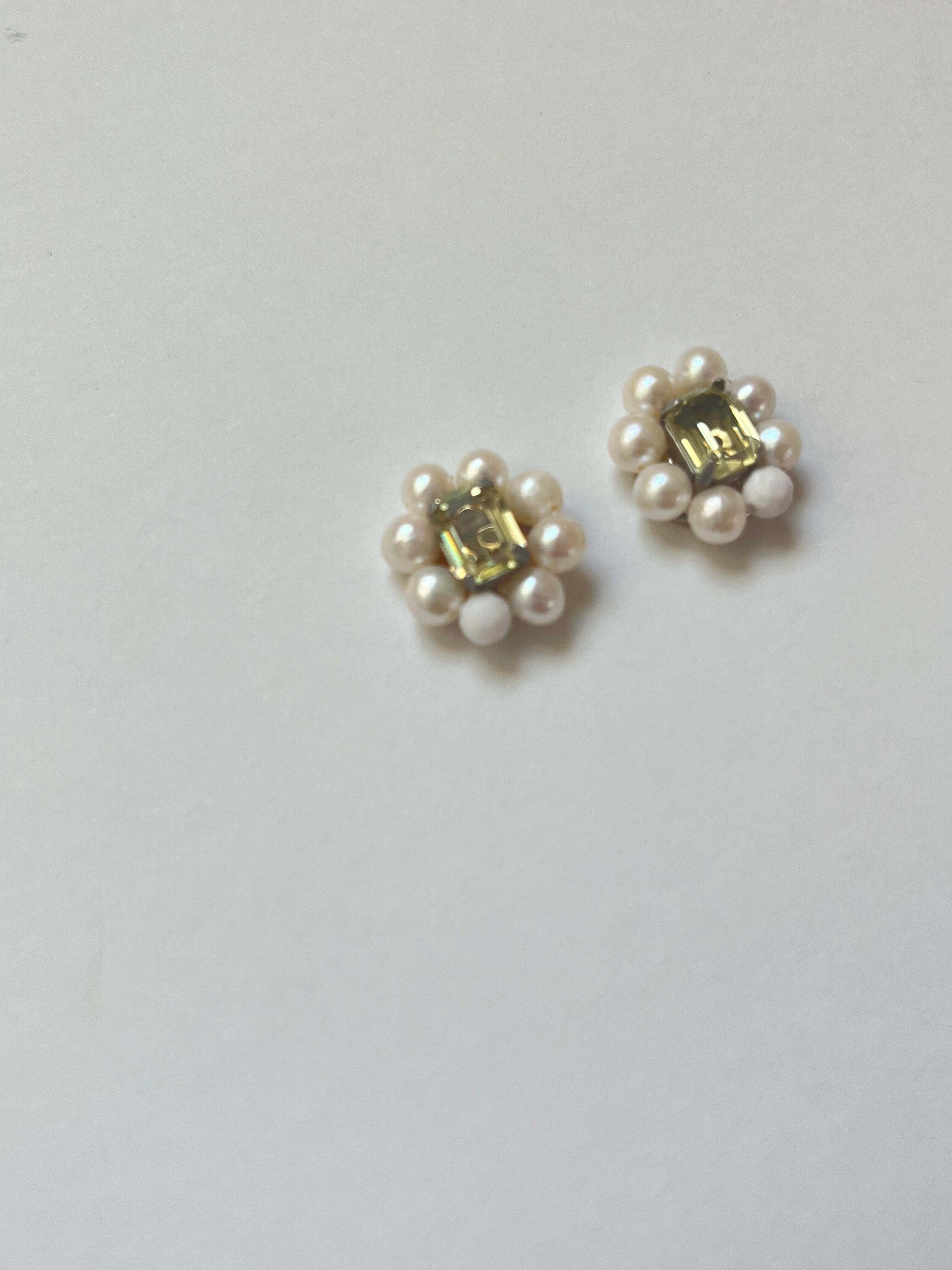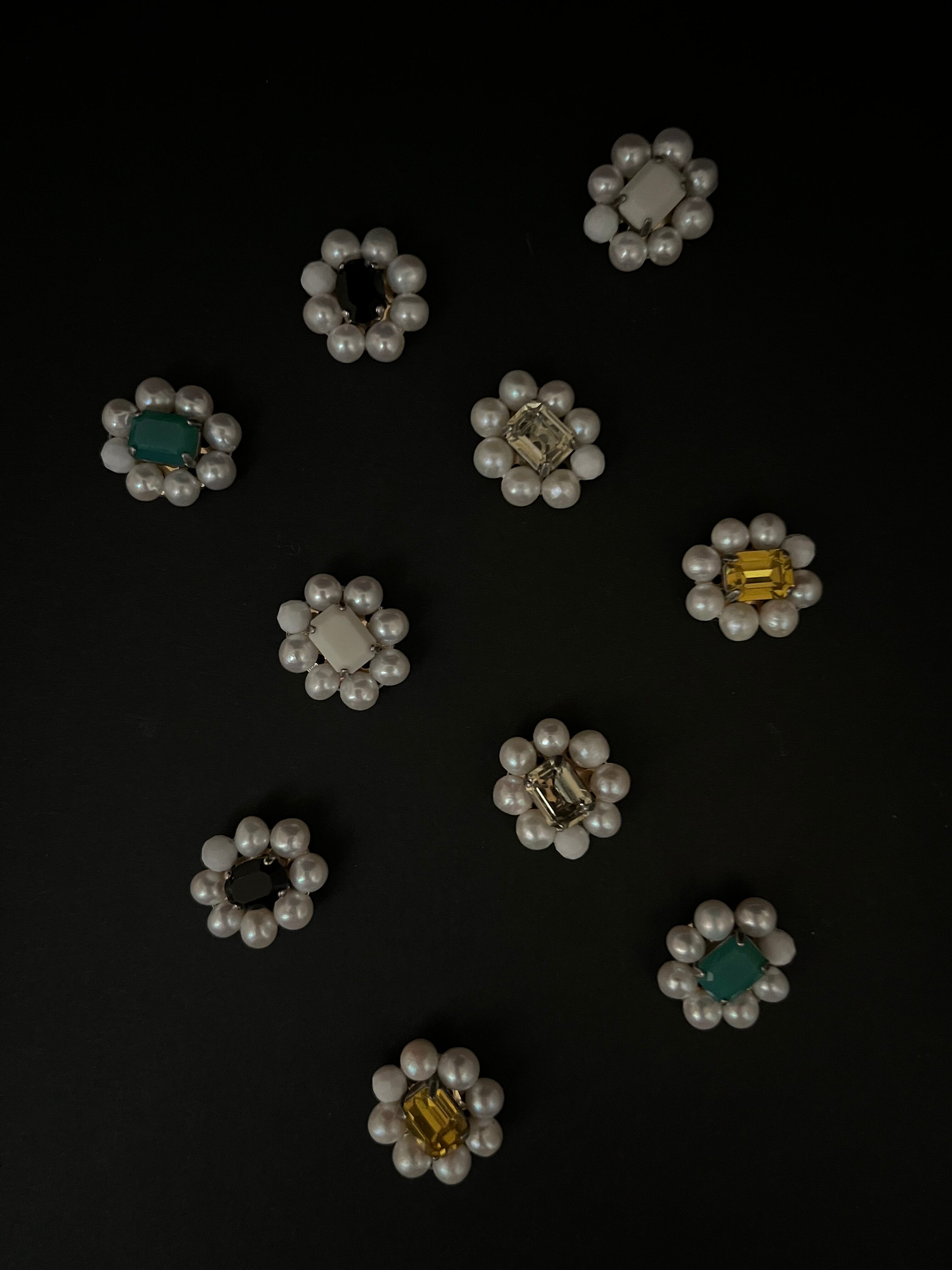 ヴィンテージのスワロフスキーのガラスストーンの周りに淡水パールを纏わせて、小さなお花のピアスを作りました。ワンポイントで細かいカットの入ったホワイトオニキスを一粒入れました。お花モチーフですが色と素材使いで大人の方でもさらっと着けていただける甘すぎない仕上がりになっています。