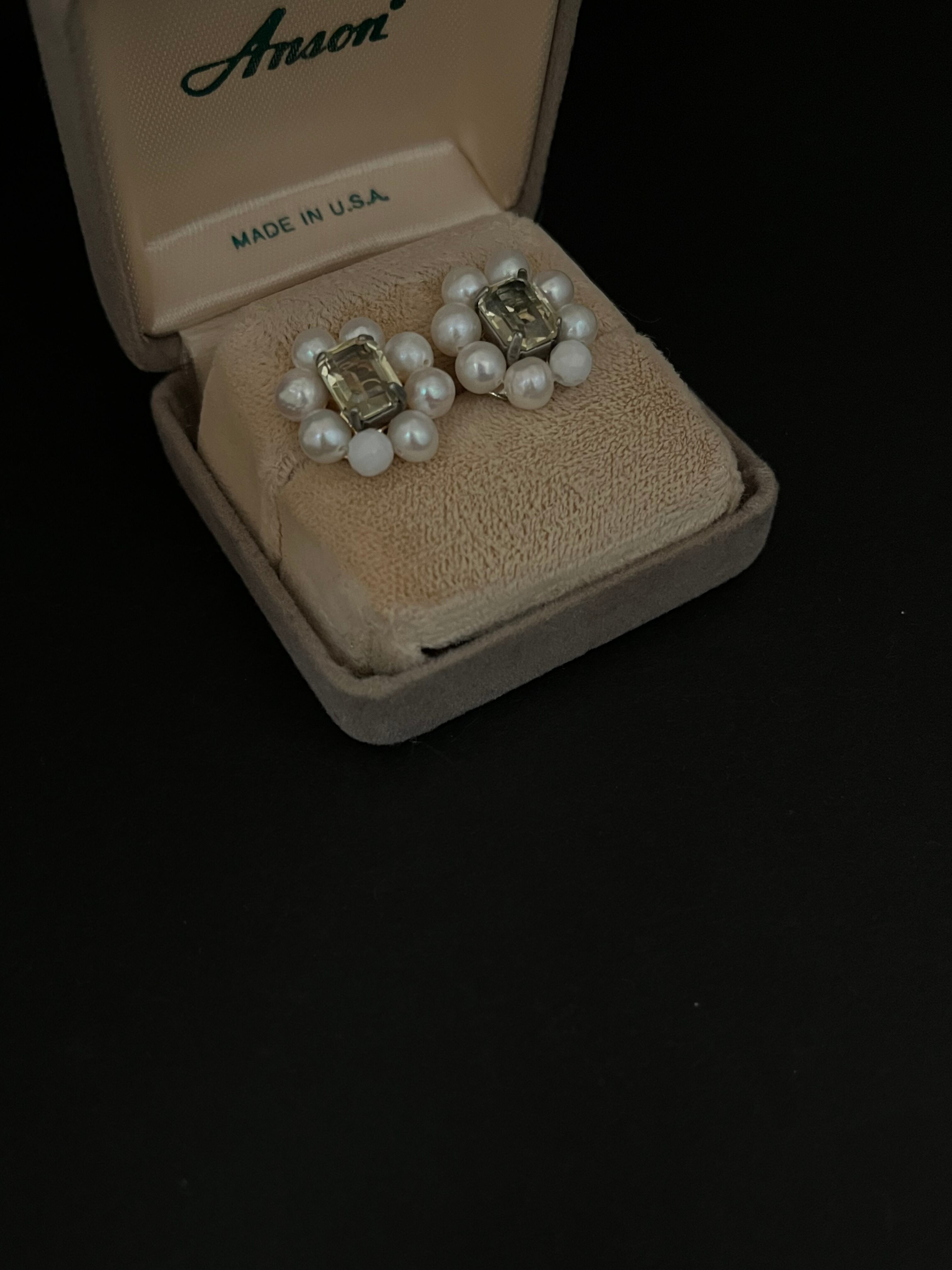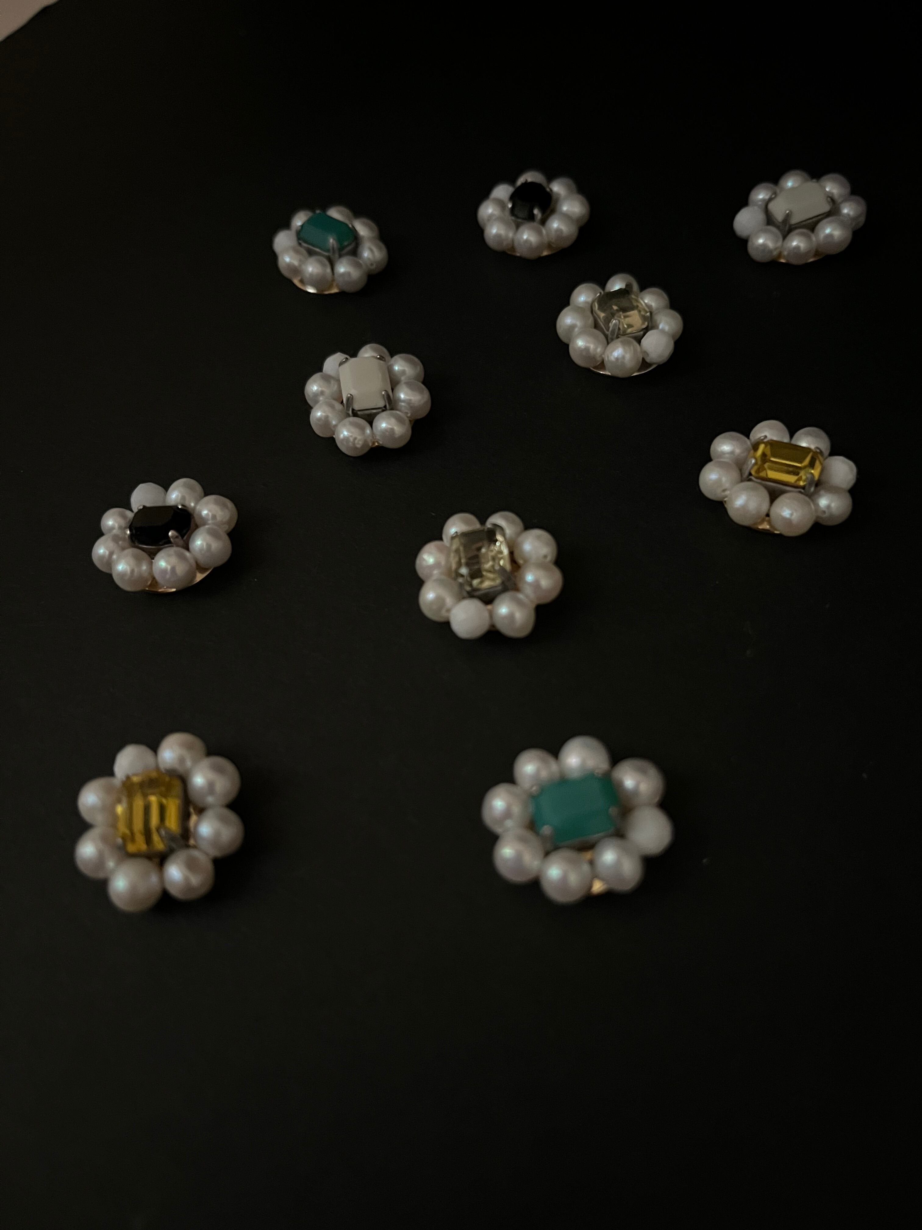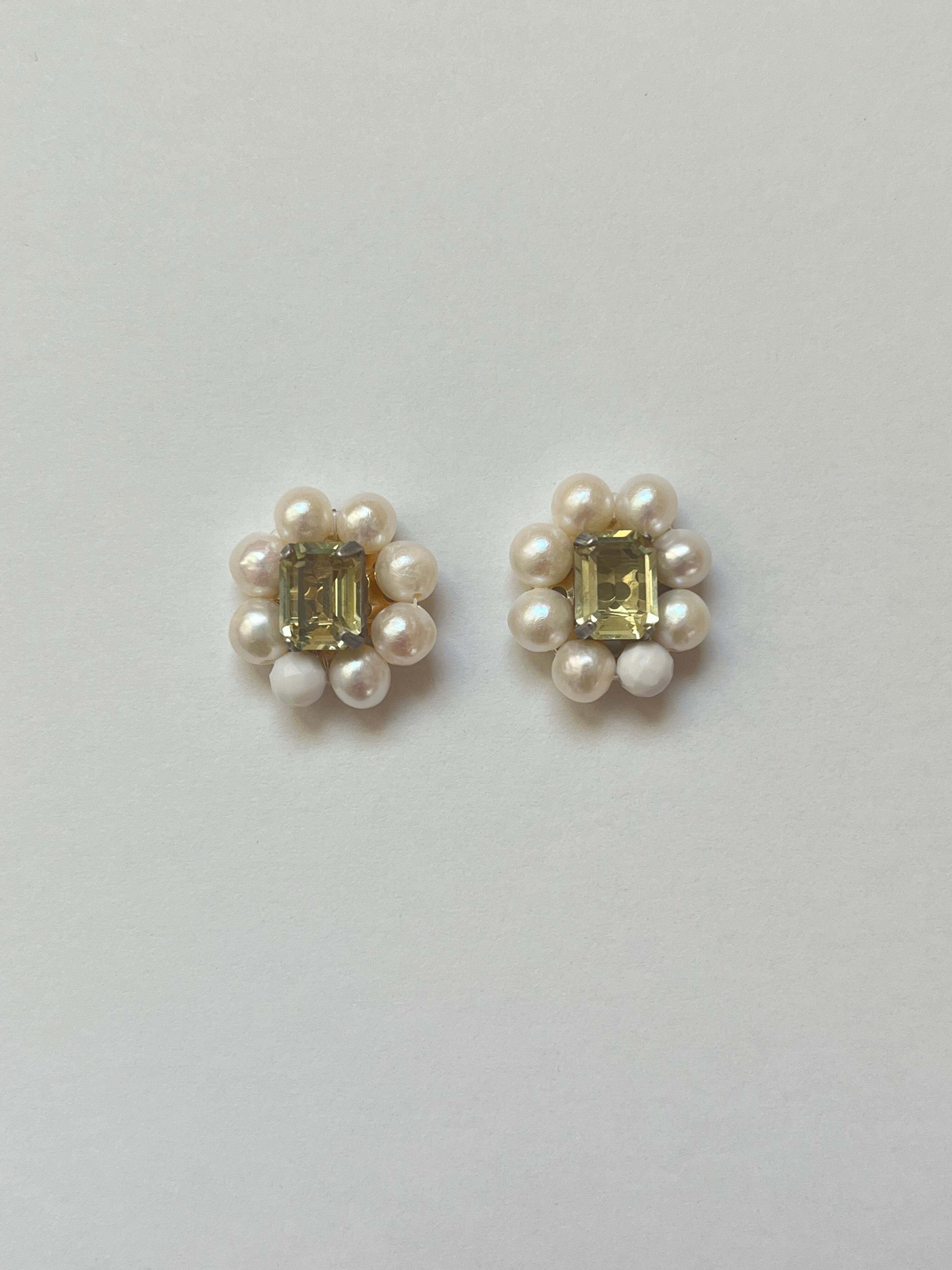 ヴィンテージのスワロフスキーのガラスストーンの周りに淡水パールを纏わせて、小さなお花のピアスを作りました。ワンポイントで細かいカットの入ったホワイトオニキスを一粒入れました。お花モチーフですが色と素材使いで大人の方でもさらっと着けていただける甘すぎない仕上がりになっています。