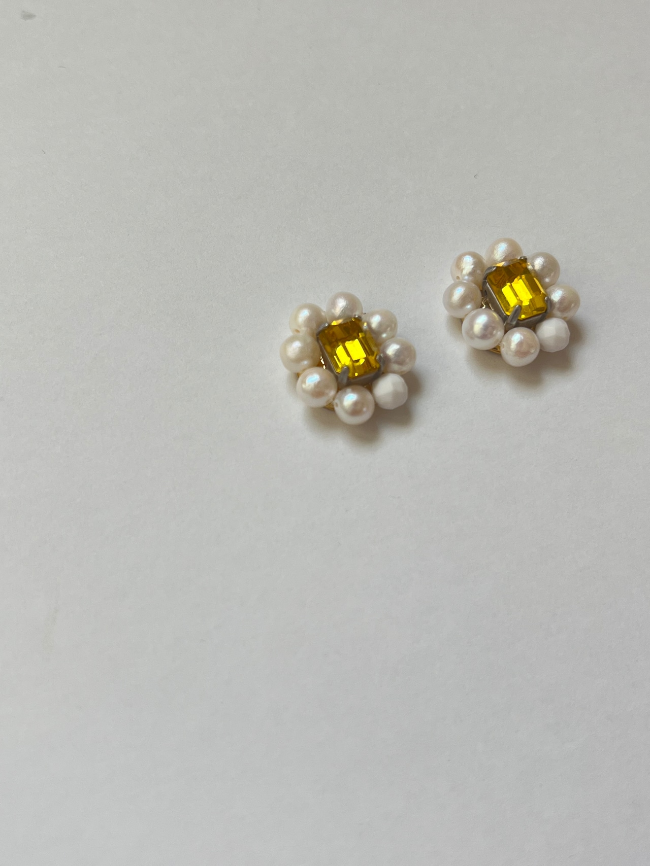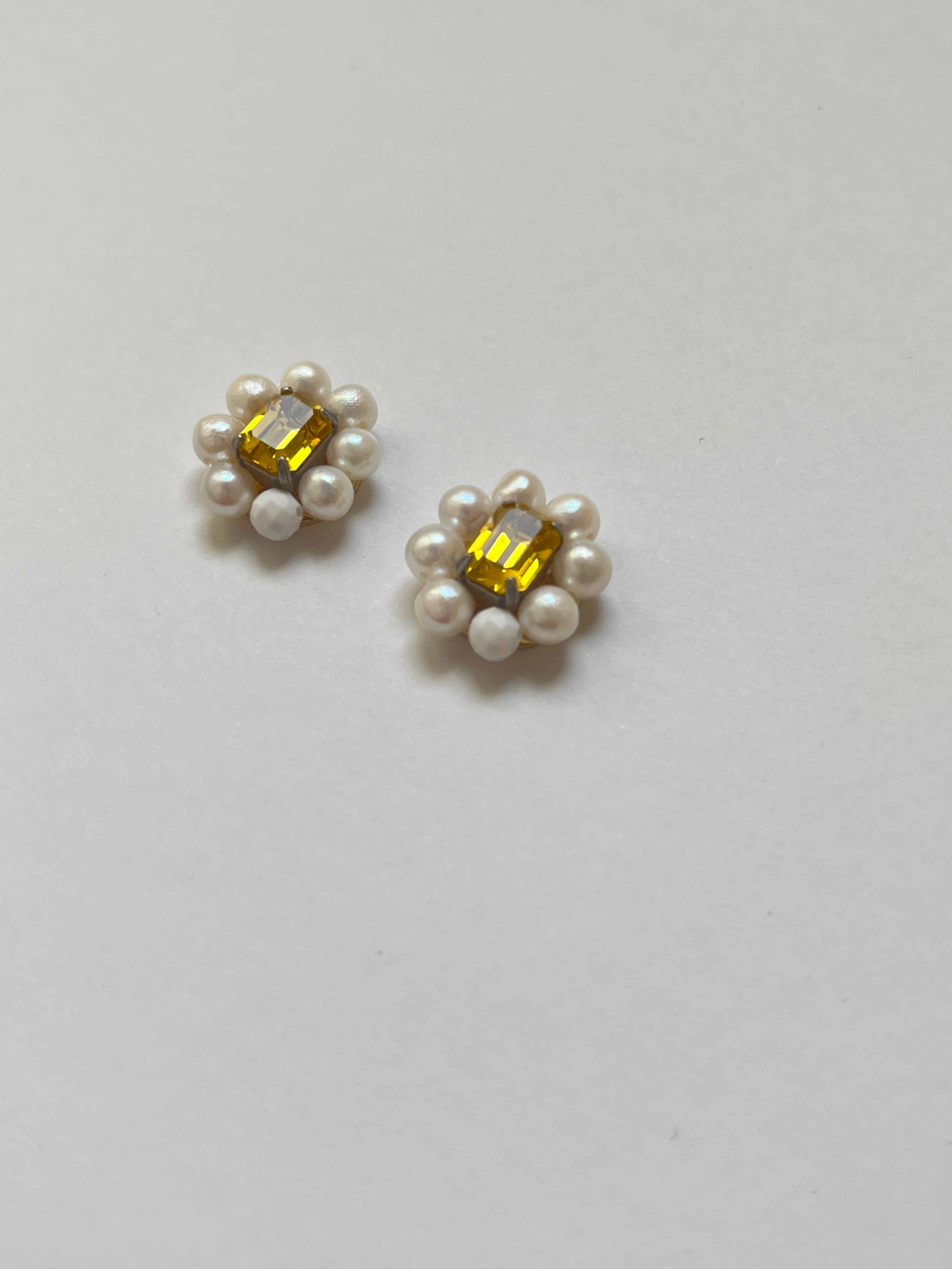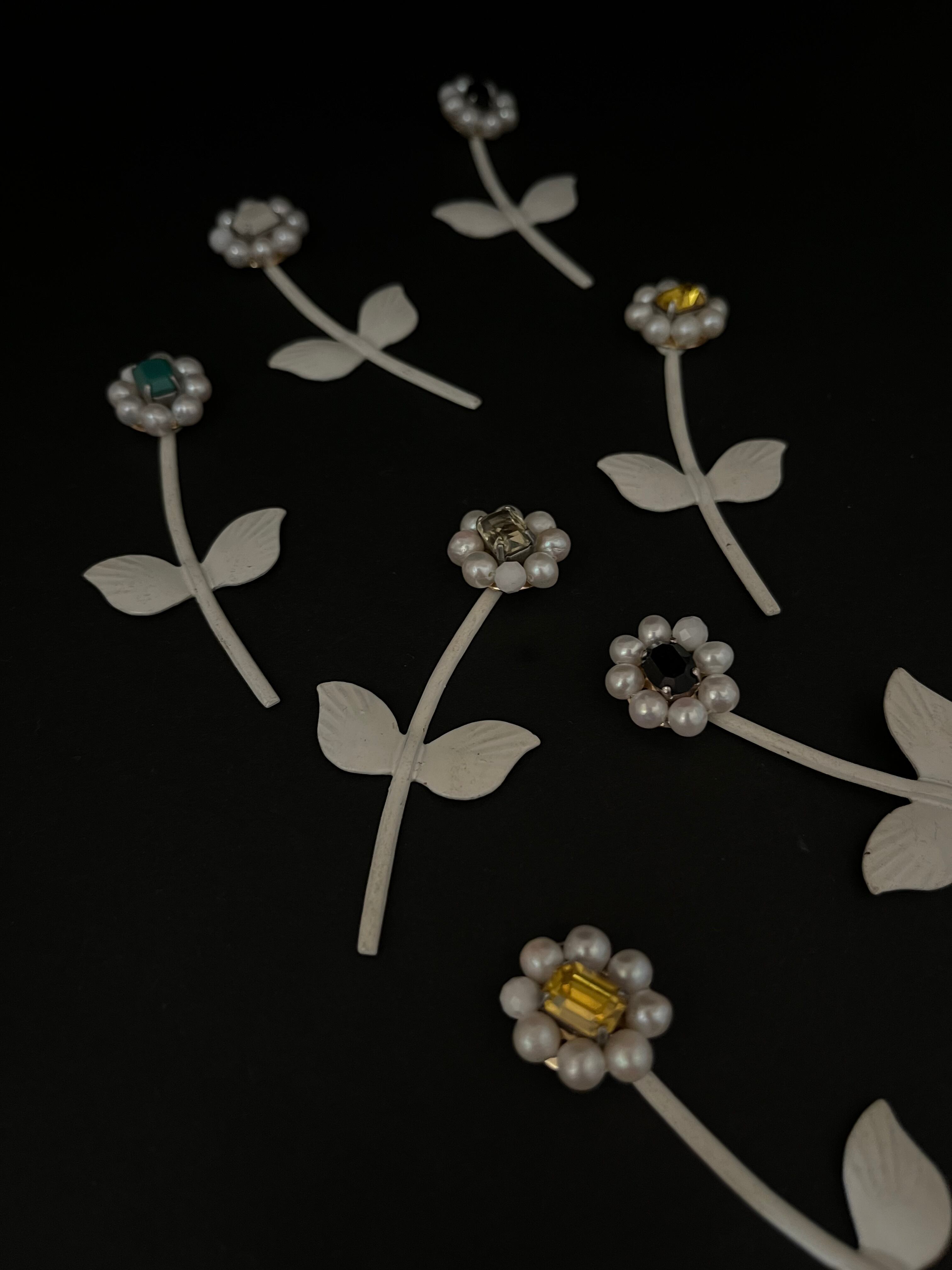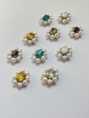 ヴィンテージのスワロフスキーのガラスストーンの周りに淡水パールを纏わせて、小さなお花のピアスを作りました。ワンポイントで細かいカットの入ったホワイトオニキスを一粒入れました。お花モチーフですが色と素材使いで大人の方でもさらっと着けていただける甘すぎない仕上がりになっています。