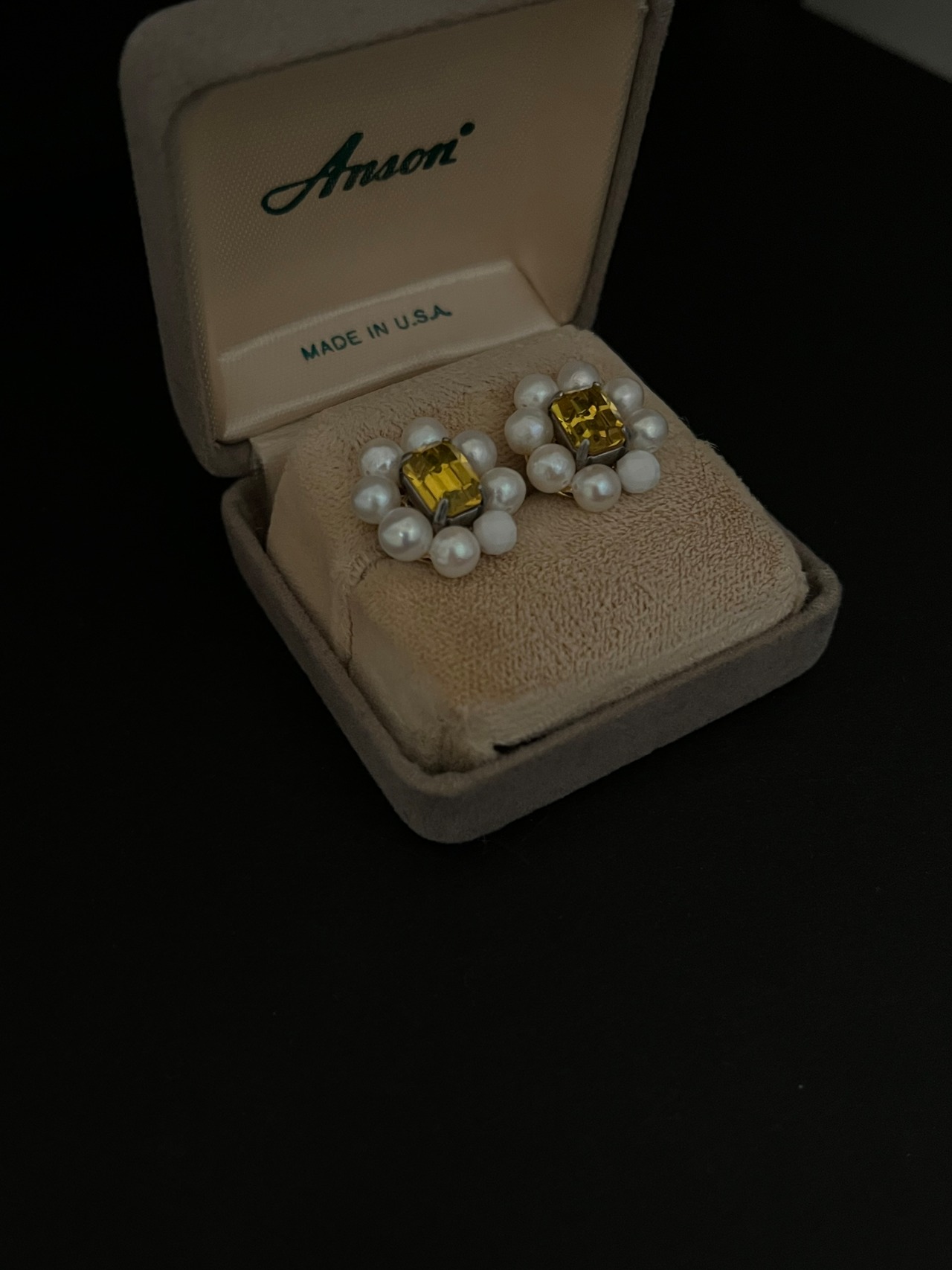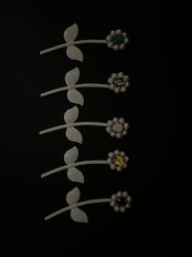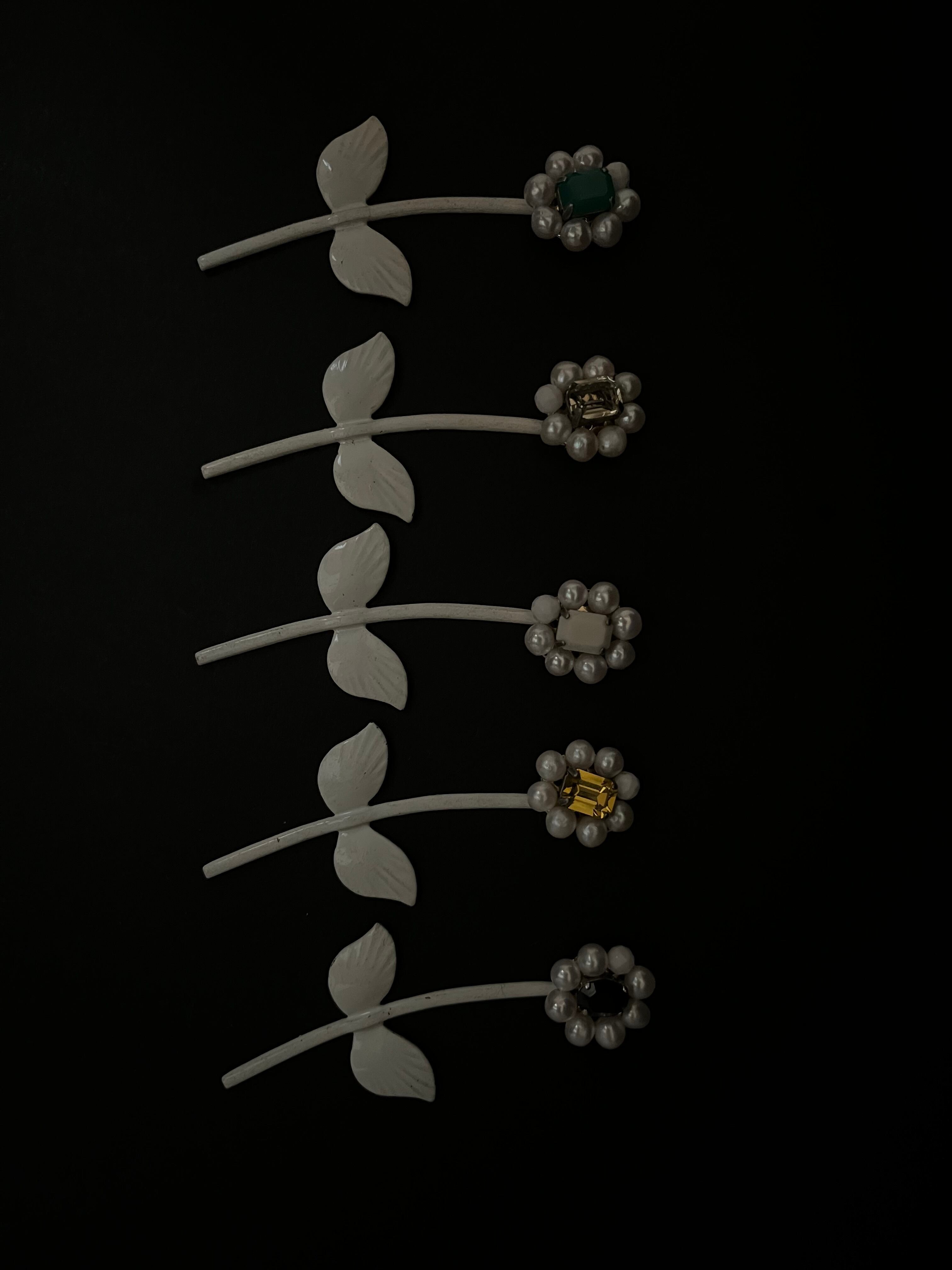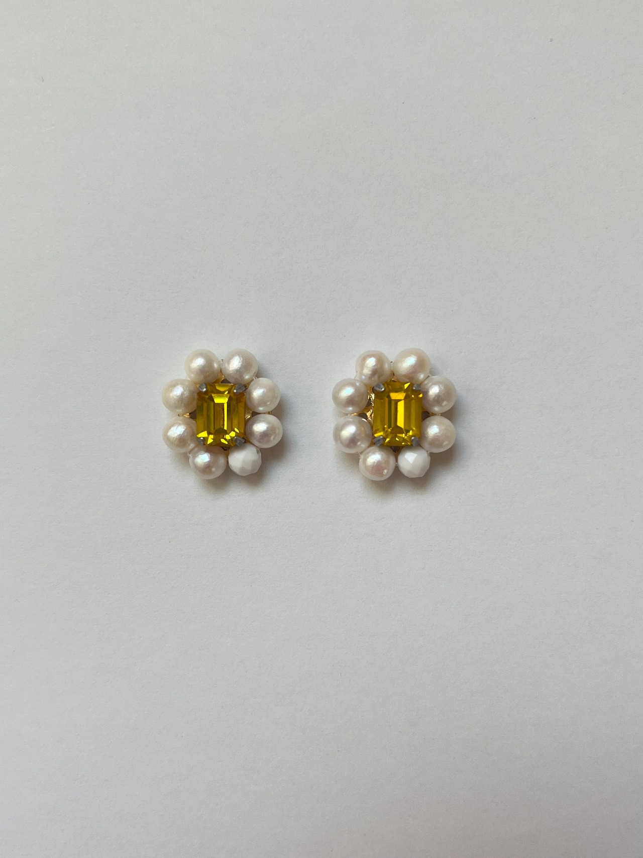 ヴィンテージのスワロフスキーのガラスストーンの周りに淡水パールを纏わせて、小さなお花のピアスを作りました。ワンポイントで細かいカットの入ったホワイトオニキスを一粒入れました。お花モチーフですが色と素材使いで大人の方でもさらっと着けていただける甘すぎない仕上がりになっています。