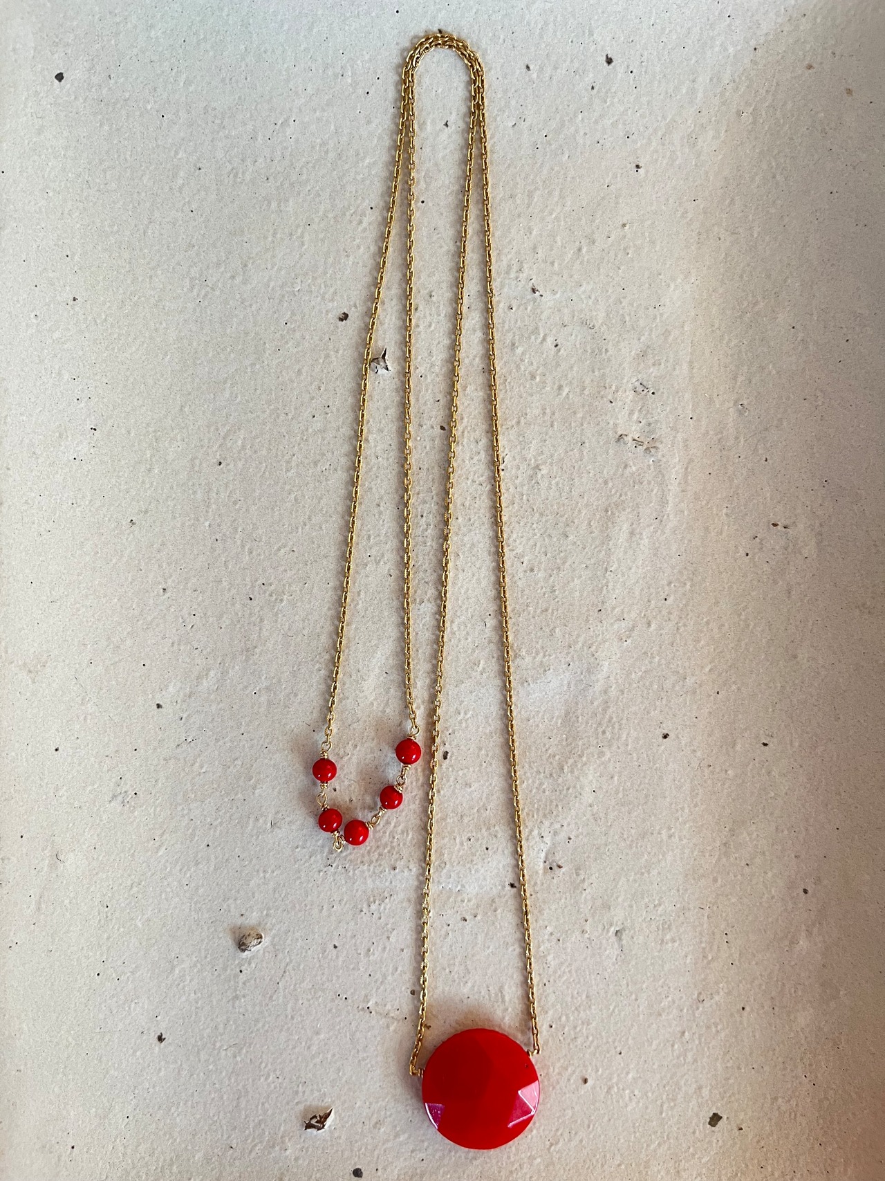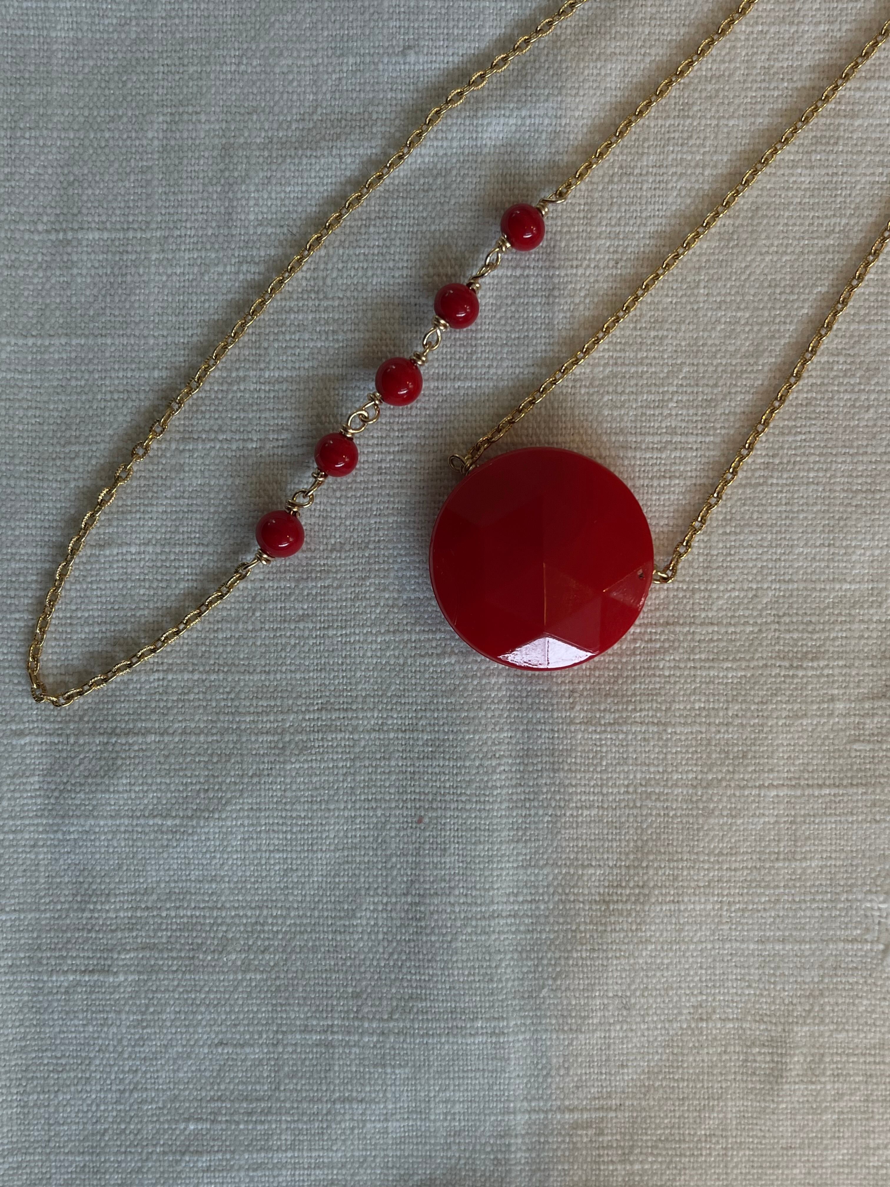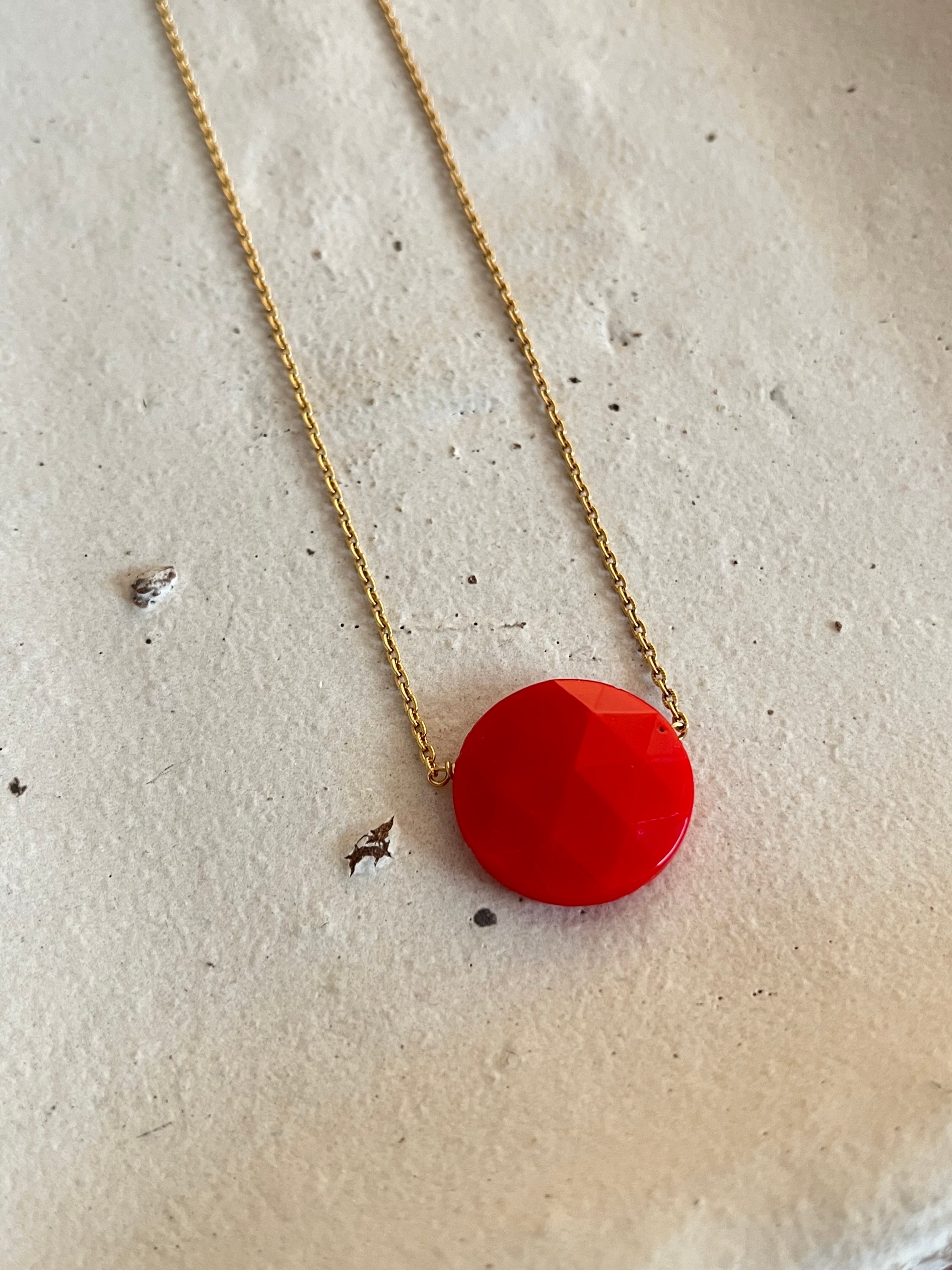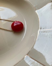 真っ赤なお月さまのような2㎝ほどのアンティークガラスパーツをメインにシンプルに14kgf製のチェーンやドイツ製の丸玉ビーズを合わせてシンプルなネックレスに。