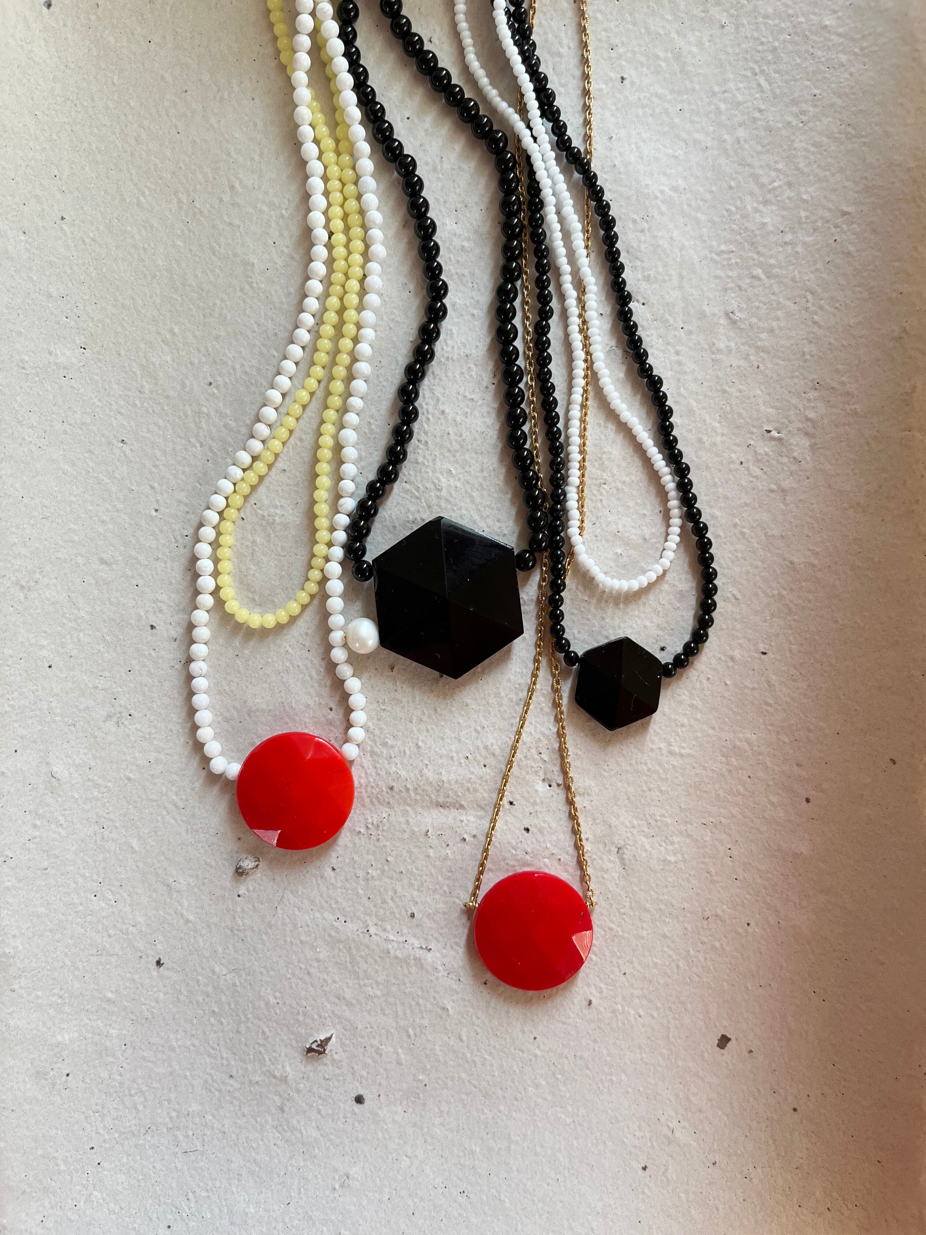 2wayにするか制作途中でとても迷いましたが、1連のみで使えるようにしたので、潔く留め具はあえて付けませんでした。首の後ろにはヴィンテージの真っ赤なビーズを5粒並べました。