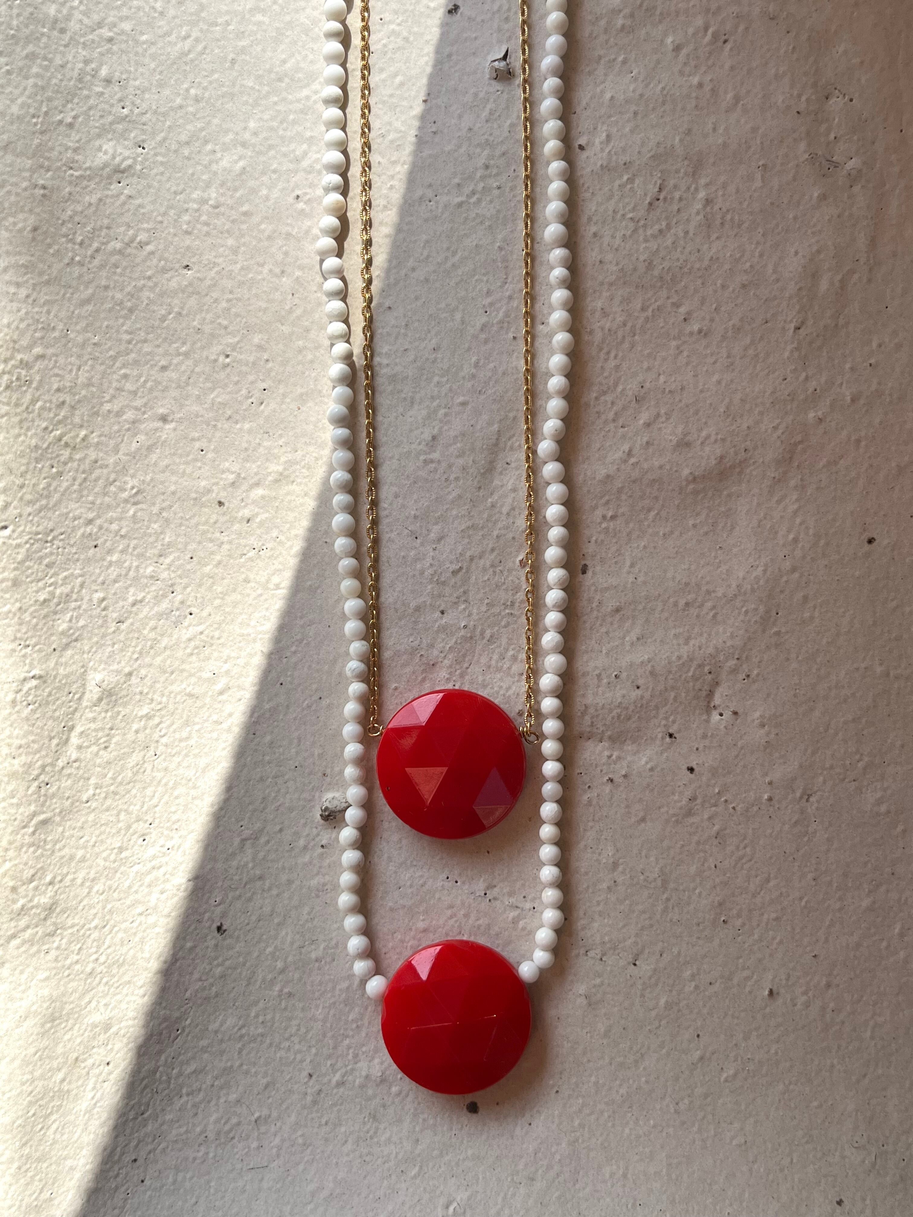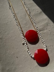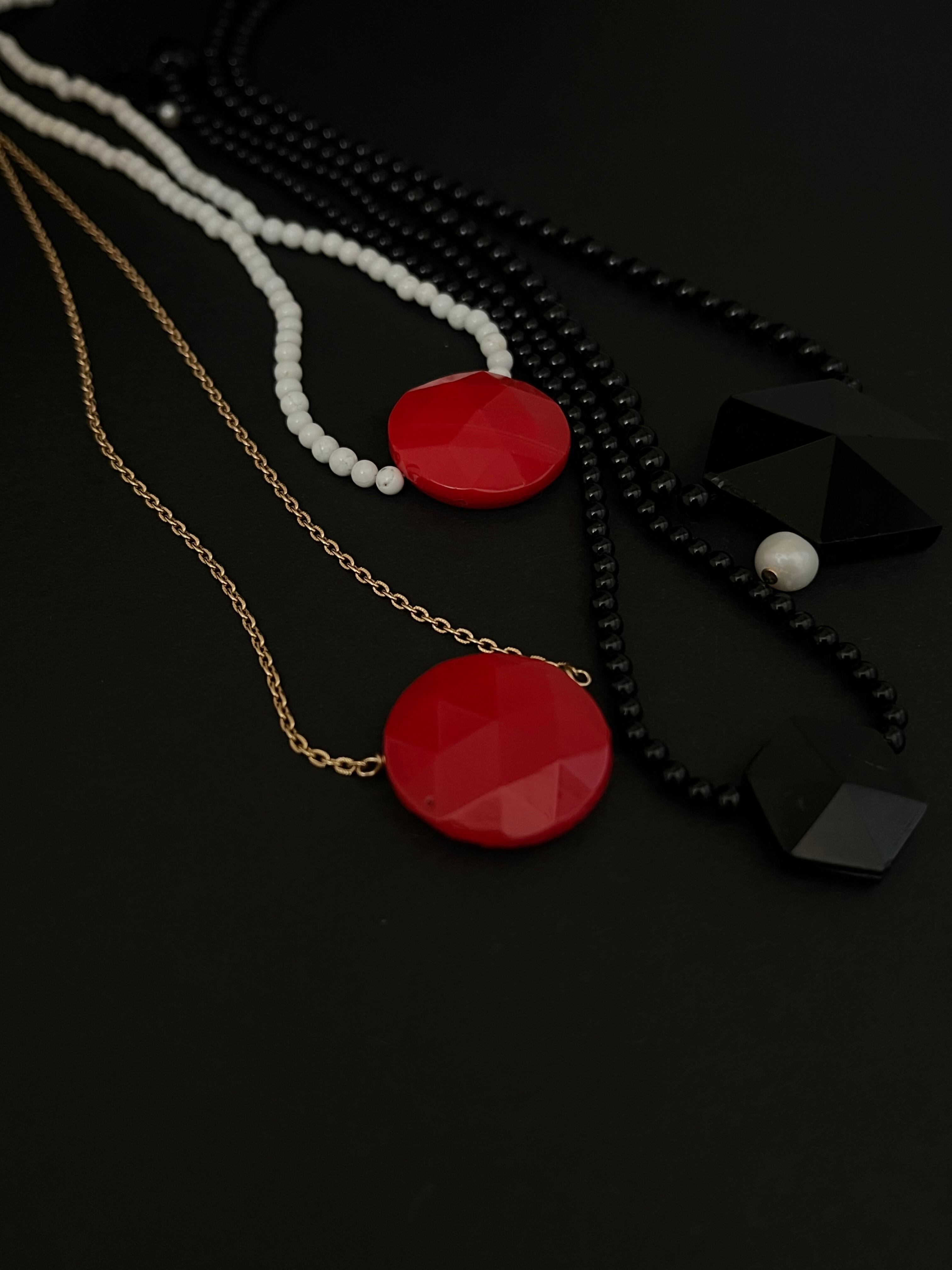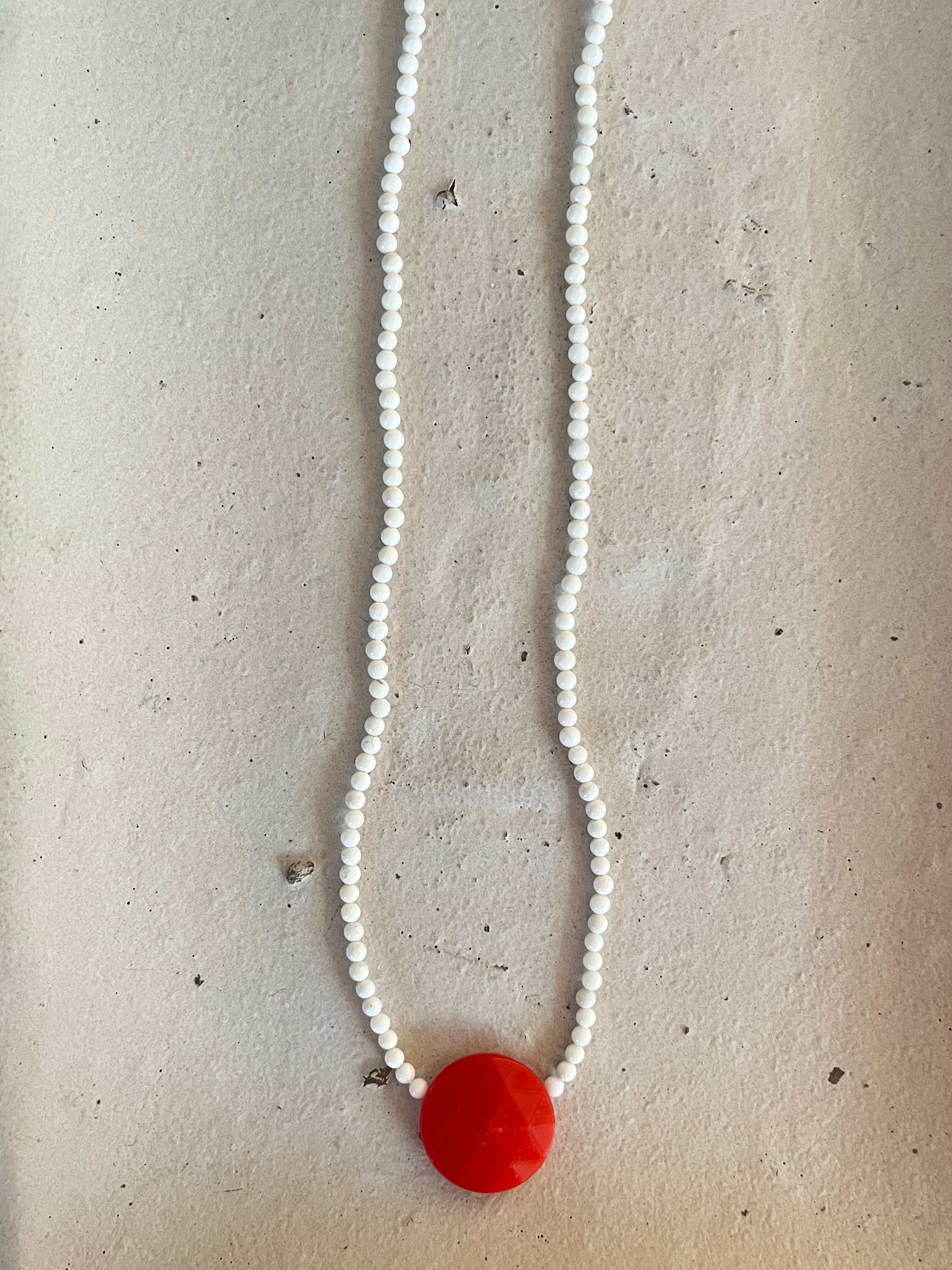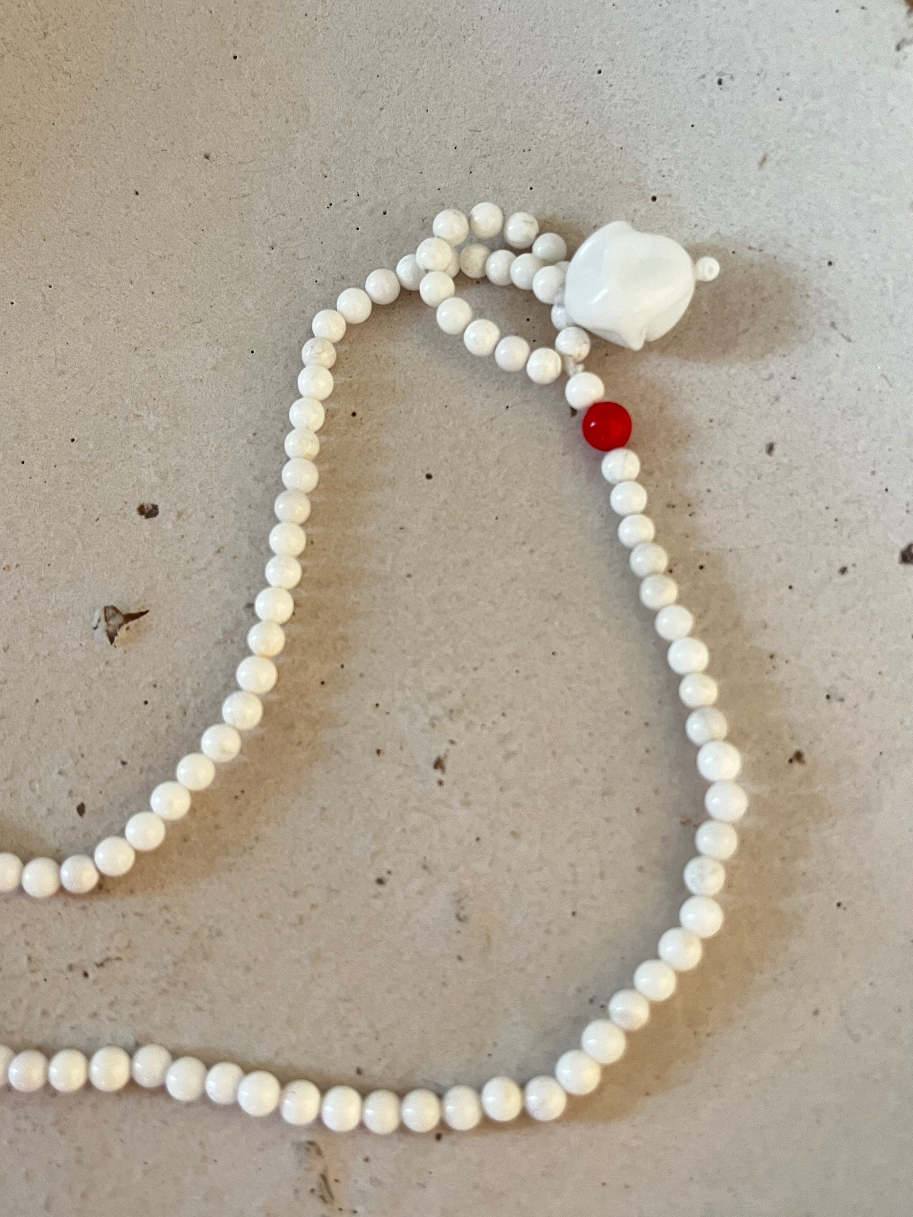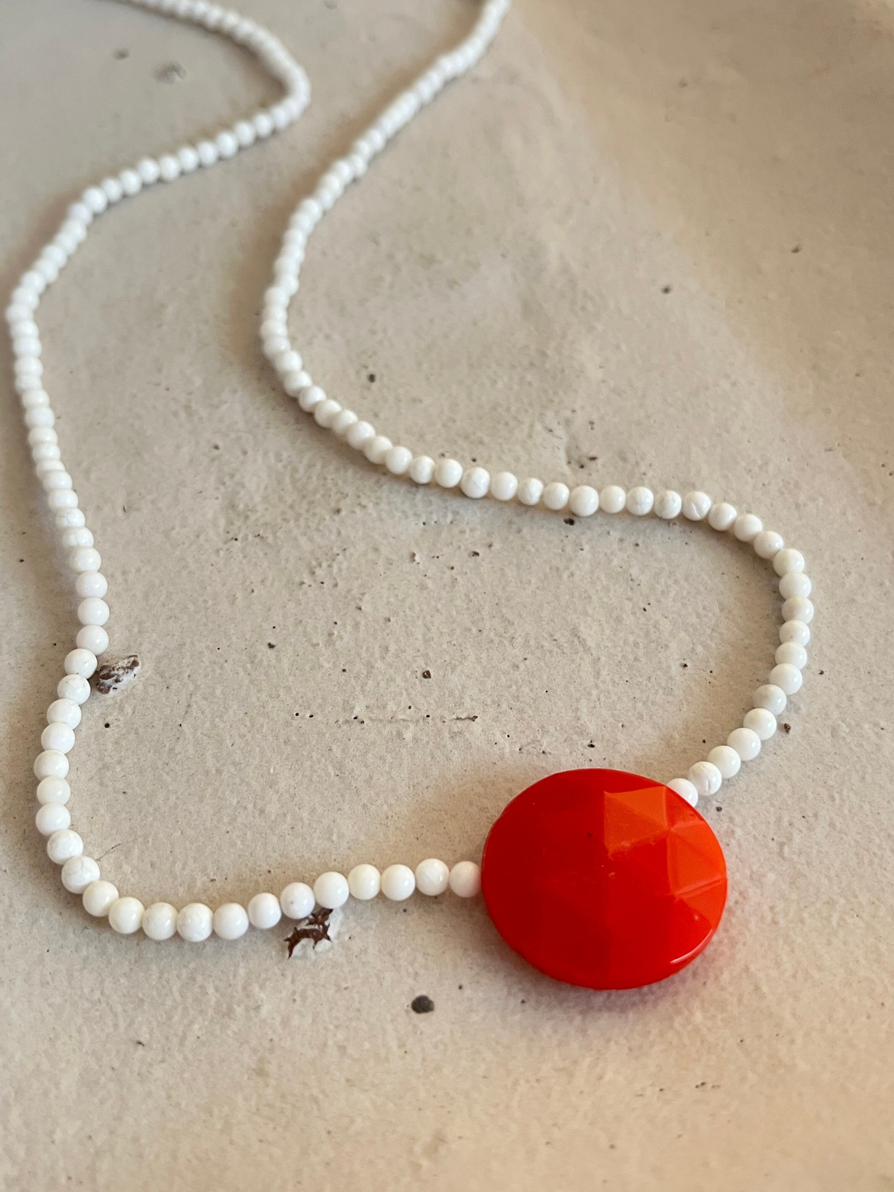 真っ赤なお月さまのような2㎝ほどのアンティークガラスパーツをメインにホワイトオニキスと組み合わせてシンプルなネックレスに。