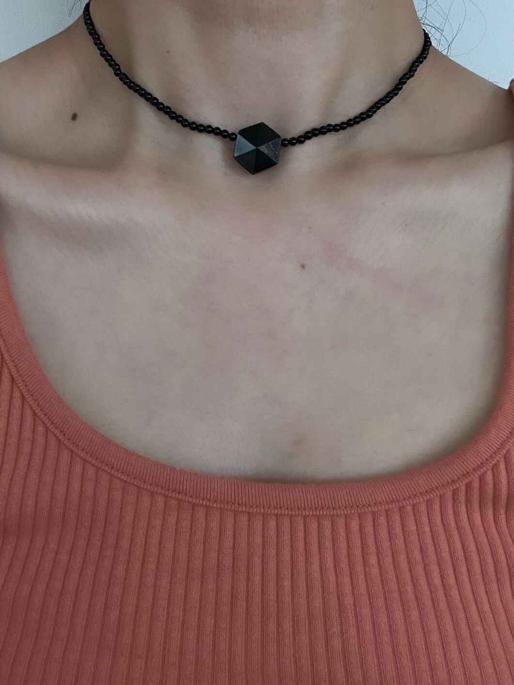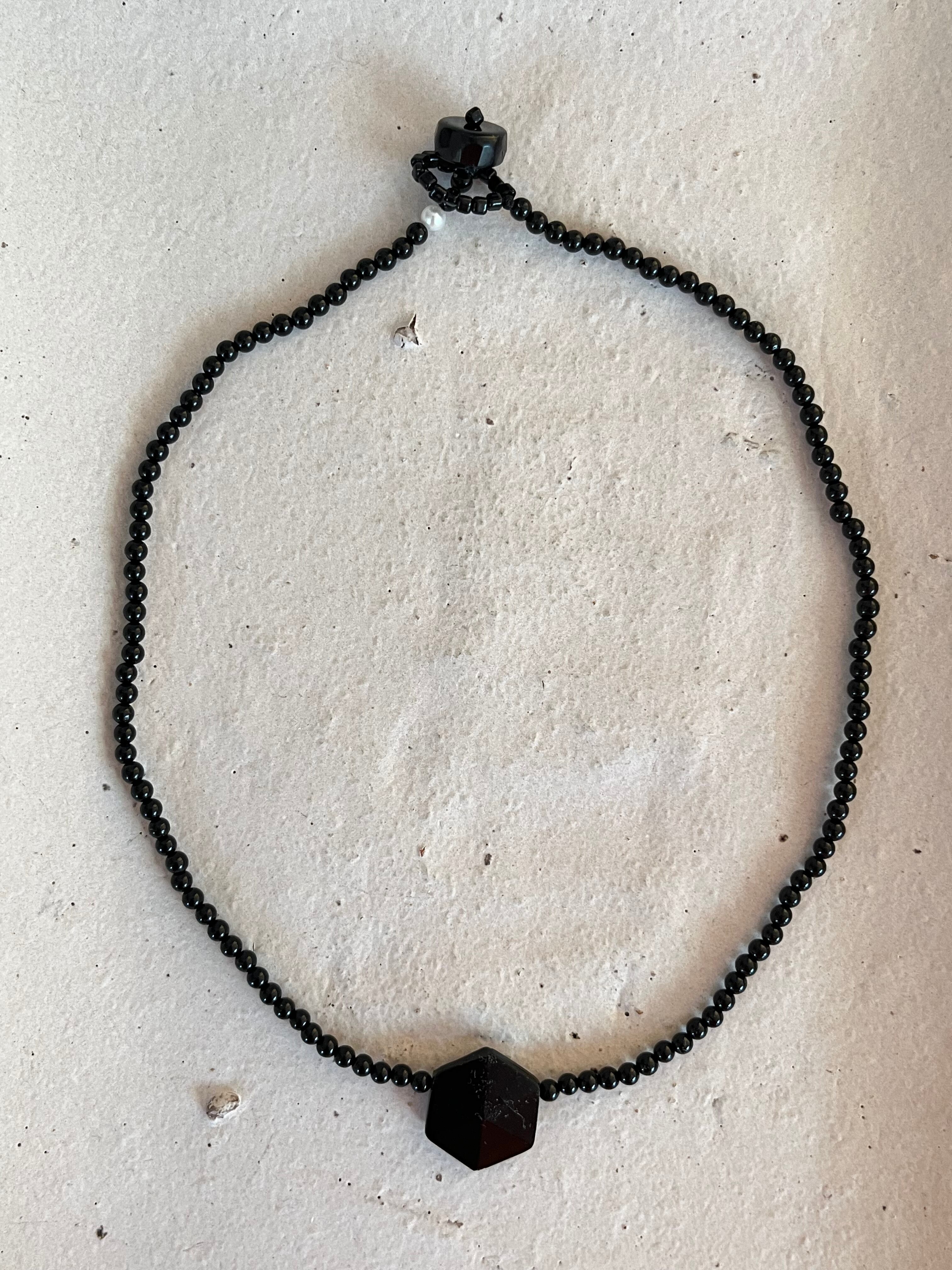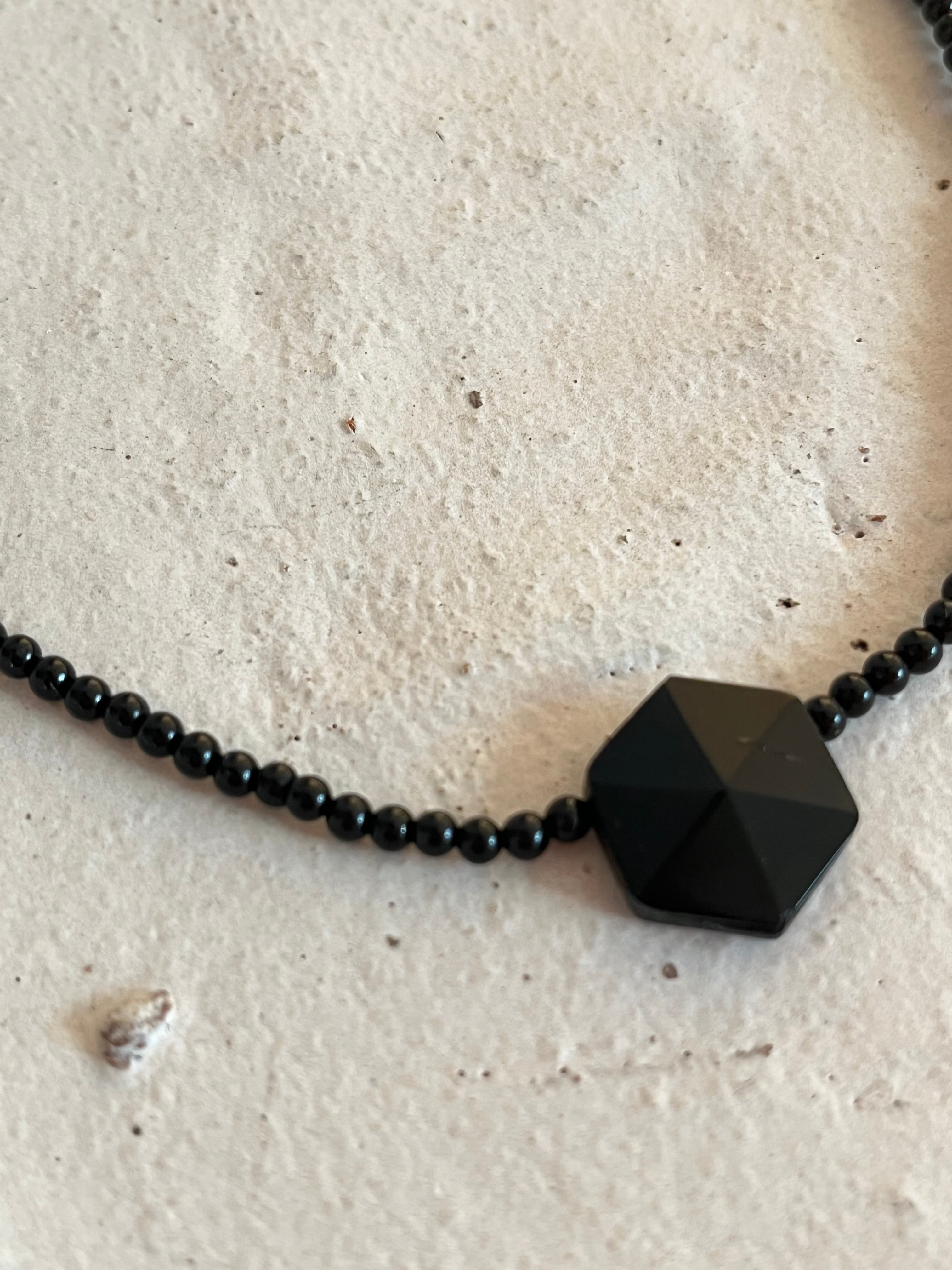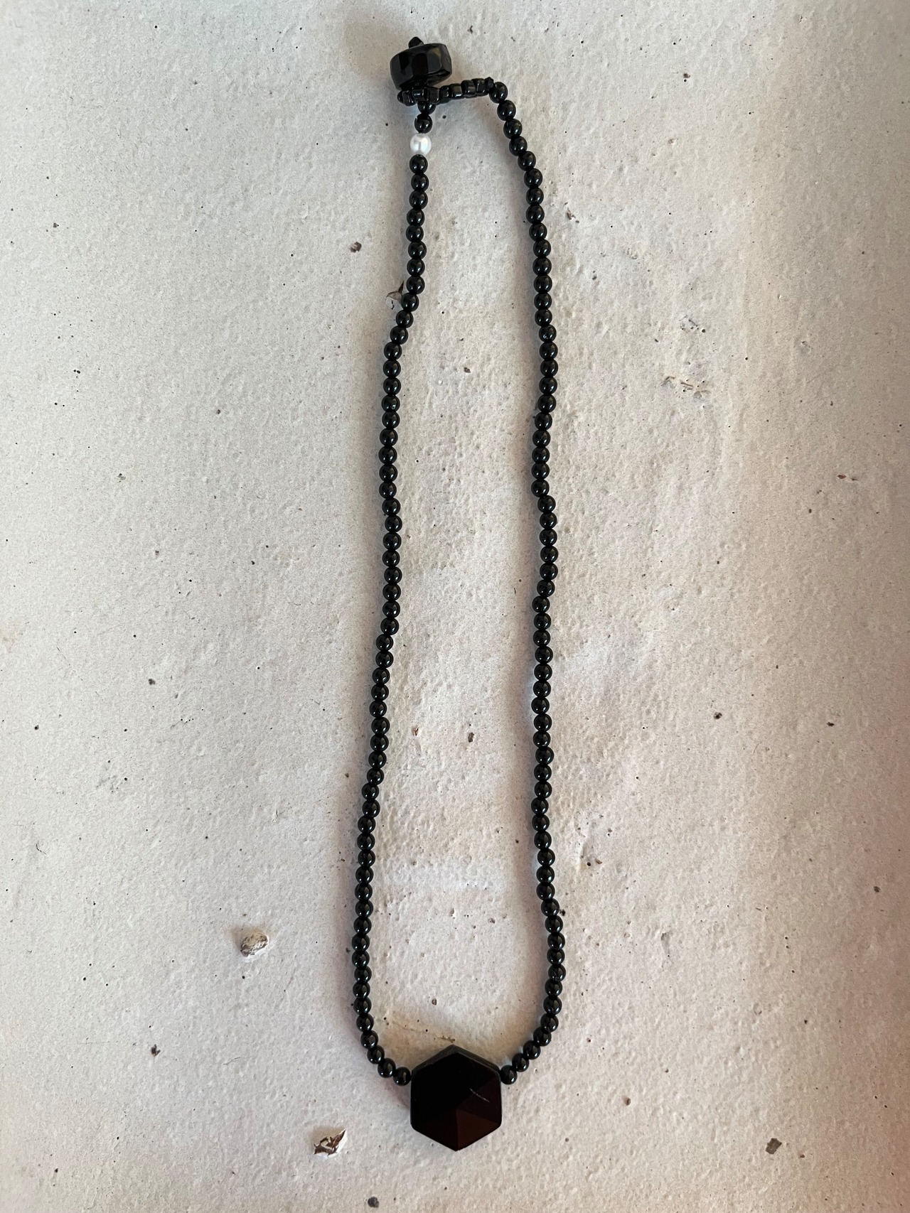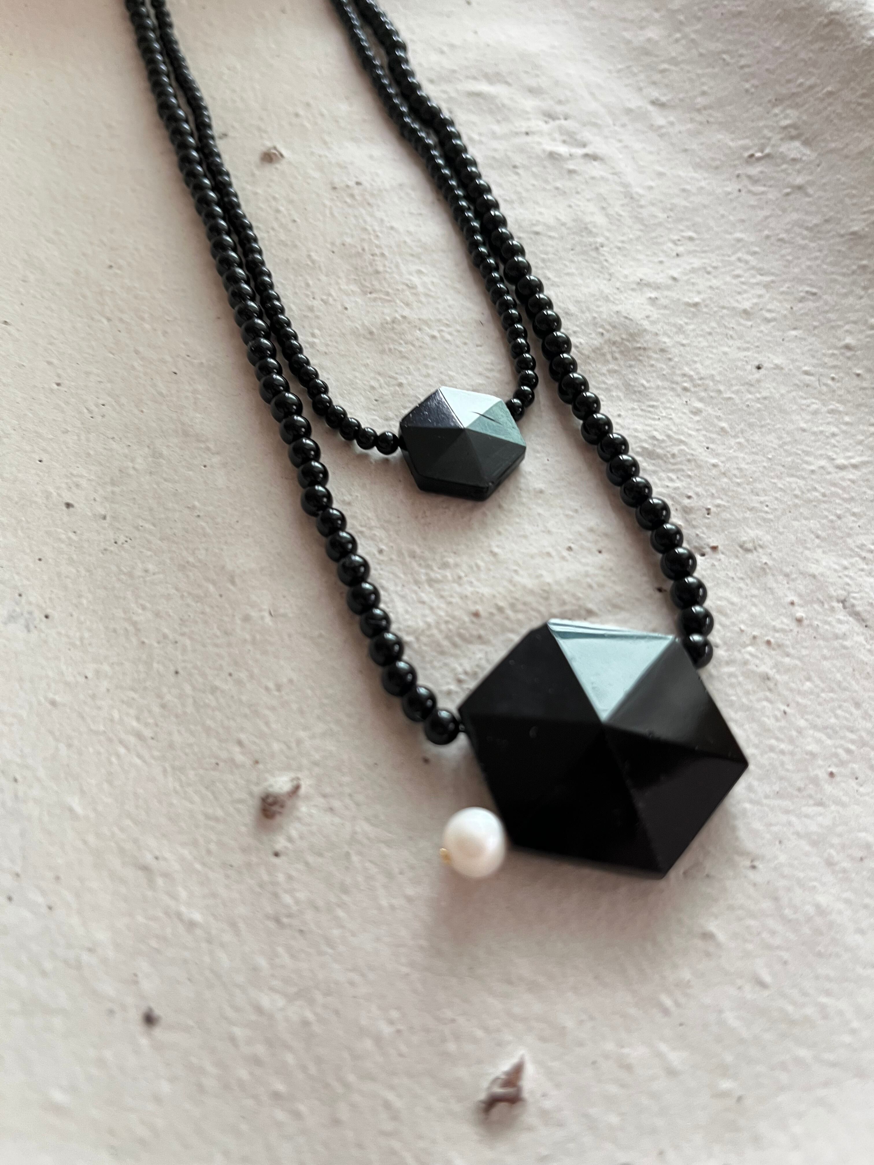 貴重なアンティークのヘキサゴンパーツにオニキスと組み合わせてミニマムに近いシンプルなネックレスに。ミニマムには近づけましたが無機質にはならないように素材やデザインで温かみは残しました。