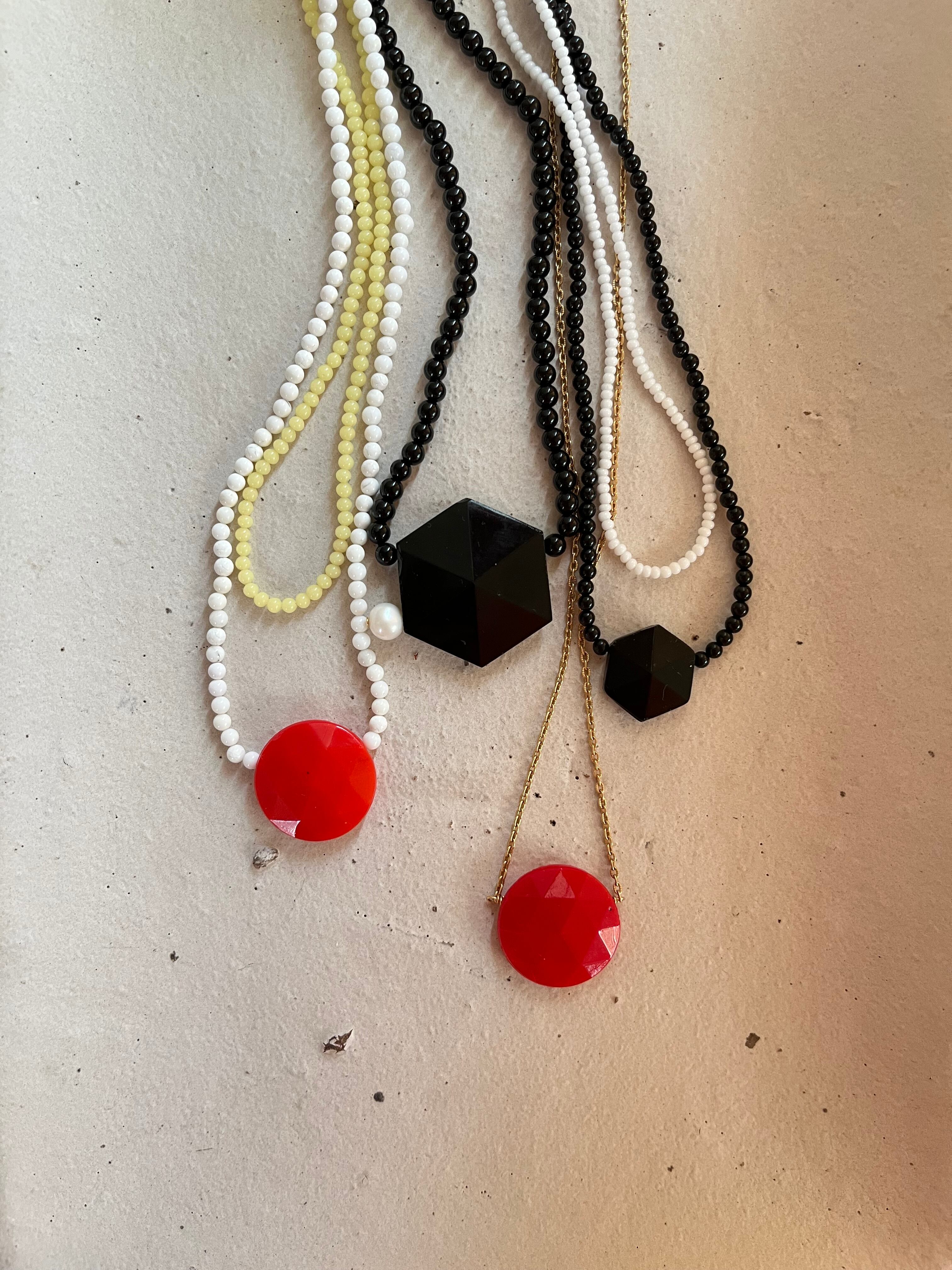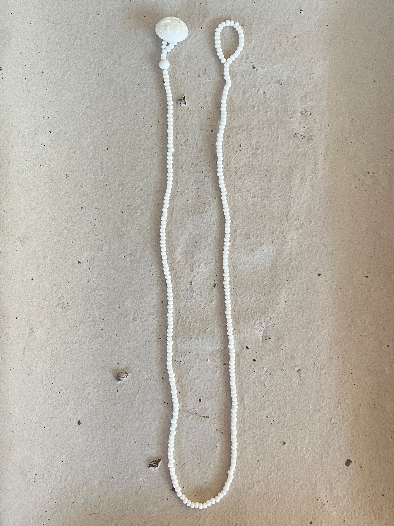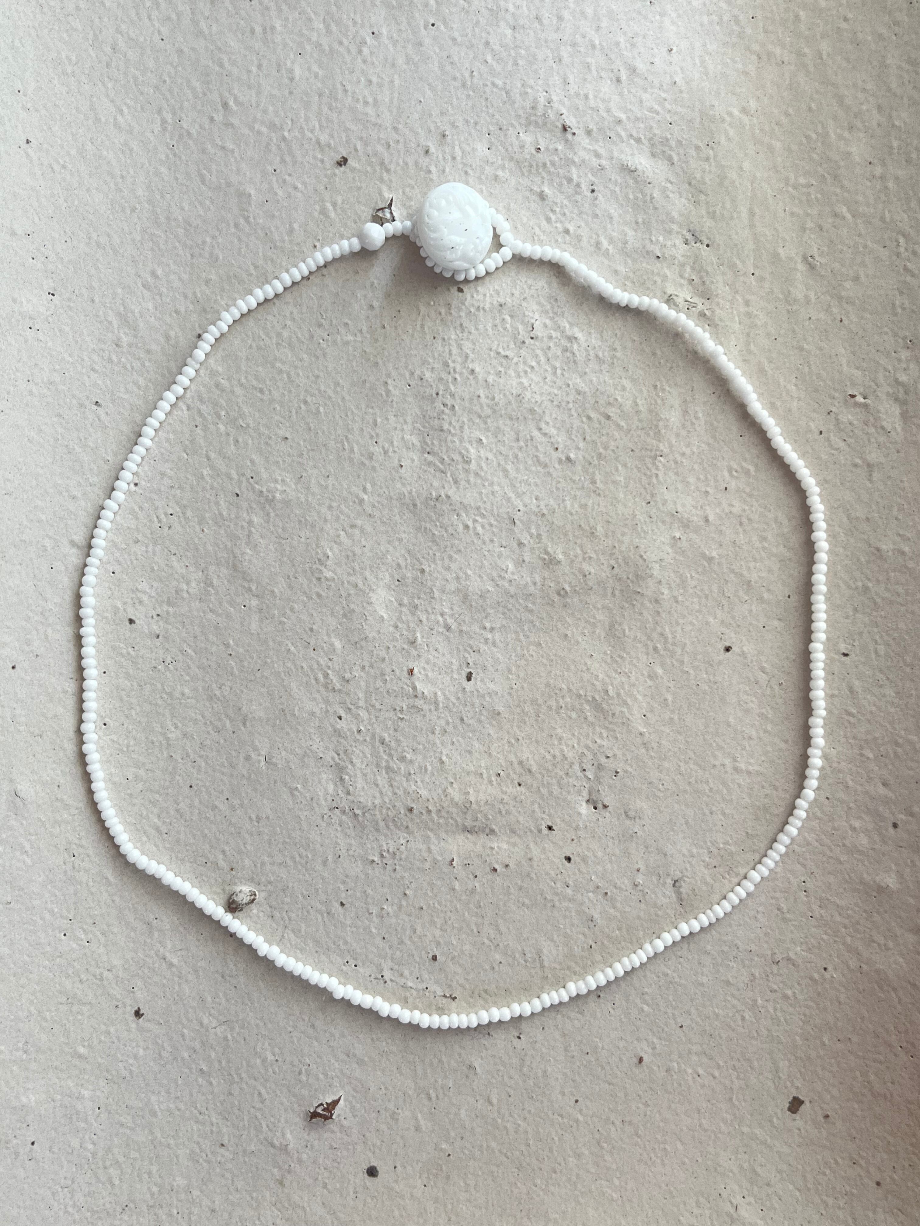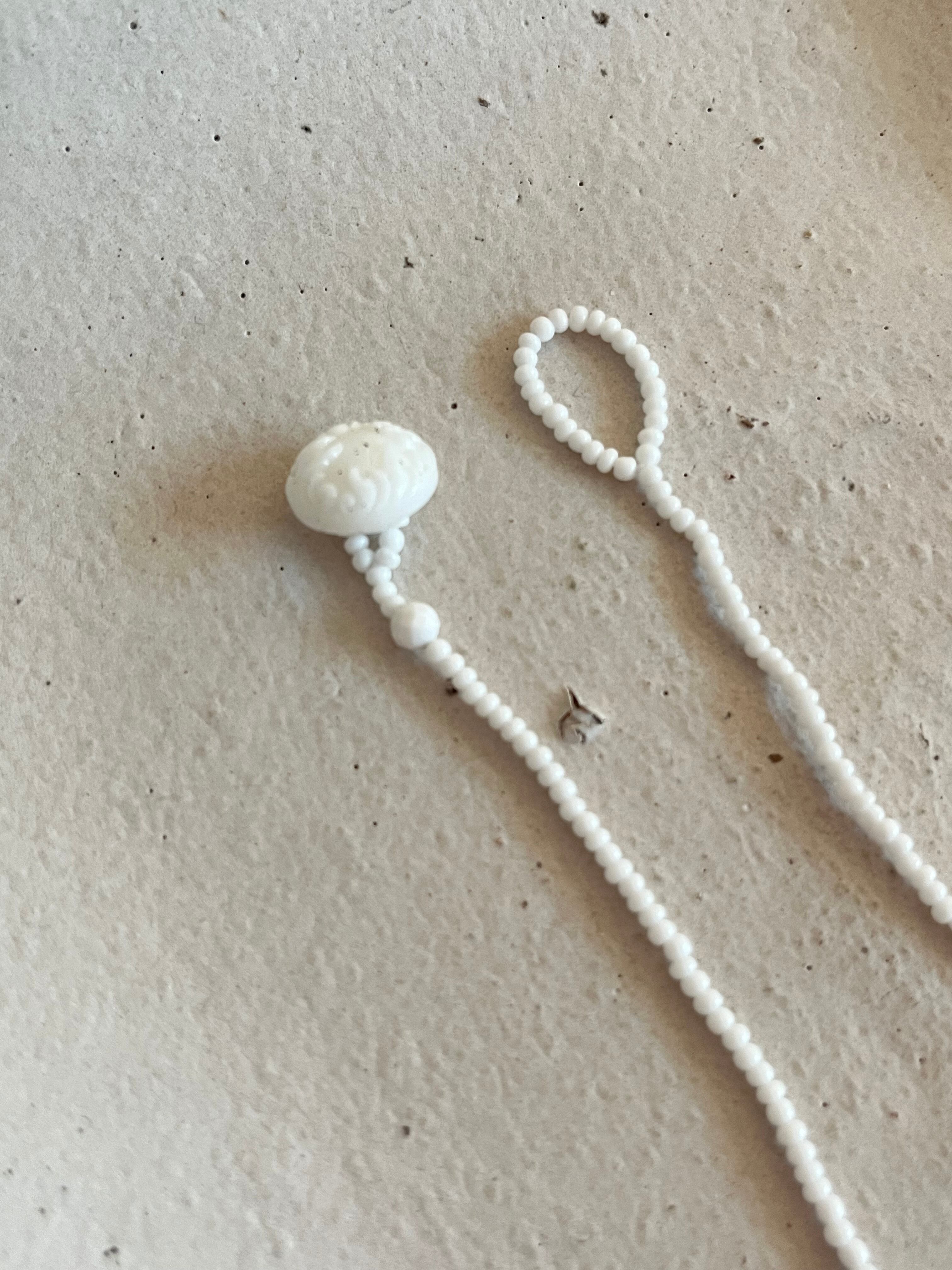 クラスプレスの軽いネックレスが欲しく制作しました金属は使用せずに留め具にもビーズを使用しています。しなりや動きが出て体に沿うようにワイヤーではなく糸に通しました。