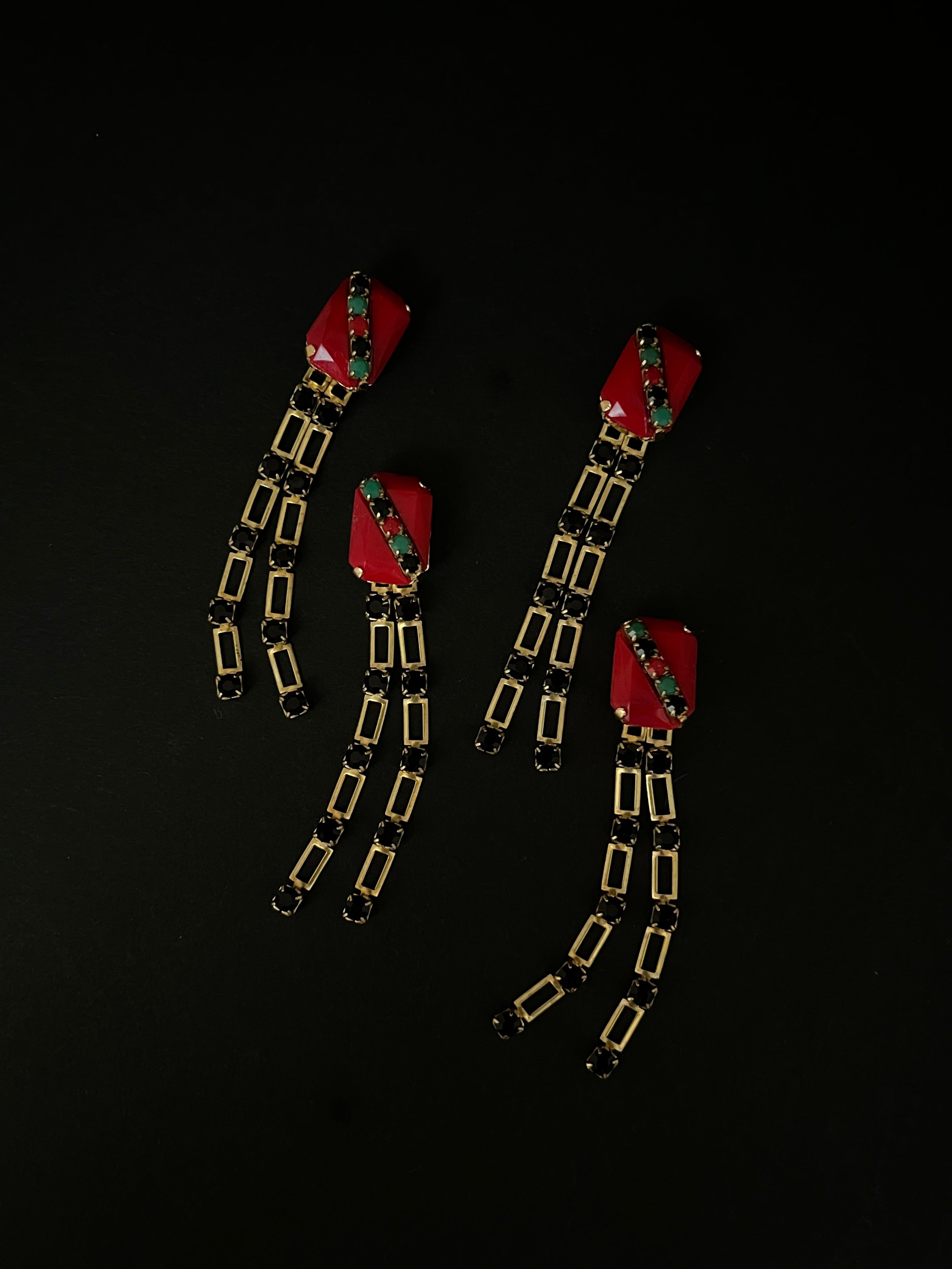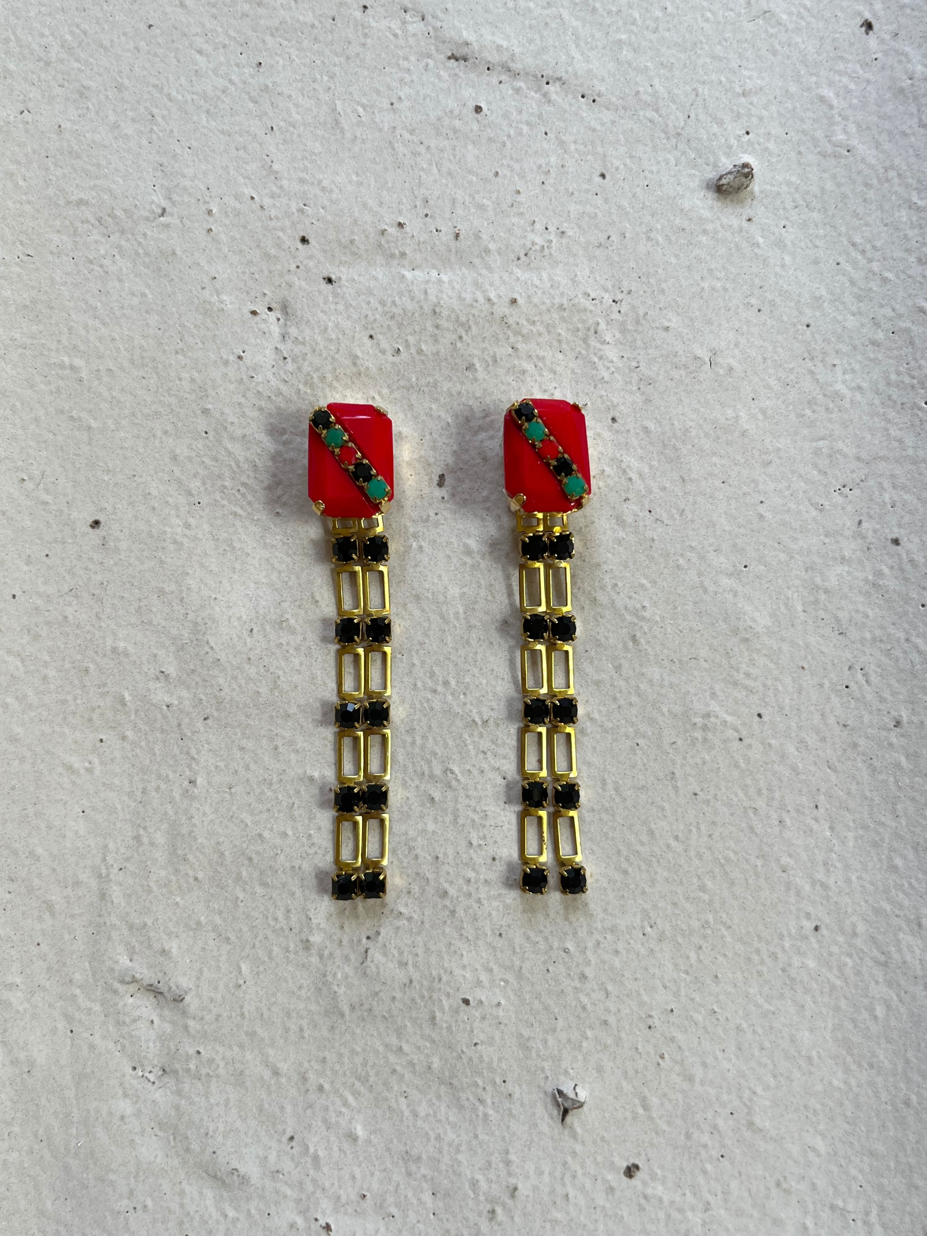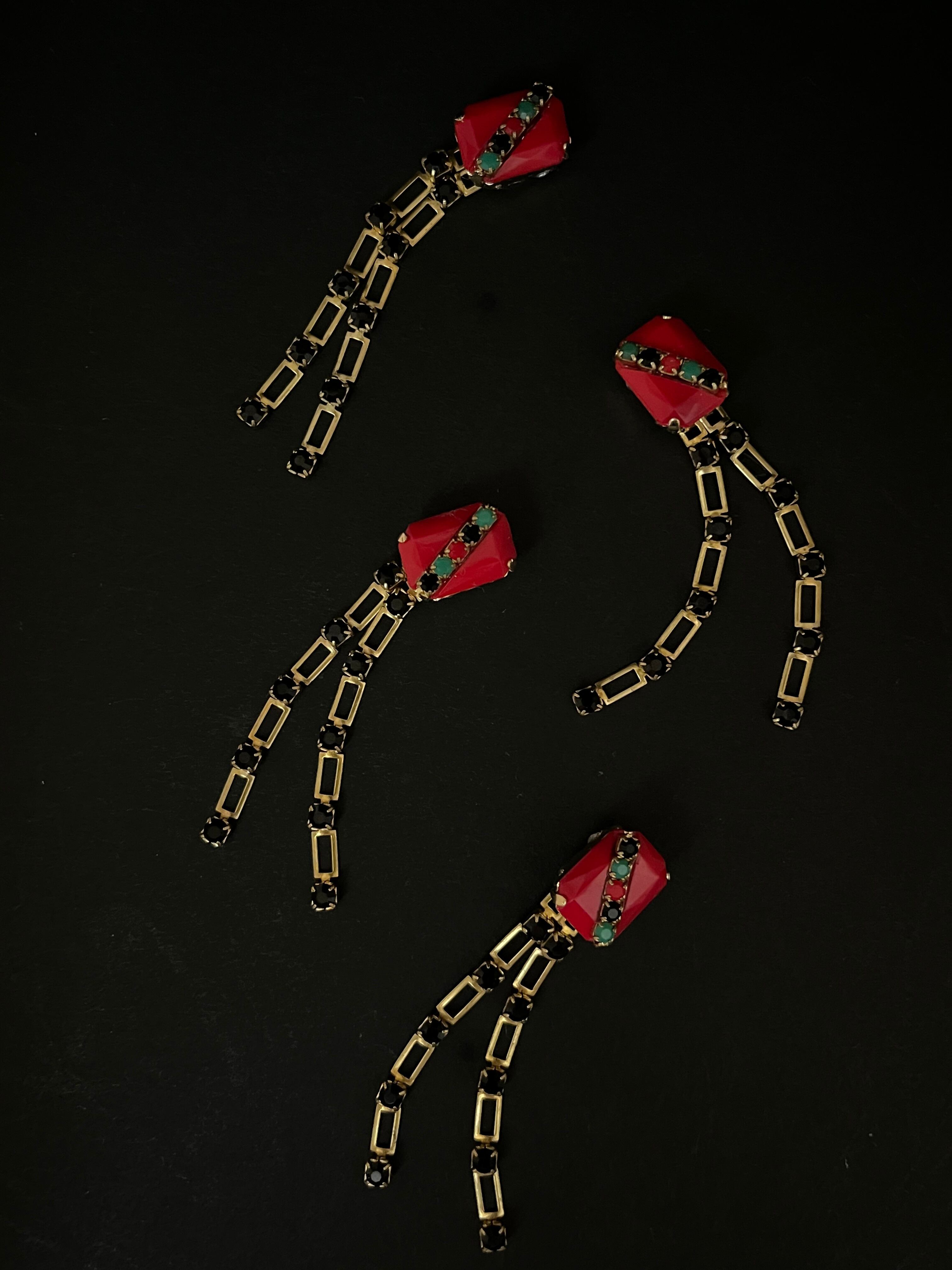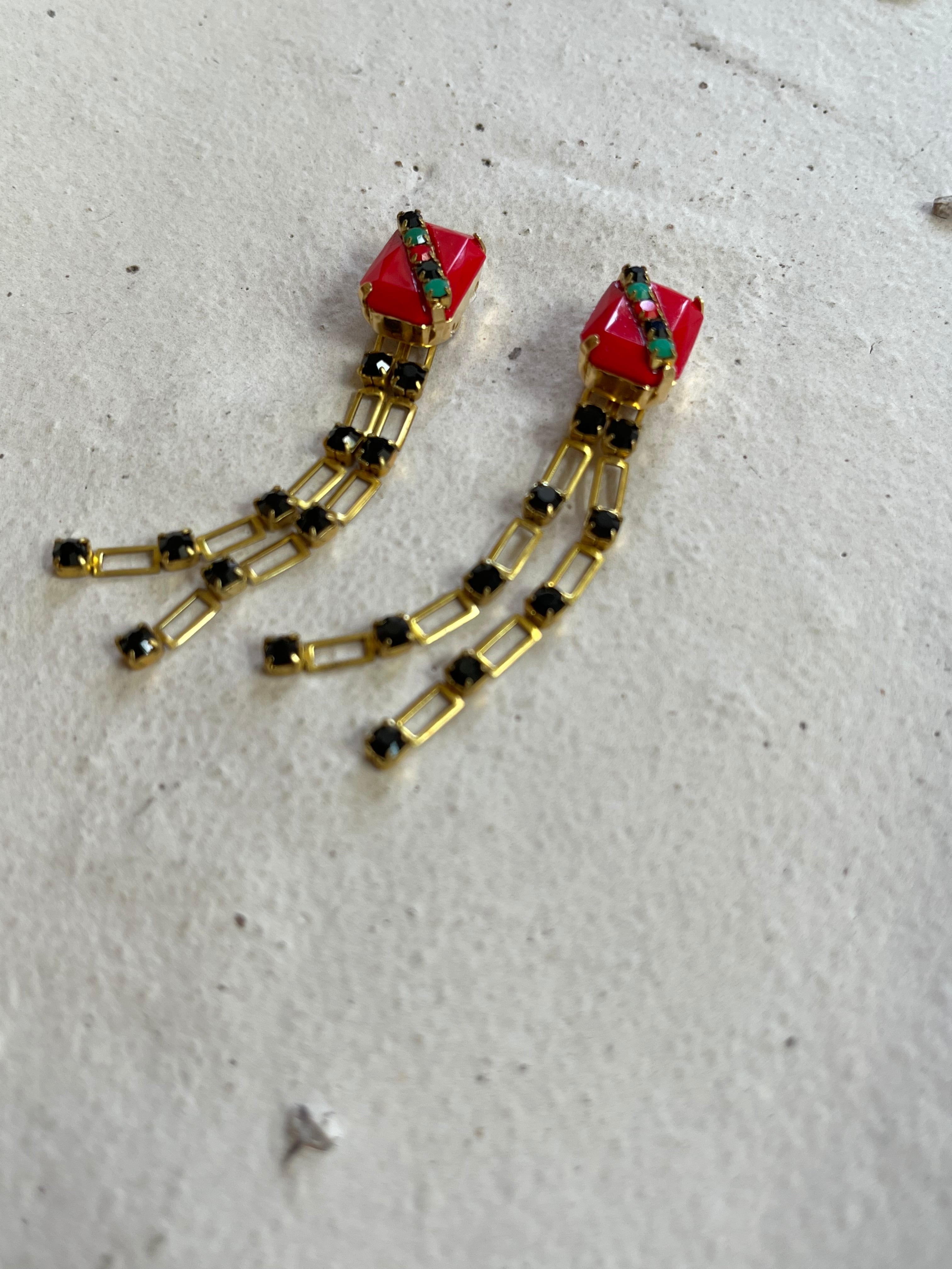 発色のよい真っ赤な珍しい形のヴィンテージのガラスストーンの下にクリアガラスが埋まっているストーンチェーンを垂らして小さな彗星のようなピアスを制作しました。
