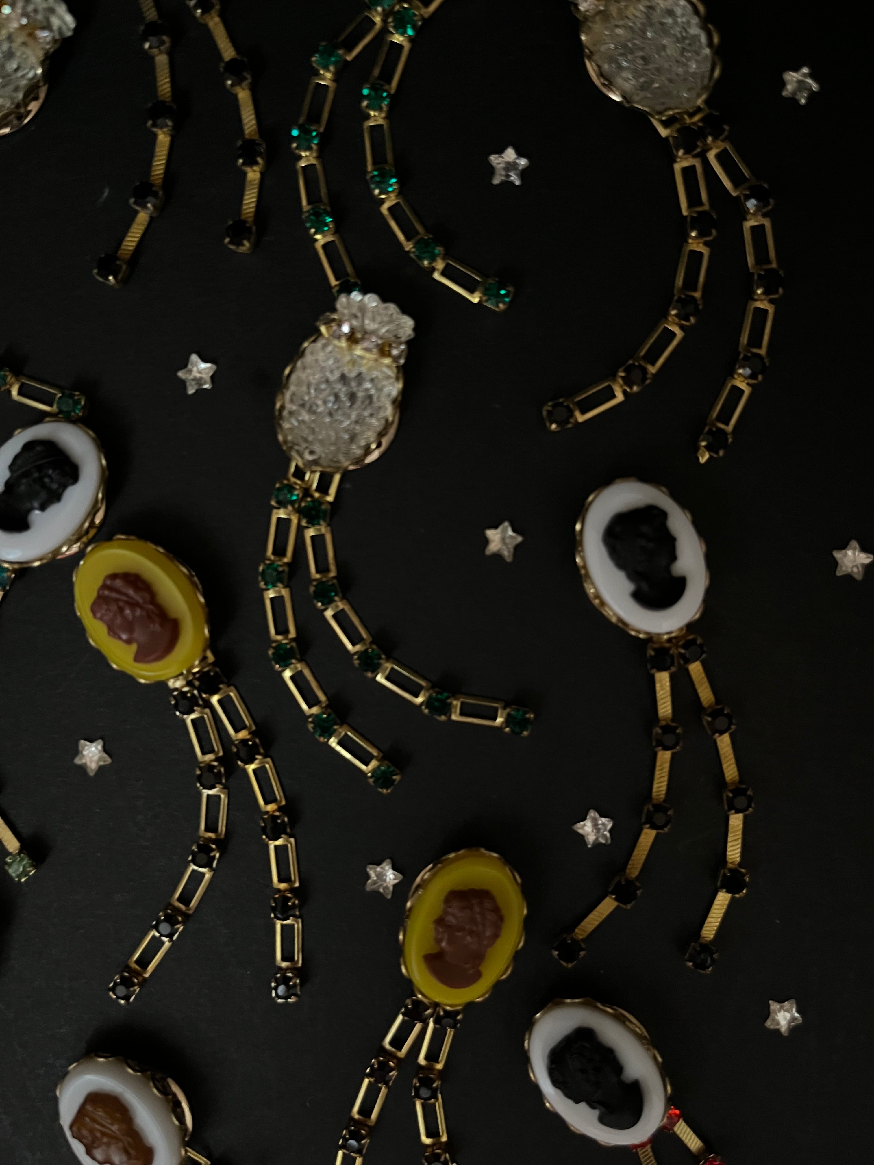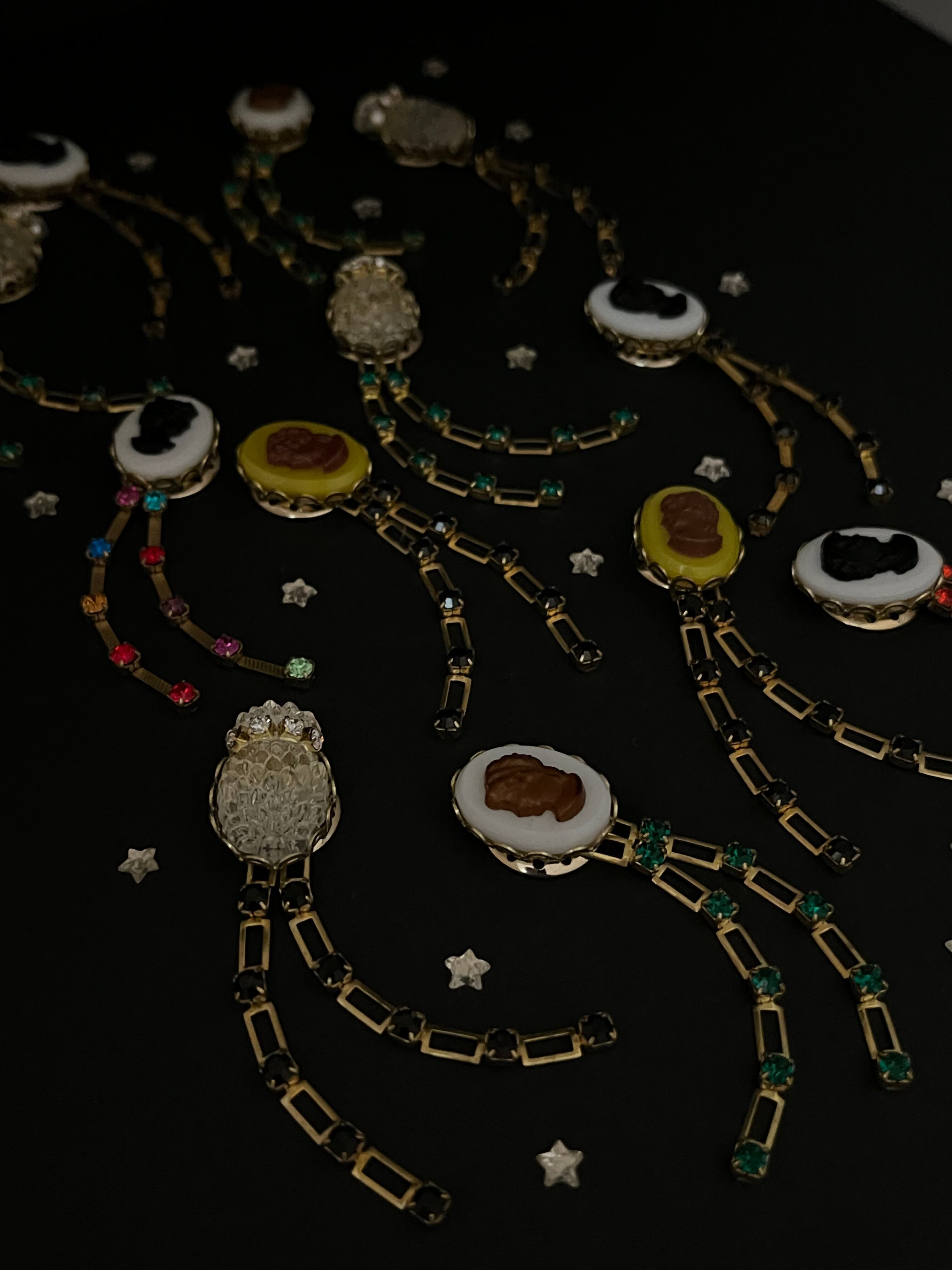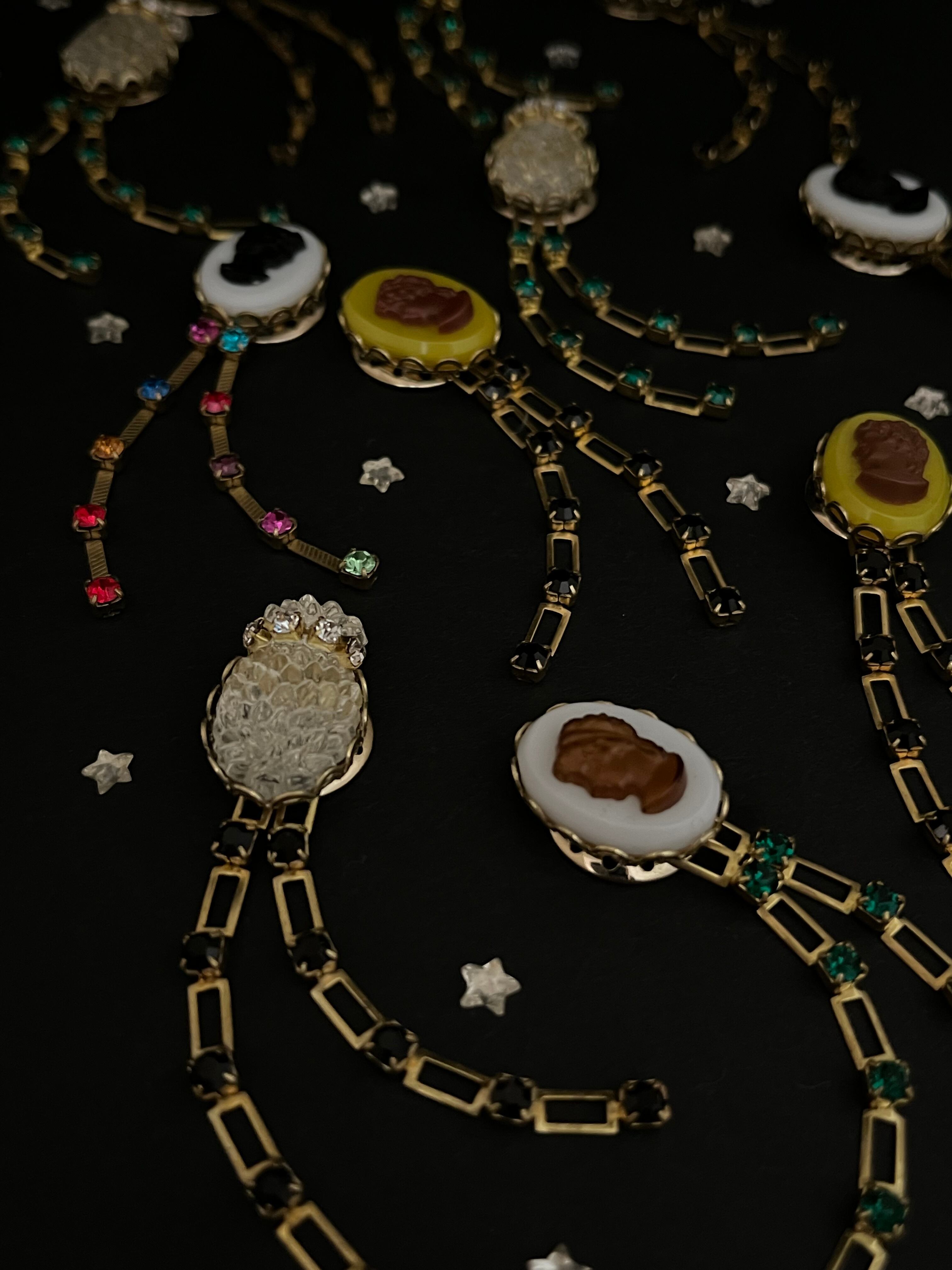 小さなカメオストーンの下に、ガラスが埋まっているストーンチェーンを垂らして小さな彗星のようなピアスを制作しました。