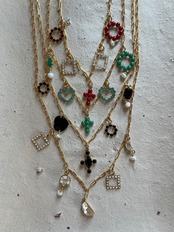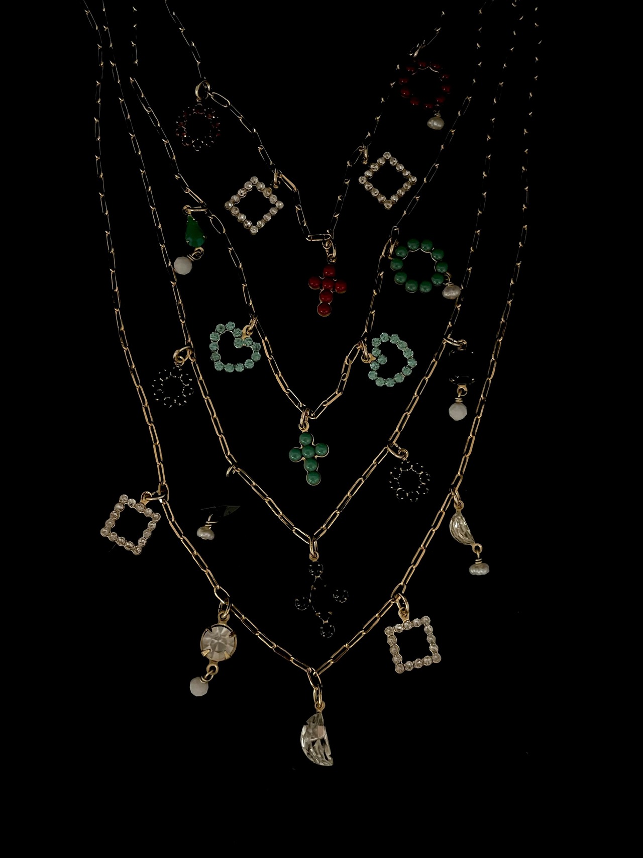 約15ミリ以下の大きさが控えめなチャームたちがほとんどですが、それぞれに存在感のあるチャームをぶら下げました。発色のよいグリーンと赤のカットが入っていないガラスはスワロフスキーのヴィンテージストーン。今にはない透明感のないヴィンテージスワロフスキーの放つ色たちは貴重でもありデザイナー自身も個人的にも大好きです。ハーフムーンのクリアなストーンチャームも素敵です。ブラックにはカットが入った♥を。