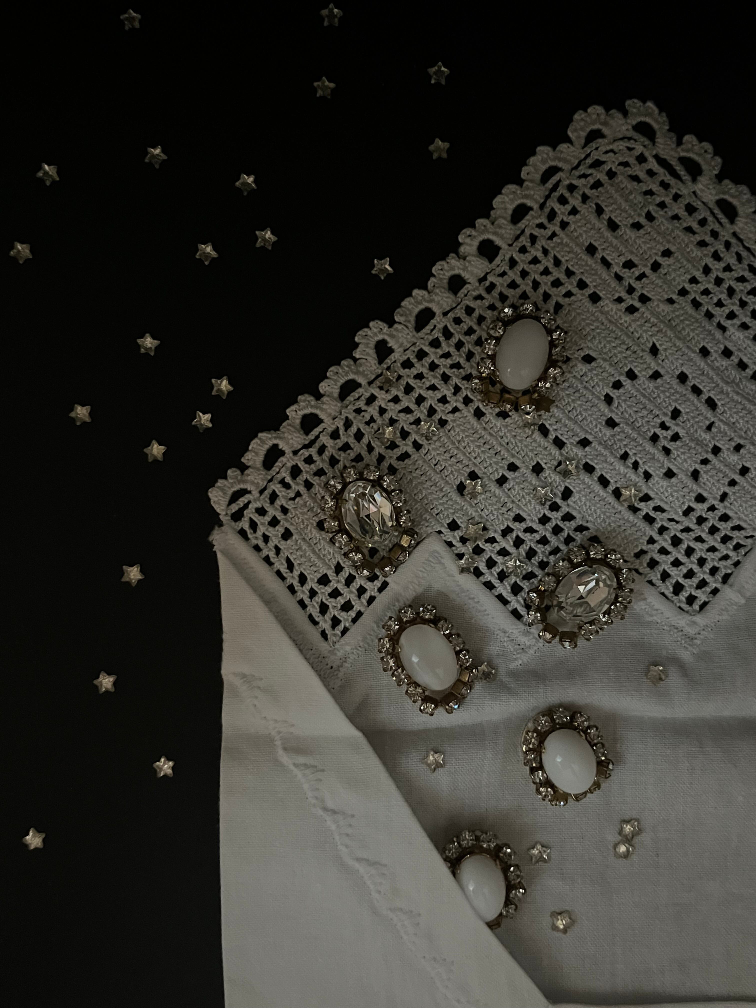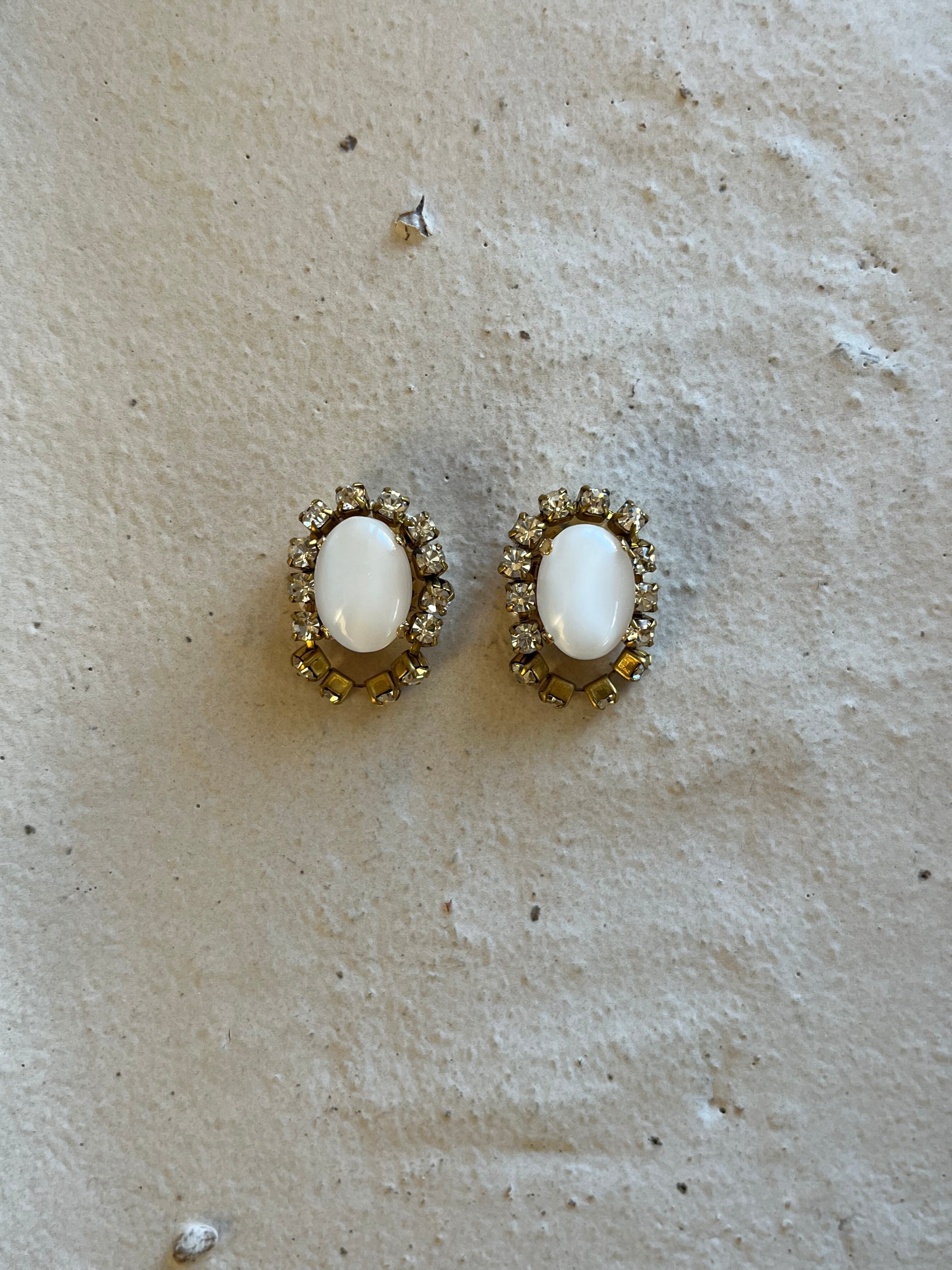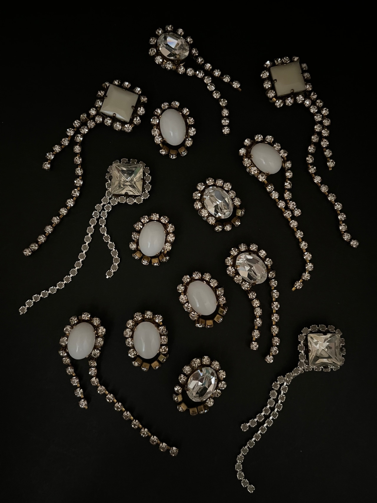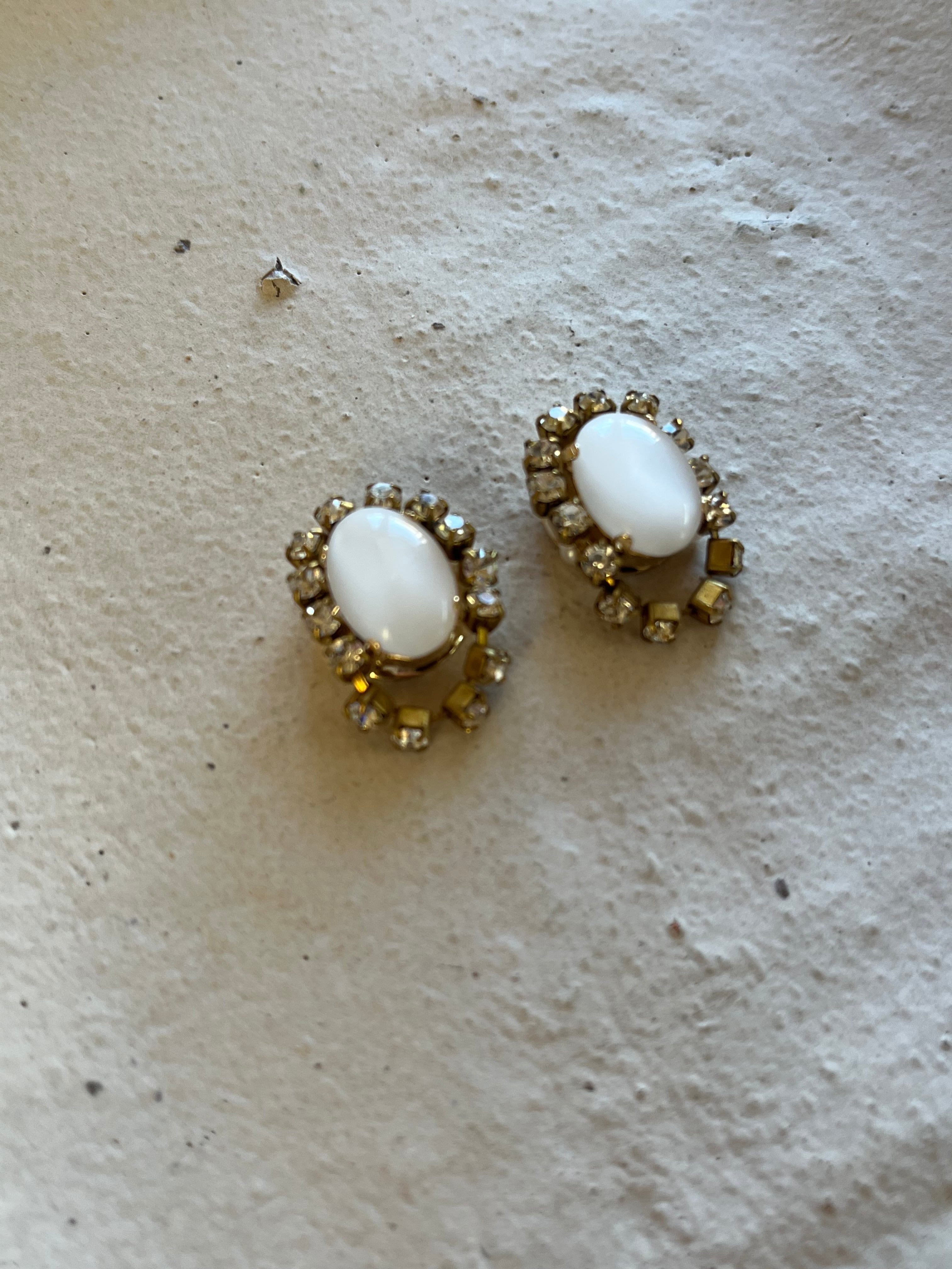 ヴィンテージのカットが珍しいクリアカラーのストーンの周りにガラスが埋まっているストーンチェーンを一周纏わせてピアスを制作しました。cometシリーズと同じく、ストーンチェーンの下には小さな小さな淡水パールを敷き詰めています。横からみたデザインも抜かりないようにこだわって制作しました。