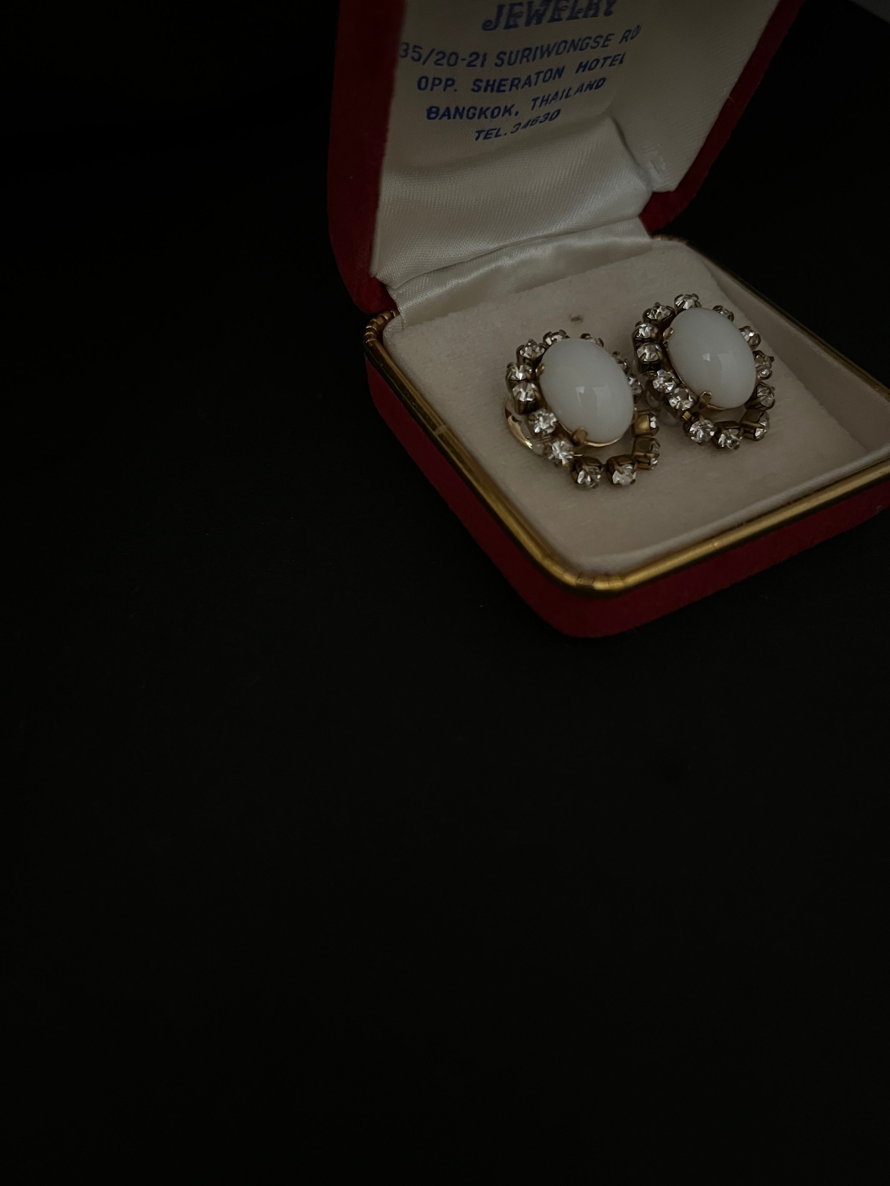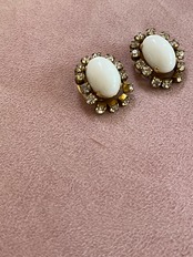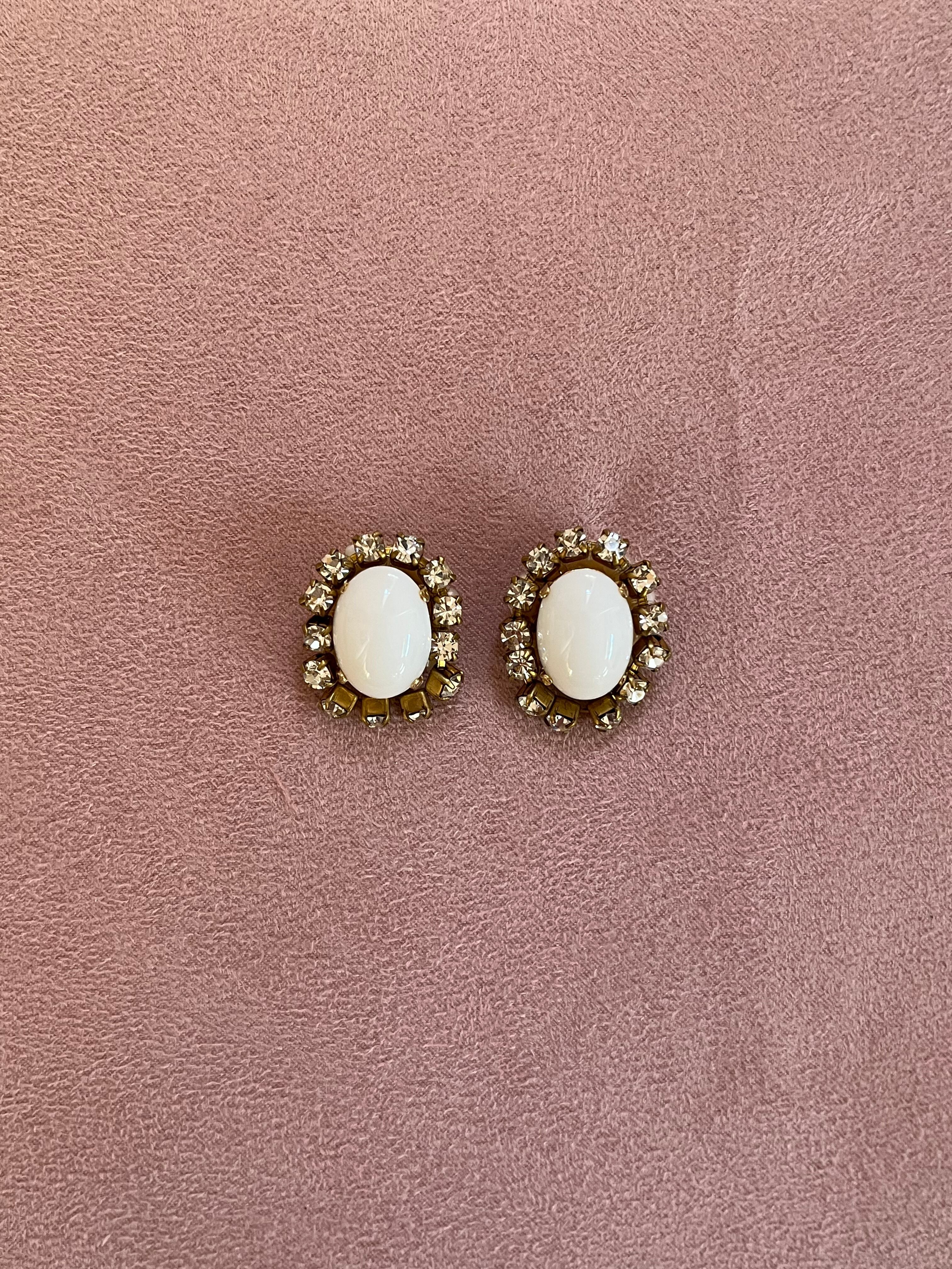 ヴィンテージのカットが珍しいクリアカラーのストーンの周りにガラスが埋まっているストーンチェーンを一周纏わせてピアスを制作しました。cometシリーズと同じく、ストーンチェーンの下には小さな小さな淡水パールを敷き詰めています。横からみたデザインも抜かりないようにこだわって制作しました。