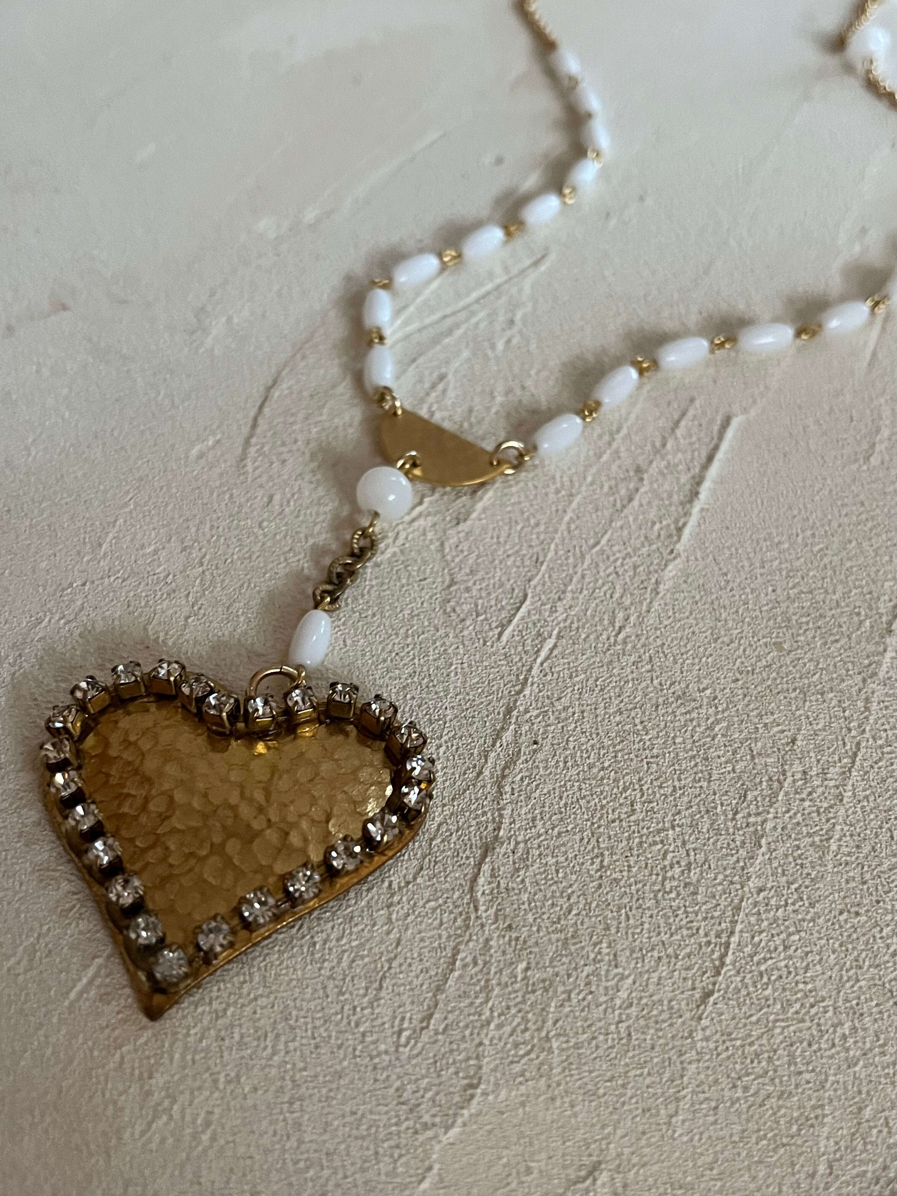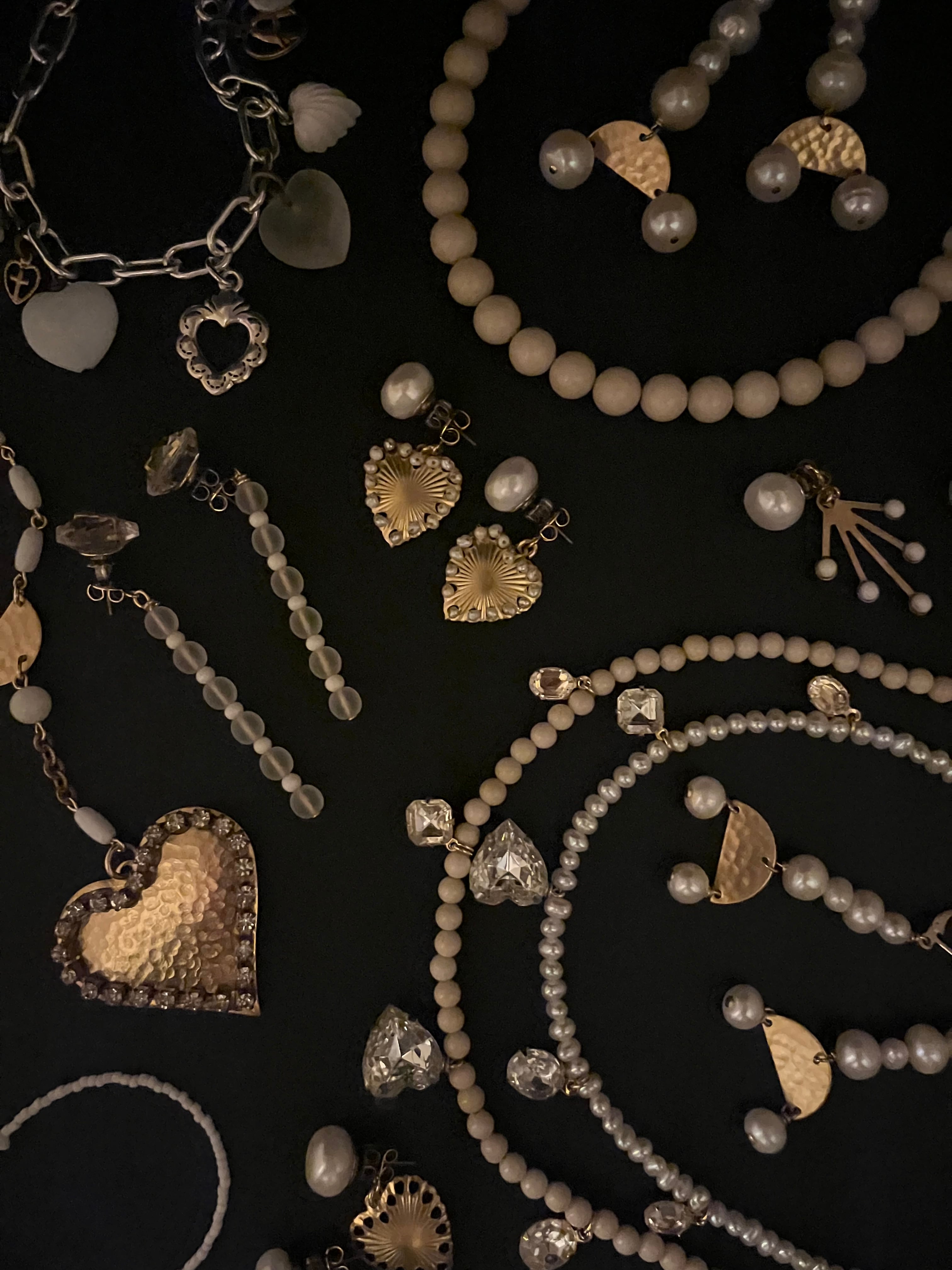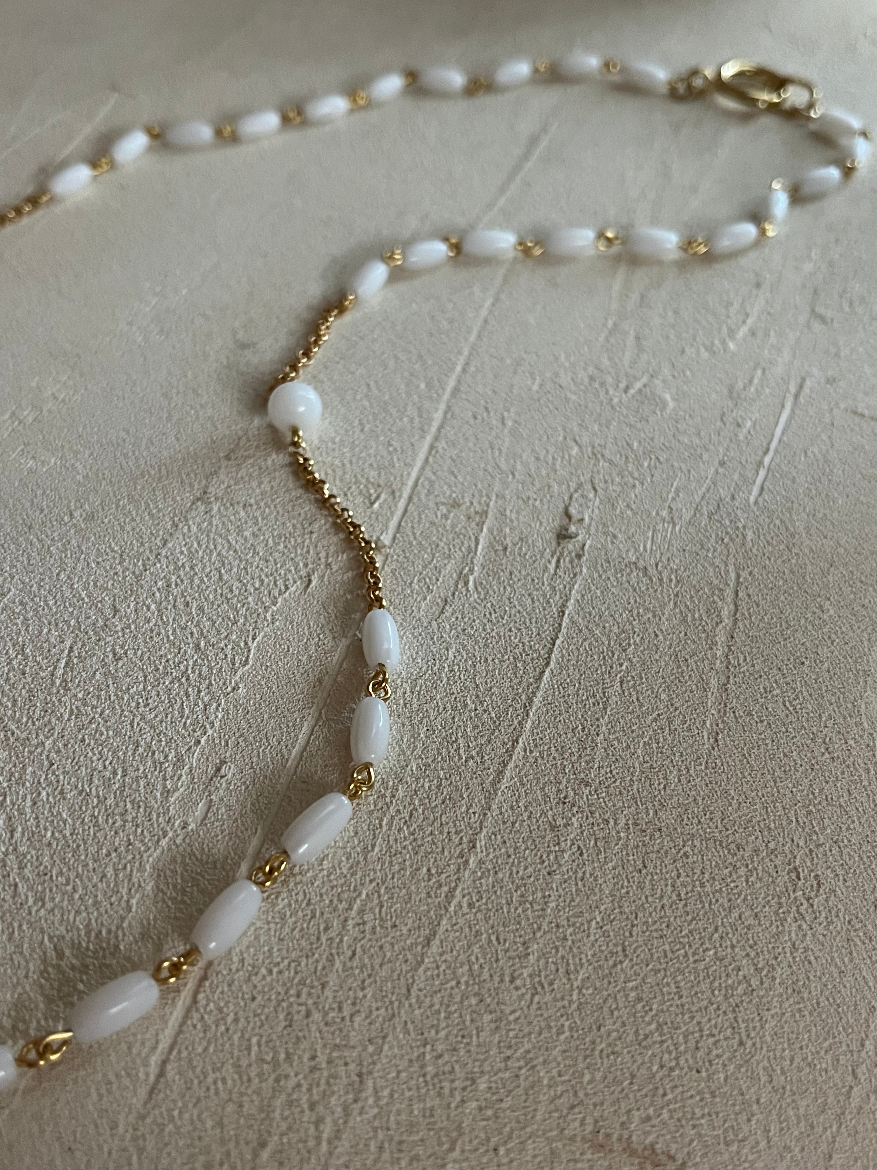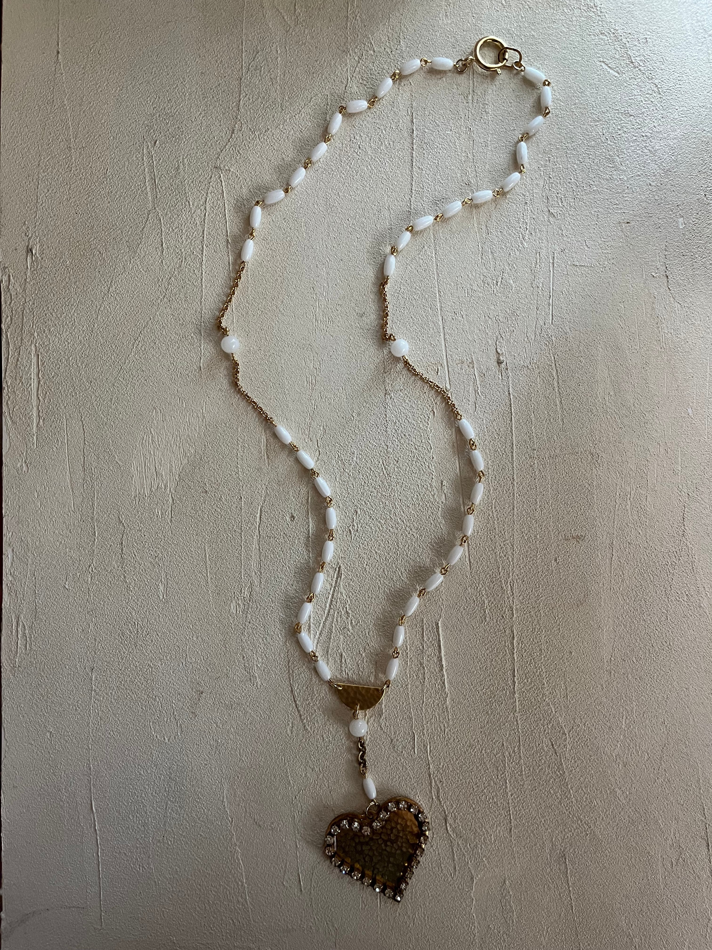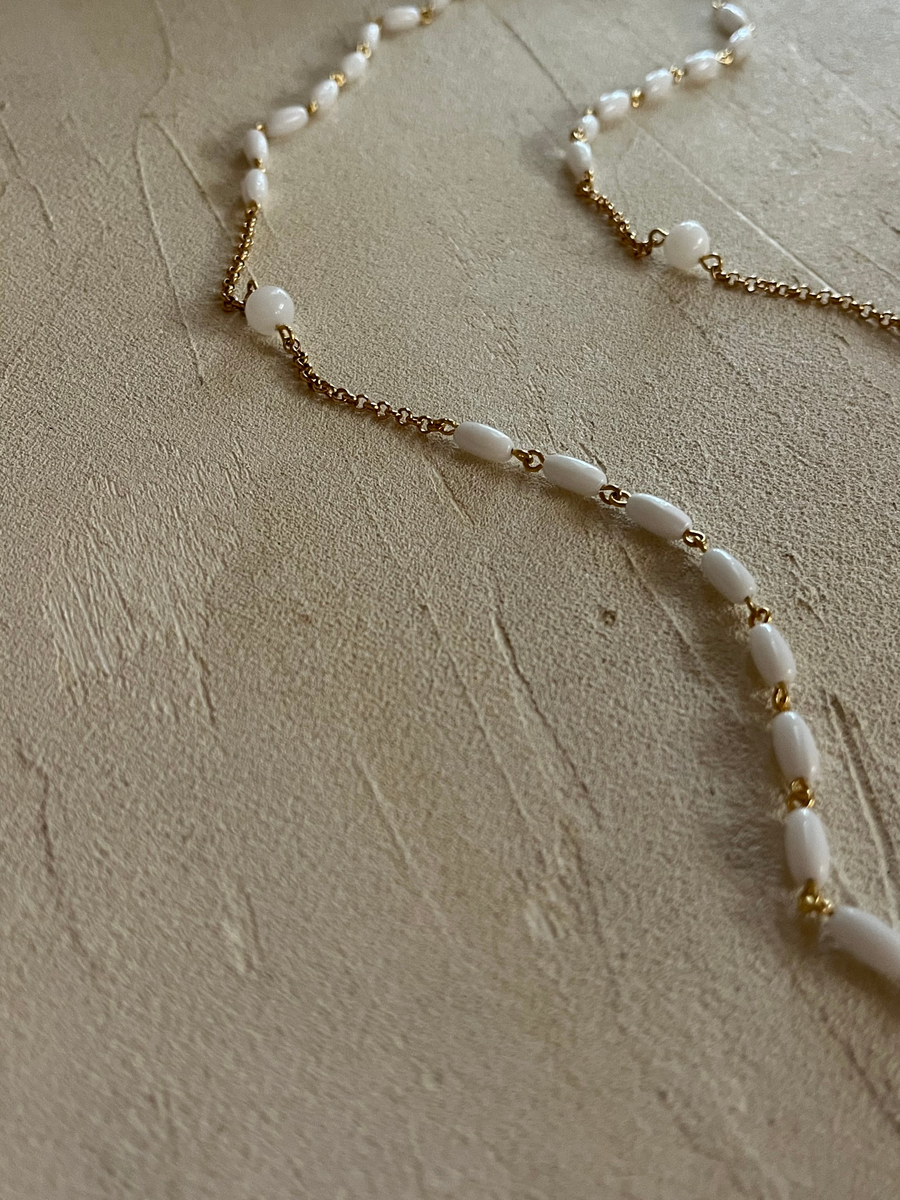 Y字のロザリオをソースに制作したネックレスですが、ビーズの数やトップのクロスではないものにアレンジしているので本来のロザリオとは辿り着いた形は大きく変わりましたが、とてもお気に入りの作品が出来ました。長さもたっぷりとしたデザインになっています。