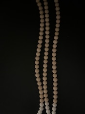 ベージュのの8mm丸玉はリバーストーン。ほんのりと模様が入っていてボリュームもしっかりあります。HUEらしさを少し含みたく、ジャパンヴィンテージの丸玉ビーズをエンドパーツの近くに7粒入れました。留め具に使ったマンテルはカレンシルバー(95%以上シルバー)になります。