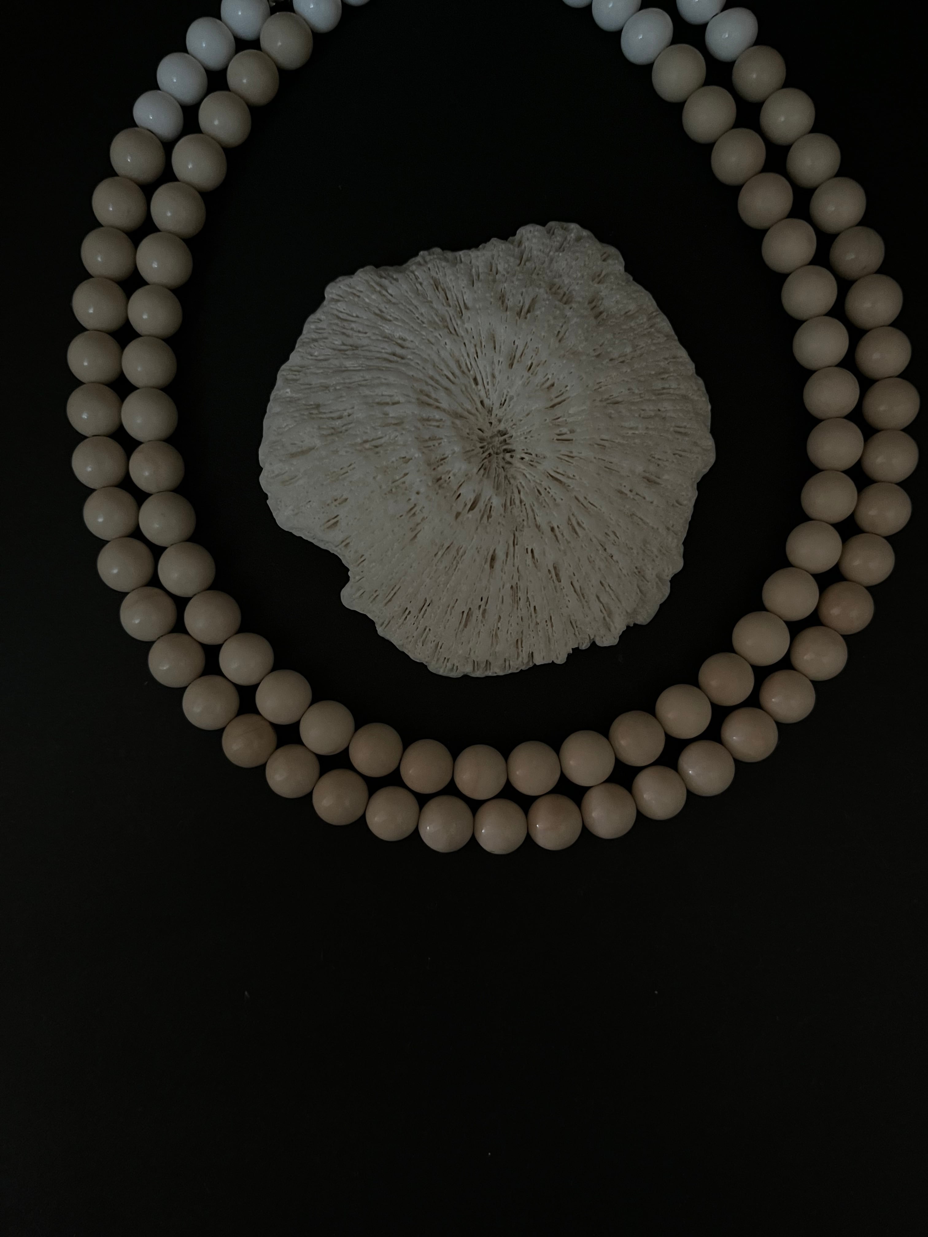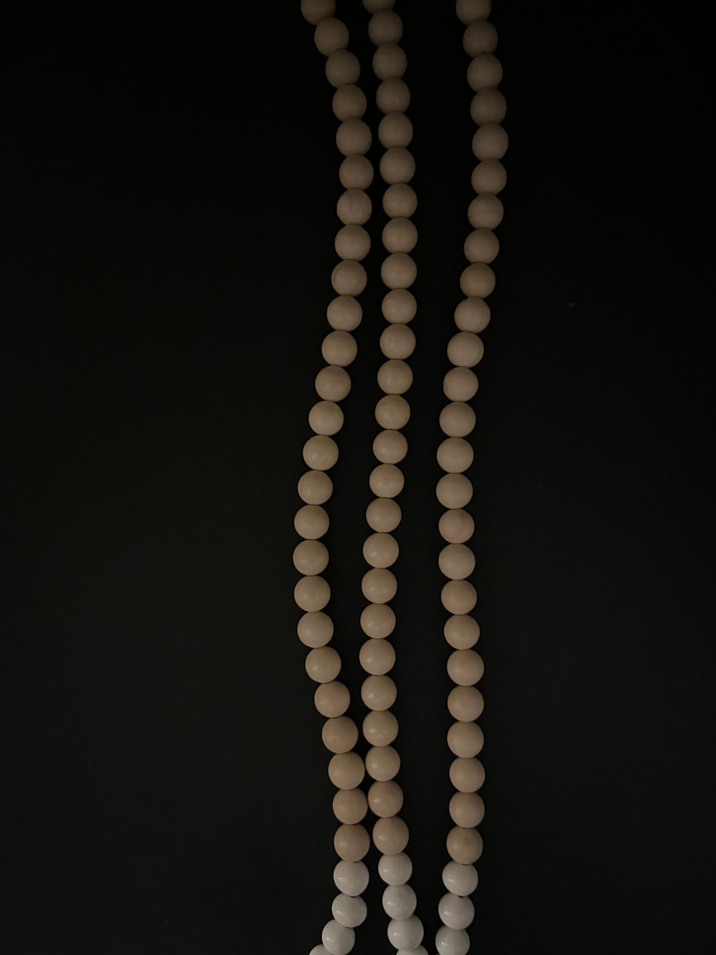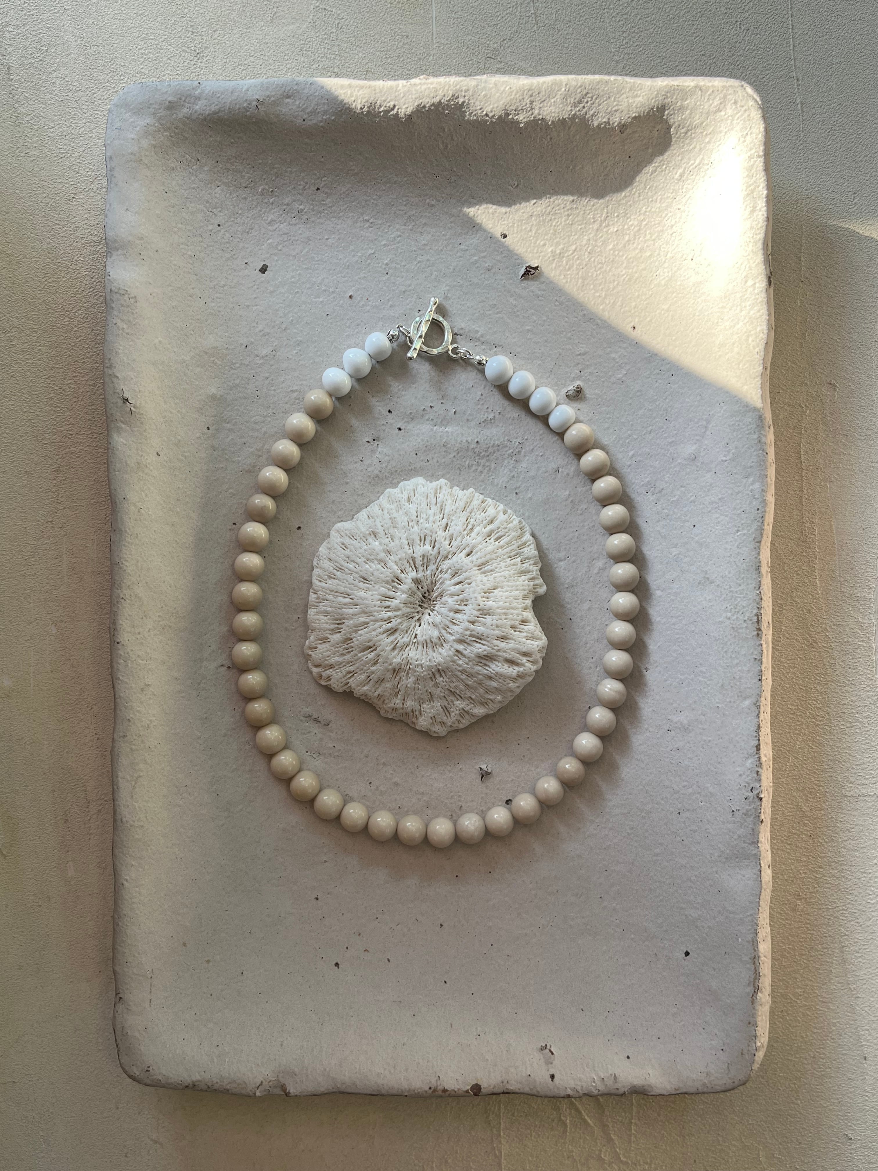 肌なじみの良いミルクティー色のリバーストーンに惹かれて作ったチョーカータイプのネックレス。天然石の持つ魅力と力強さ、ヴィンテージのガラスビーズが放つ歪さと愛くるしさとのマリアージュもお楽しみください。