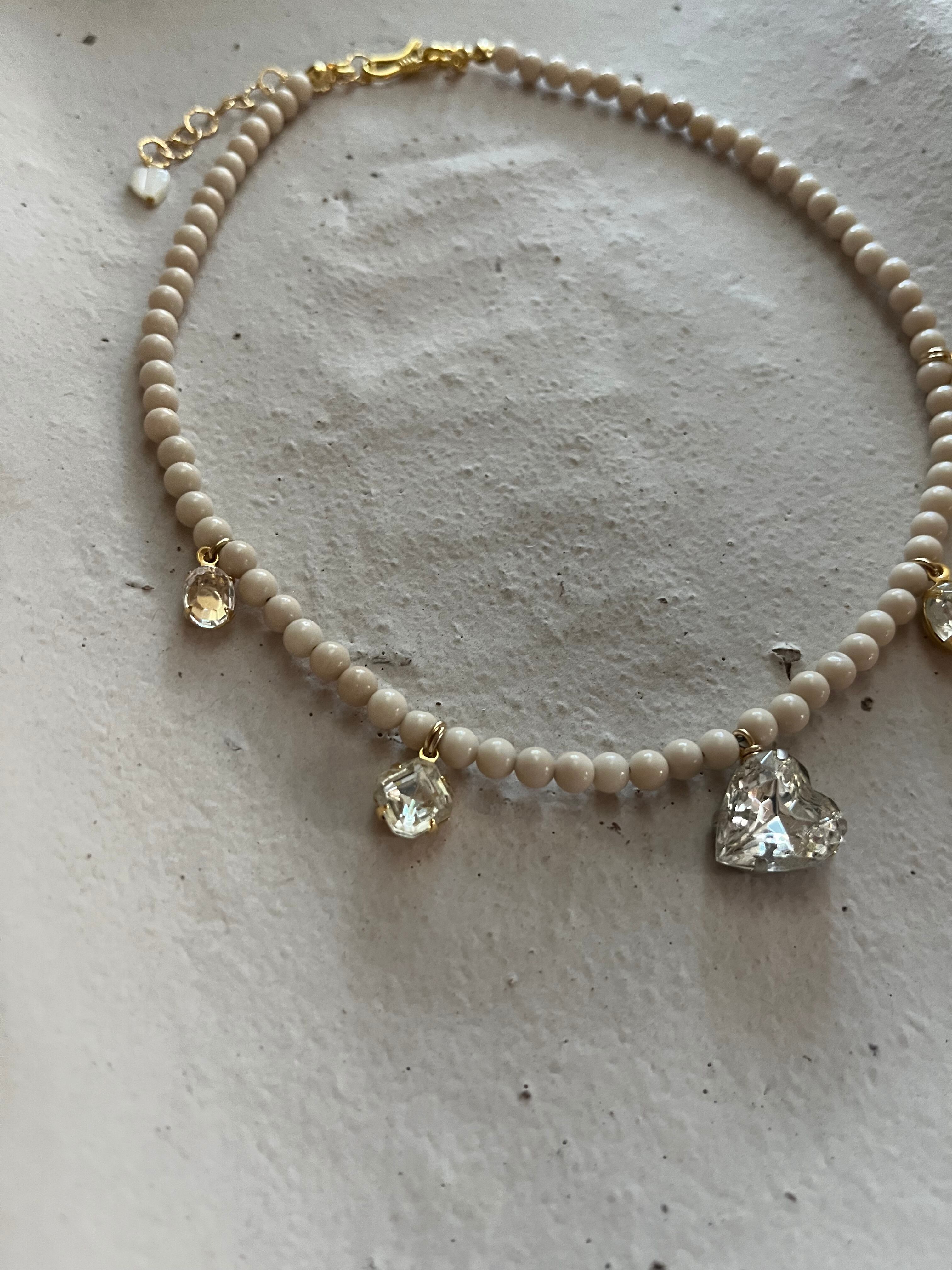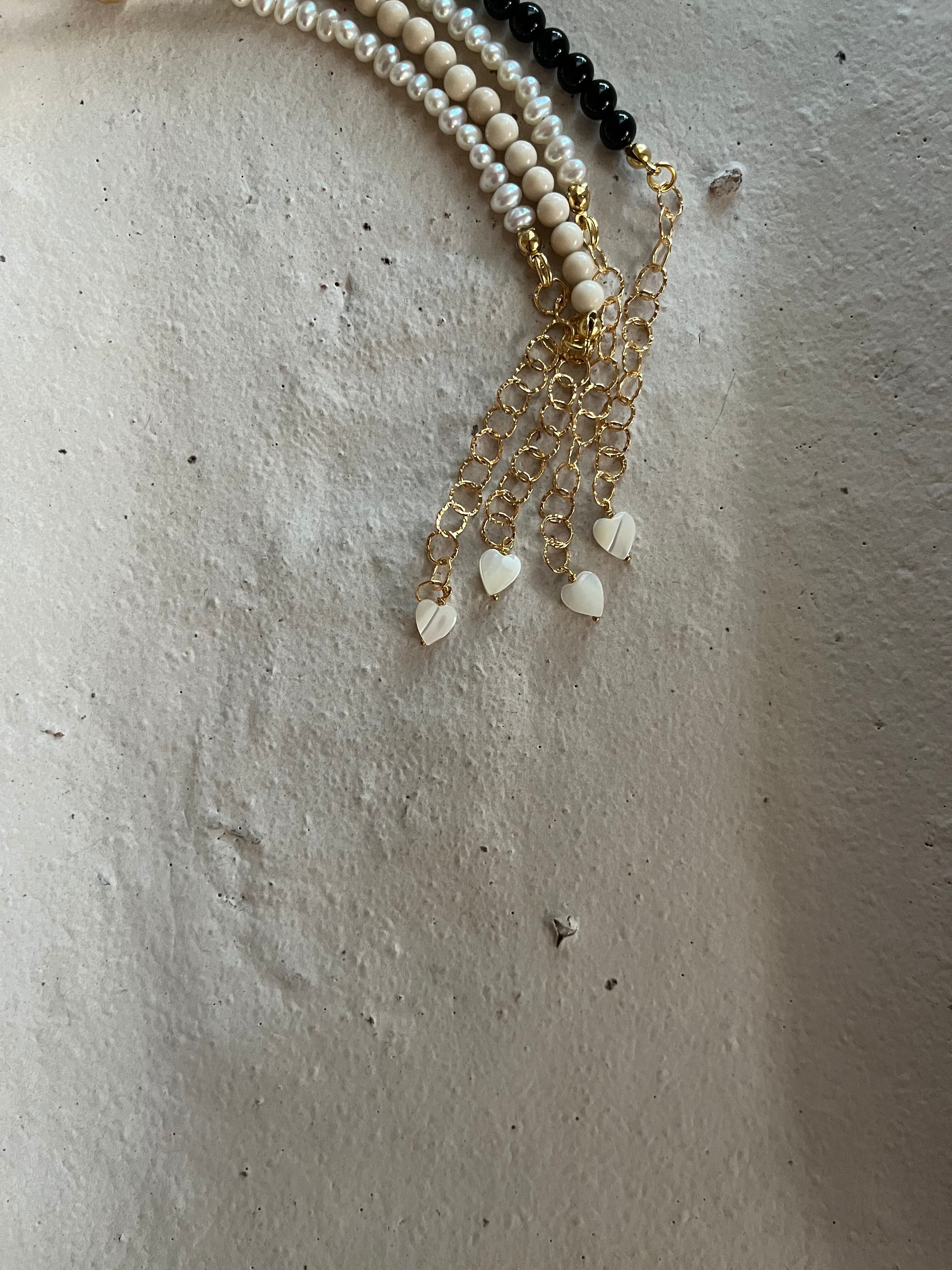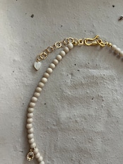短めでニットやスウェットからガラスストーンが少しだけ出るのが良いなあと思って制作しましたが、気分で長さを変えられるように数センチのアジャスターをつけております