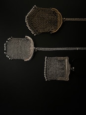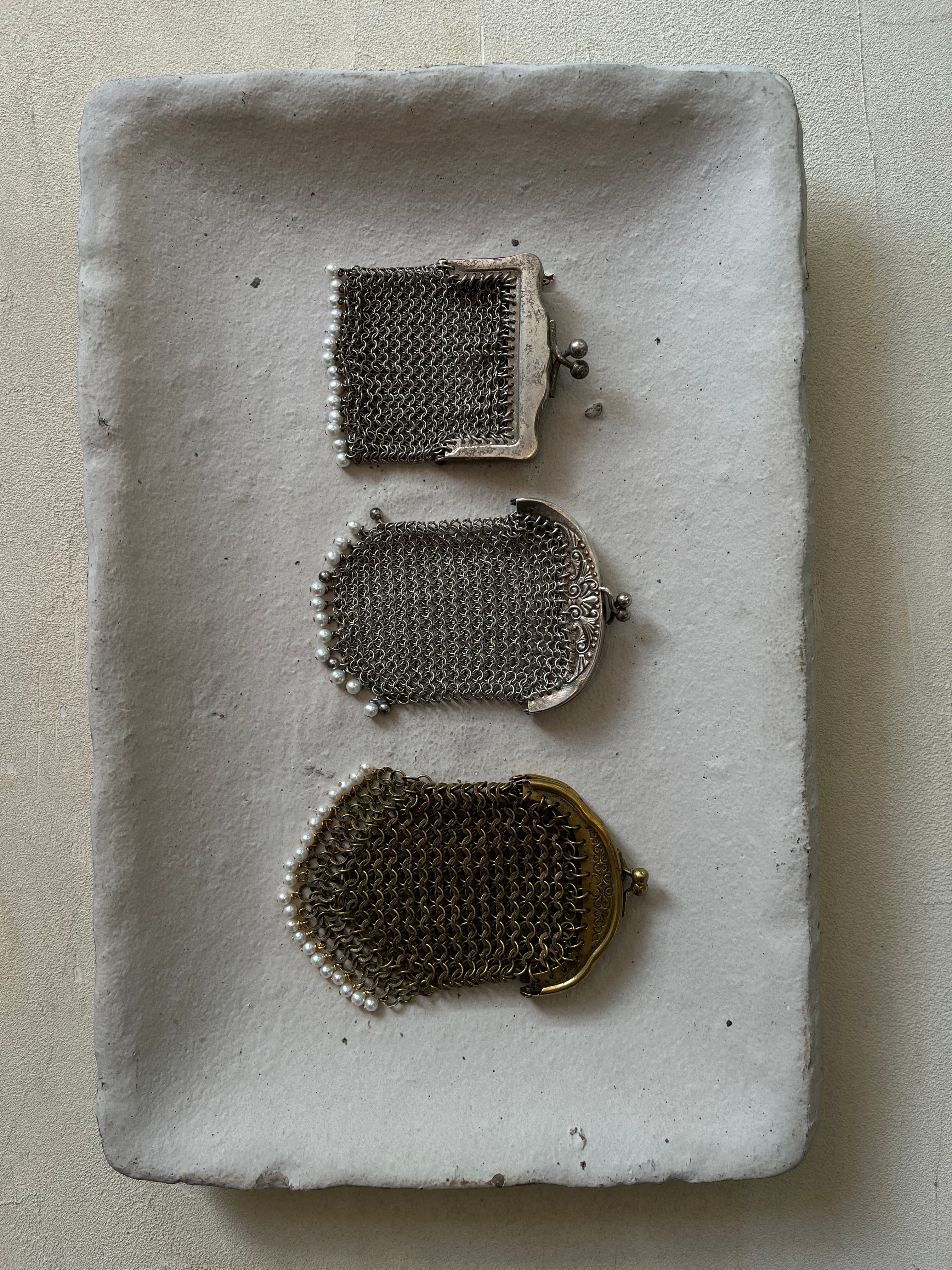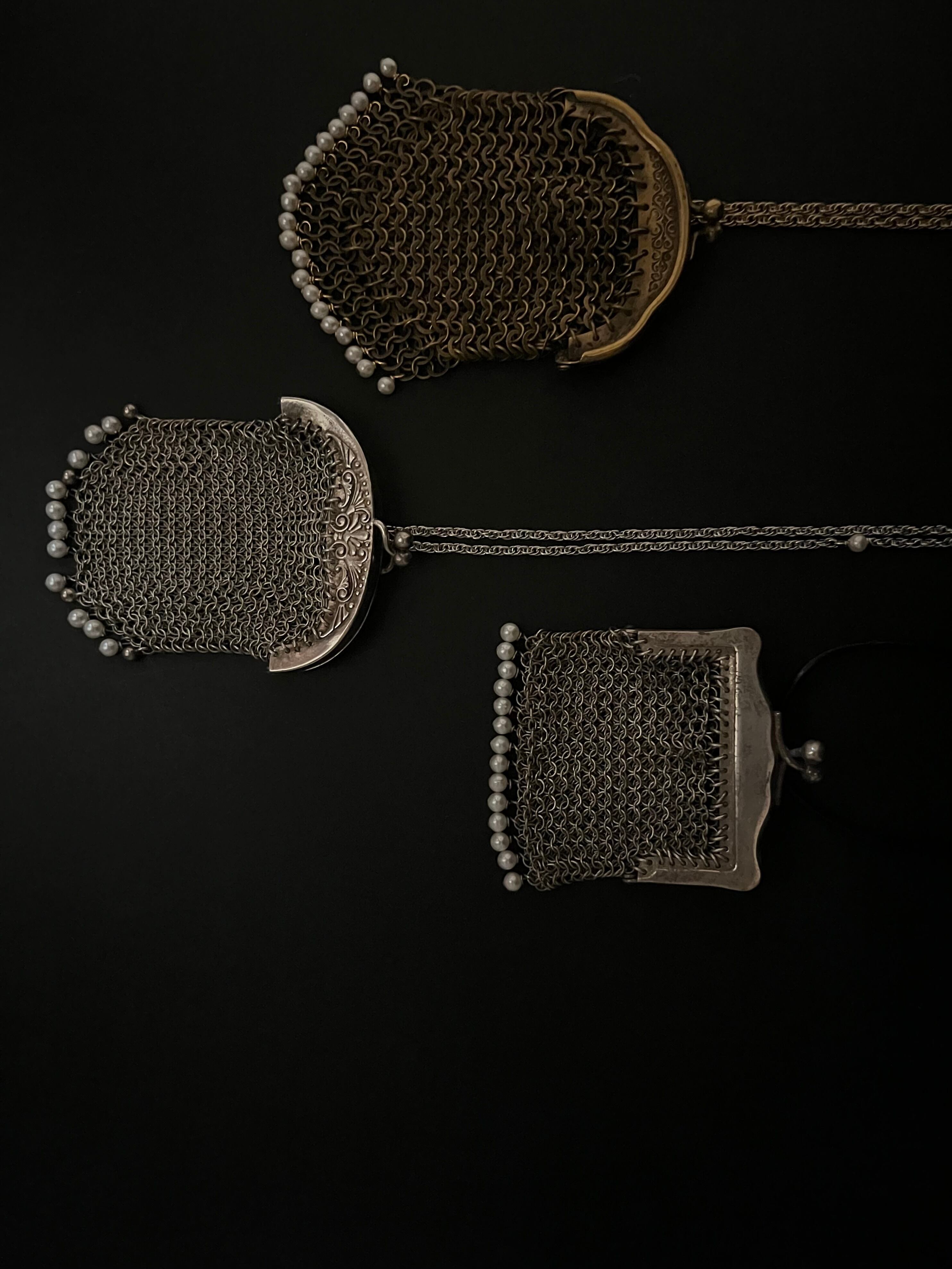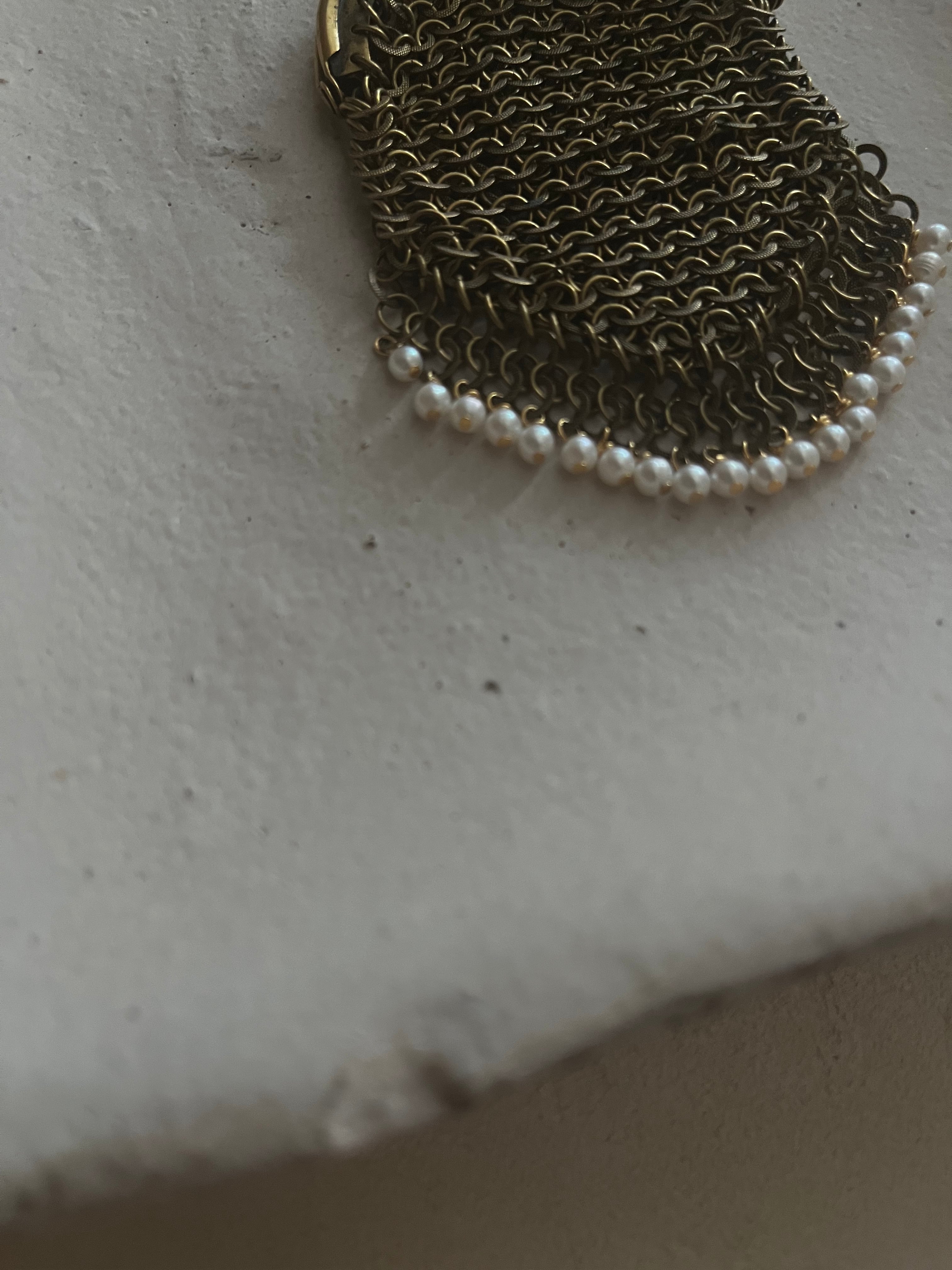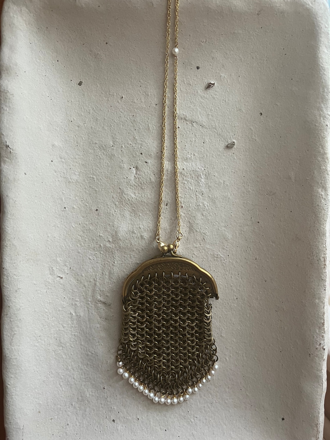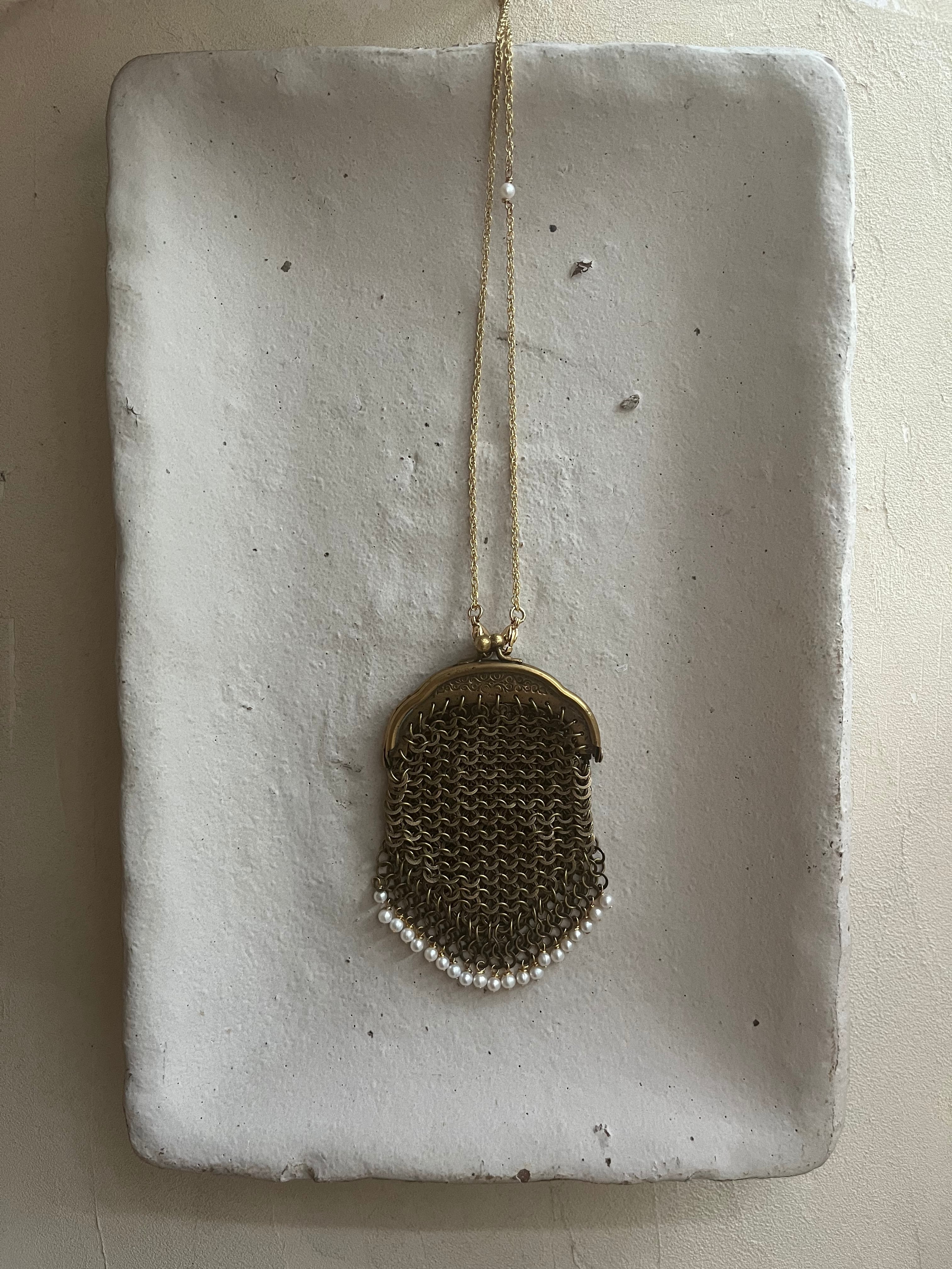 まるでアートピースのような古いコインパースに小さな淡水パールを織り交ぜて、美しいネックレスに仕立てました