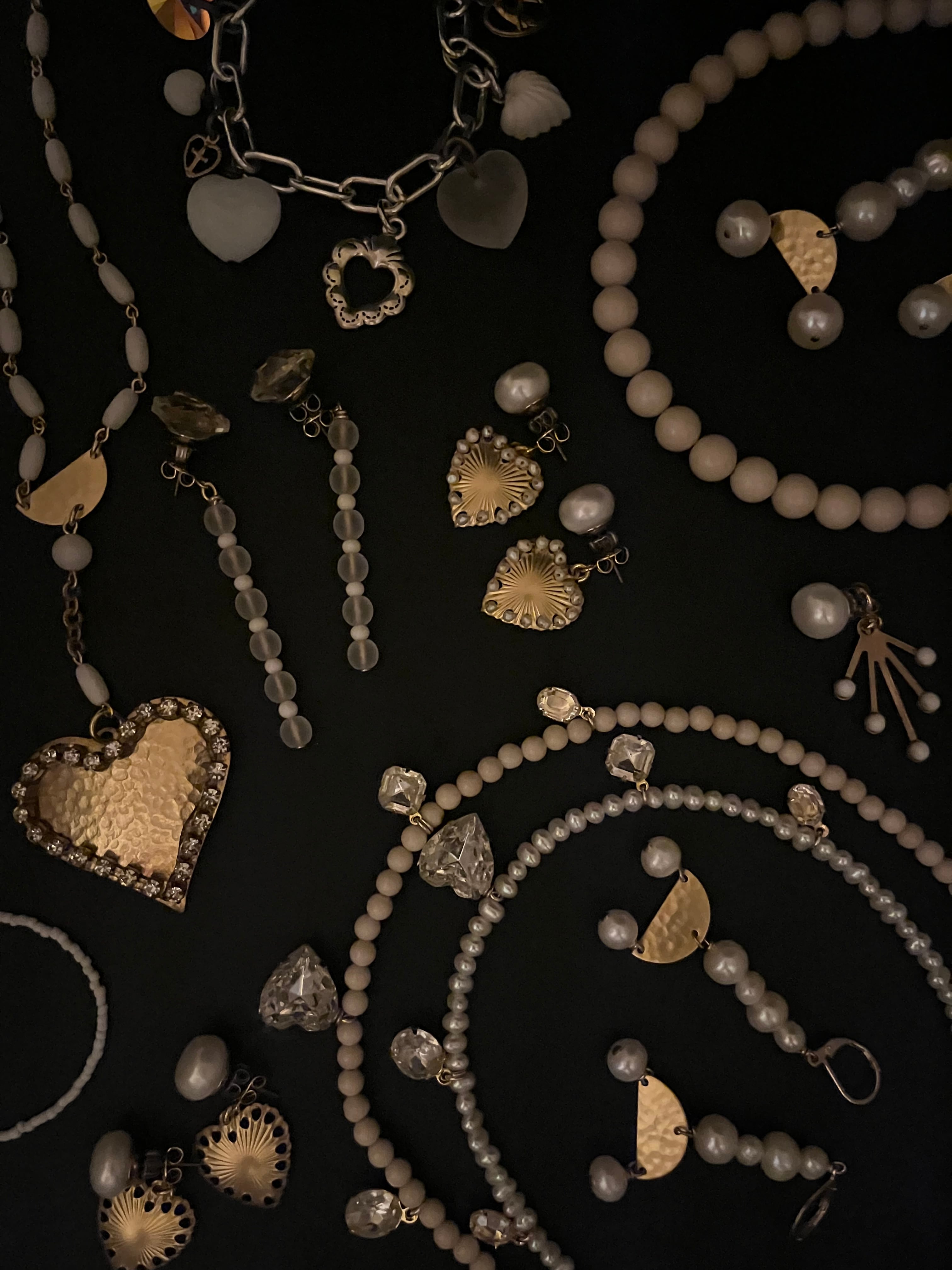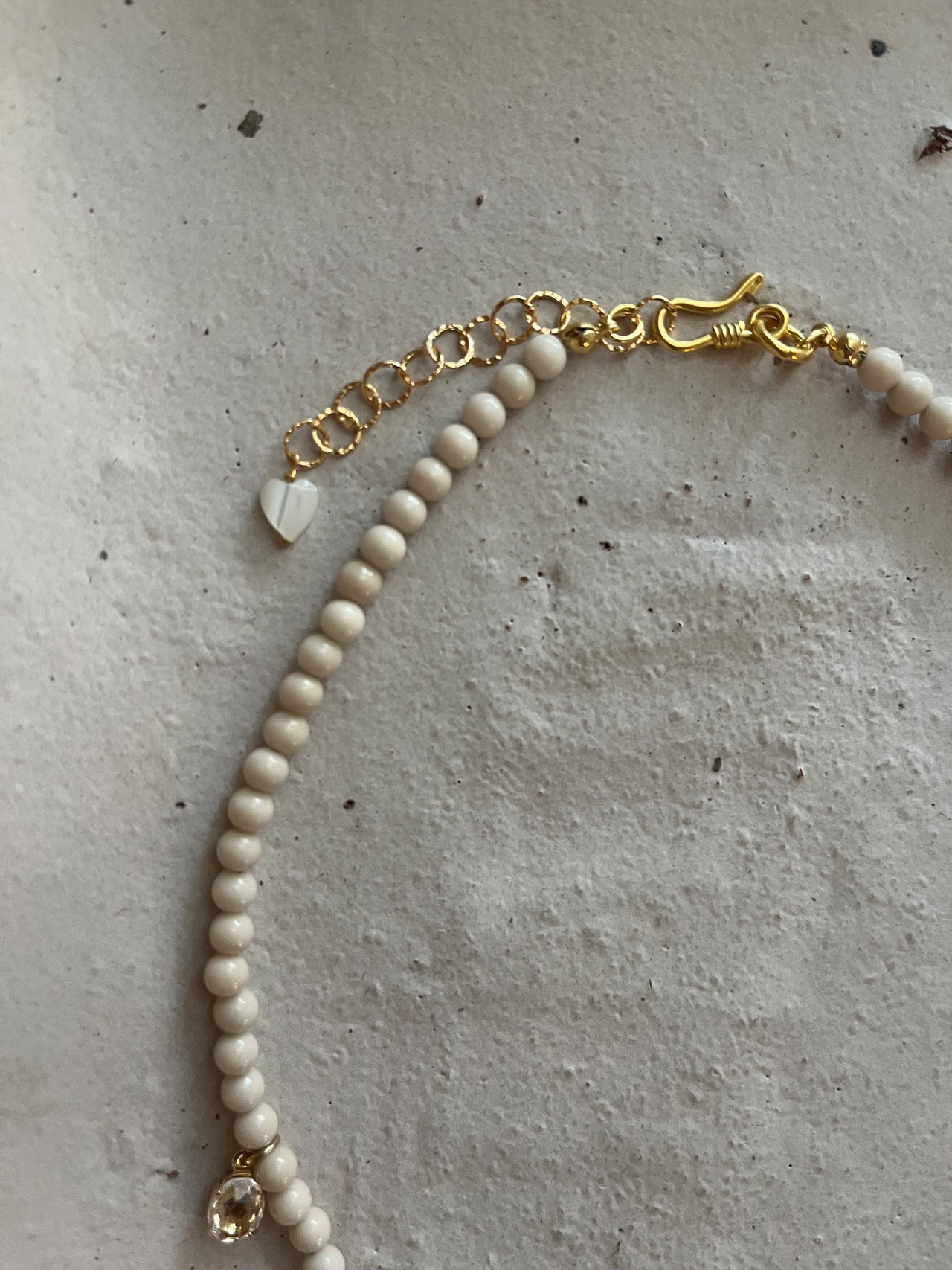 短めでニットやスウェットからガラスストーンが少しだけ出るのが良いなあと思って制作しましたが、気分で長さを変えられるように数センチのアジャスターをつけております