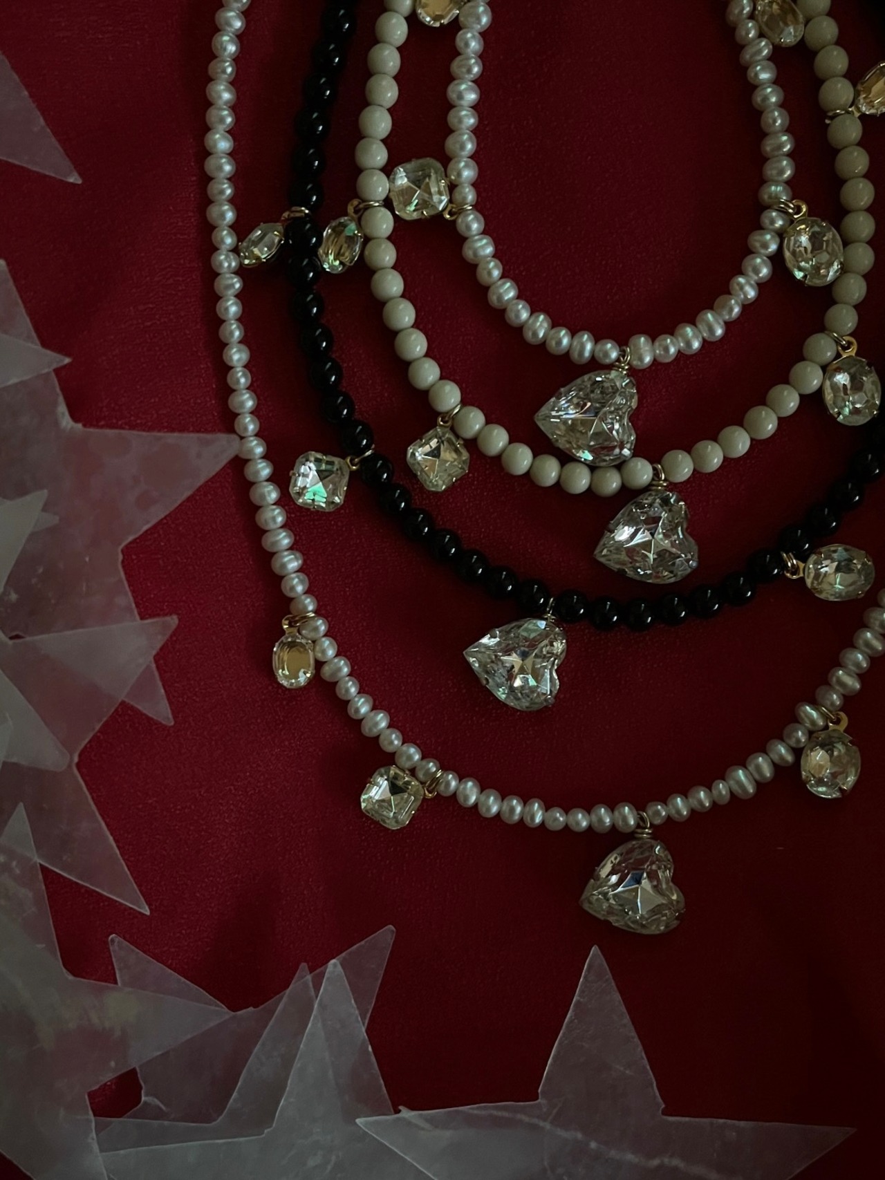 短めでニットやスウェットからガラスストーンが少しだけ出るのが良いなあと思って制作しましたが、装いや気分で長さを変えられるように数センチのアジャスターをつけております