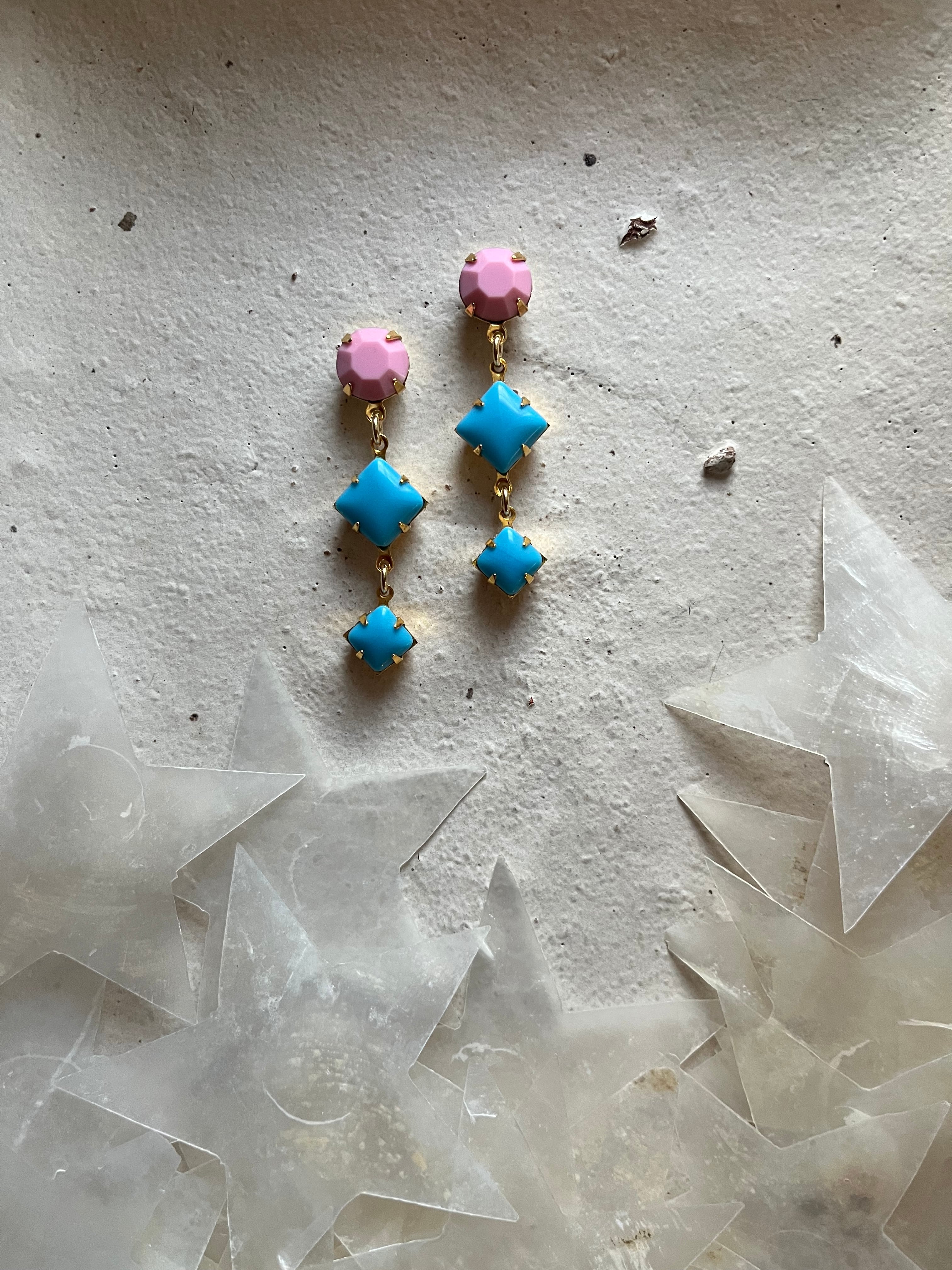 トップはイチゴミルクのような透明感の無い少し大人っぽいピンク。最高にかわいい発色のターコイズに近いブルーとのコントラストをシンプルに楽しんでいただきたくて制作しました。