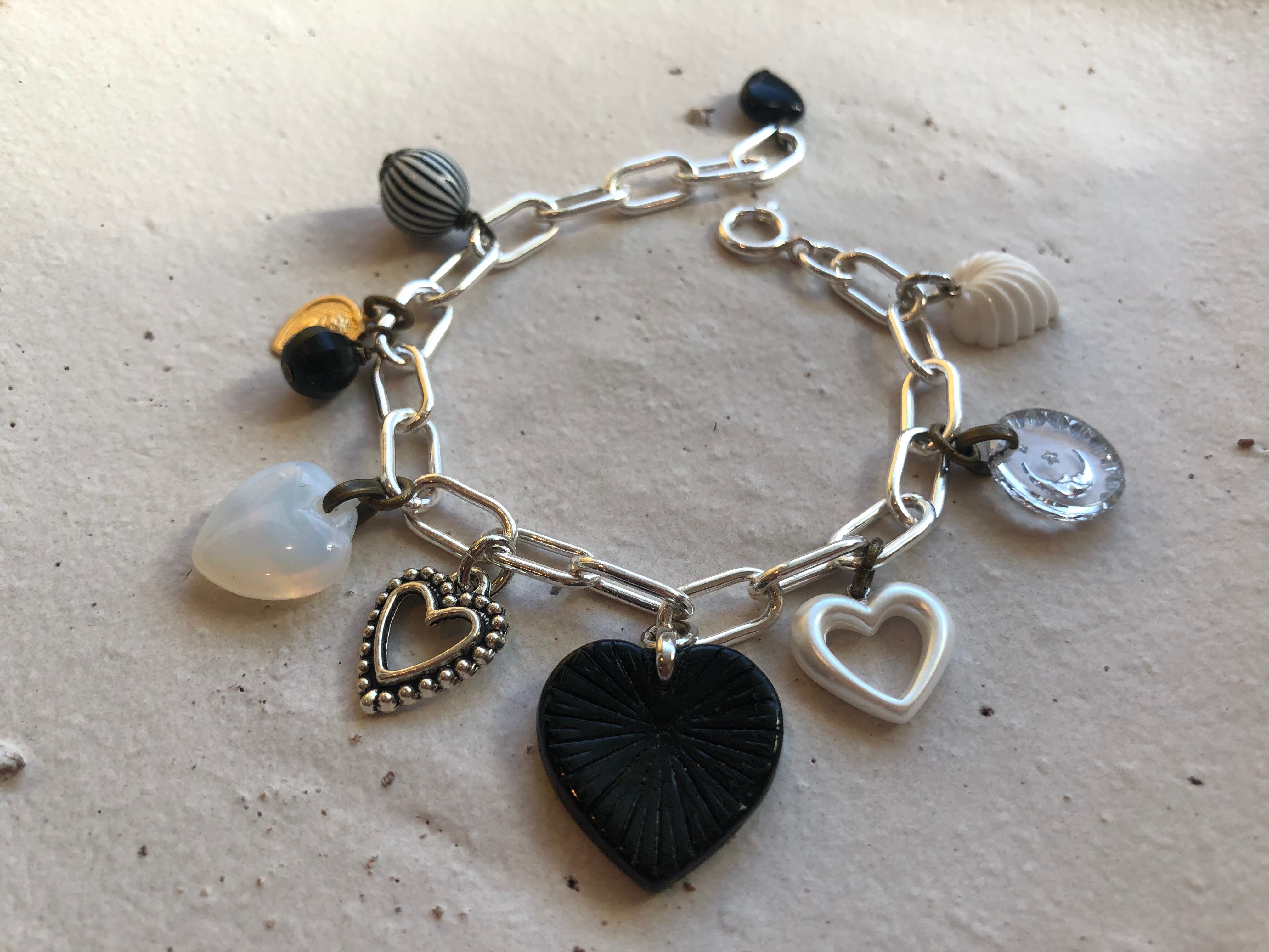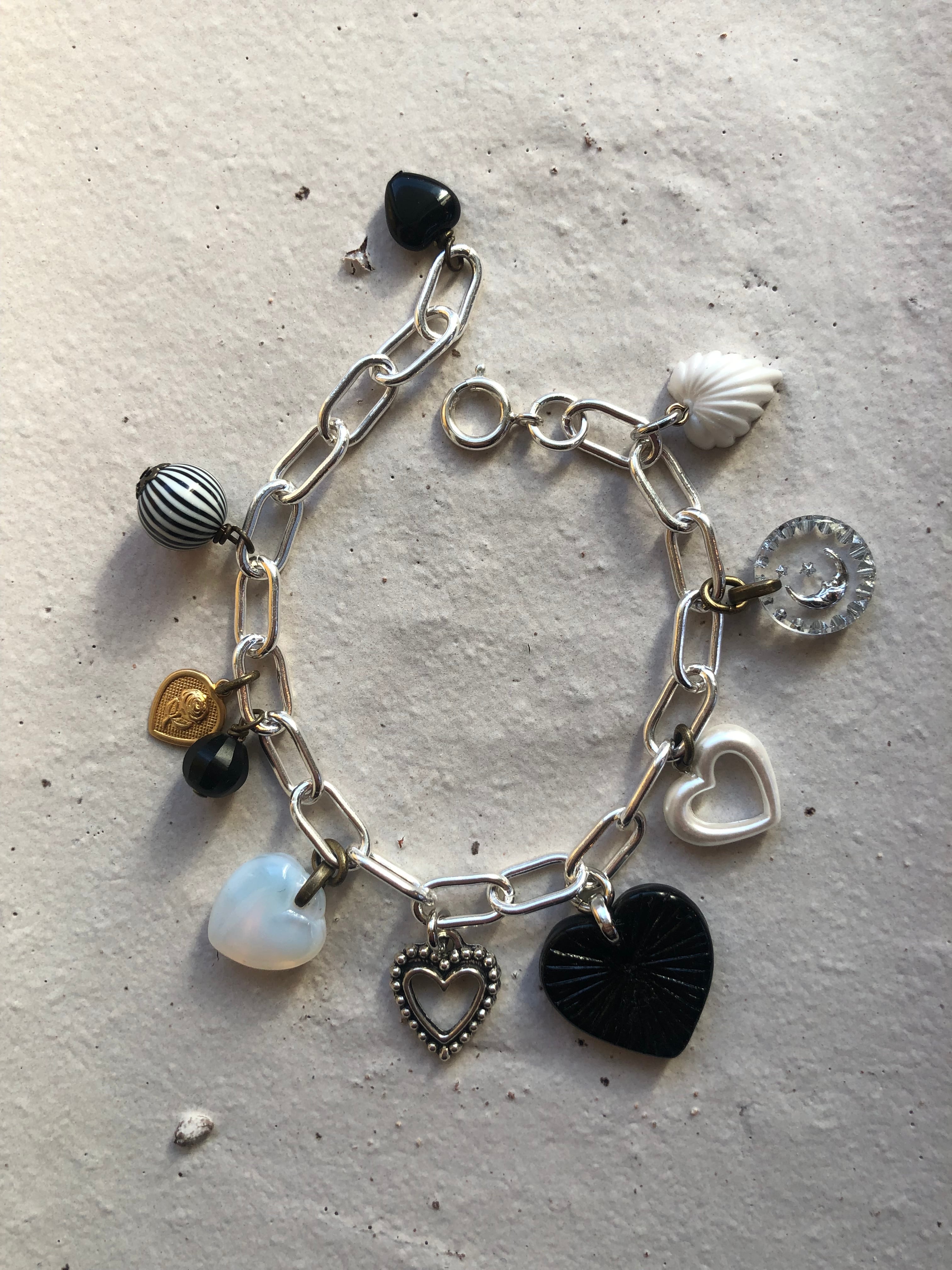 ブラックとホワイトのハートモチーフをメインにしたチャームブレスレット。ハートだけだと甘くなるのでストライプやアンティークのボールビーズも入れました。