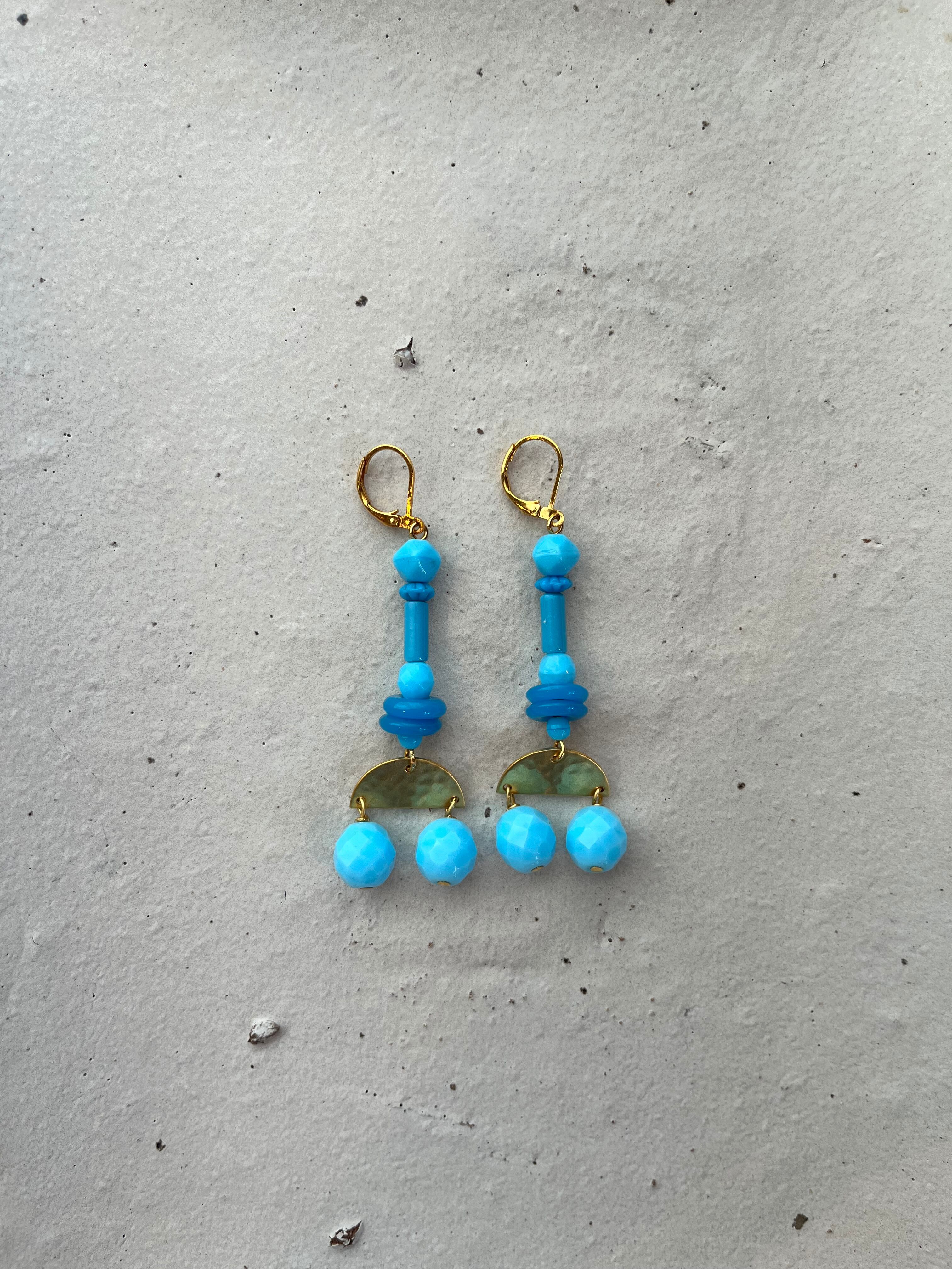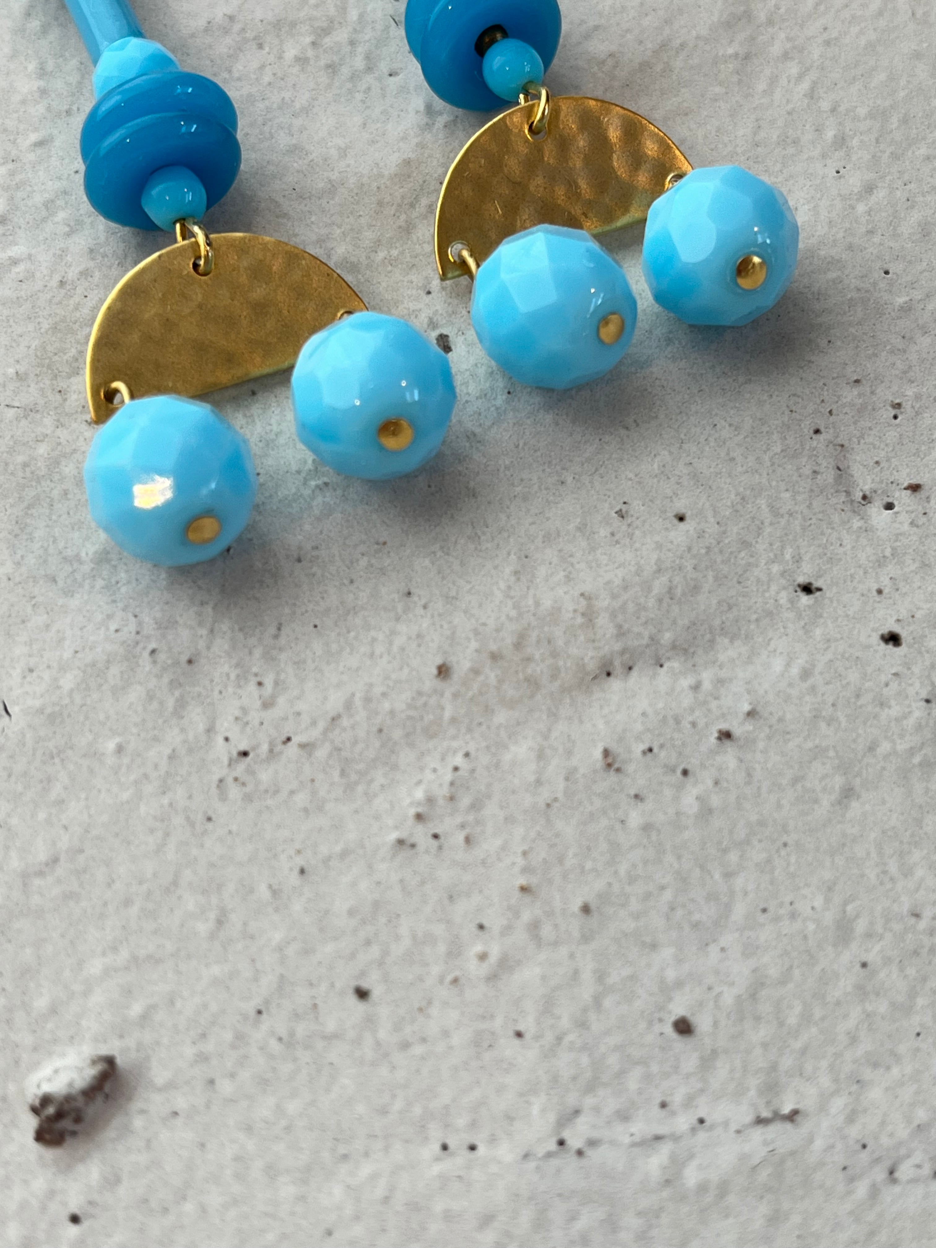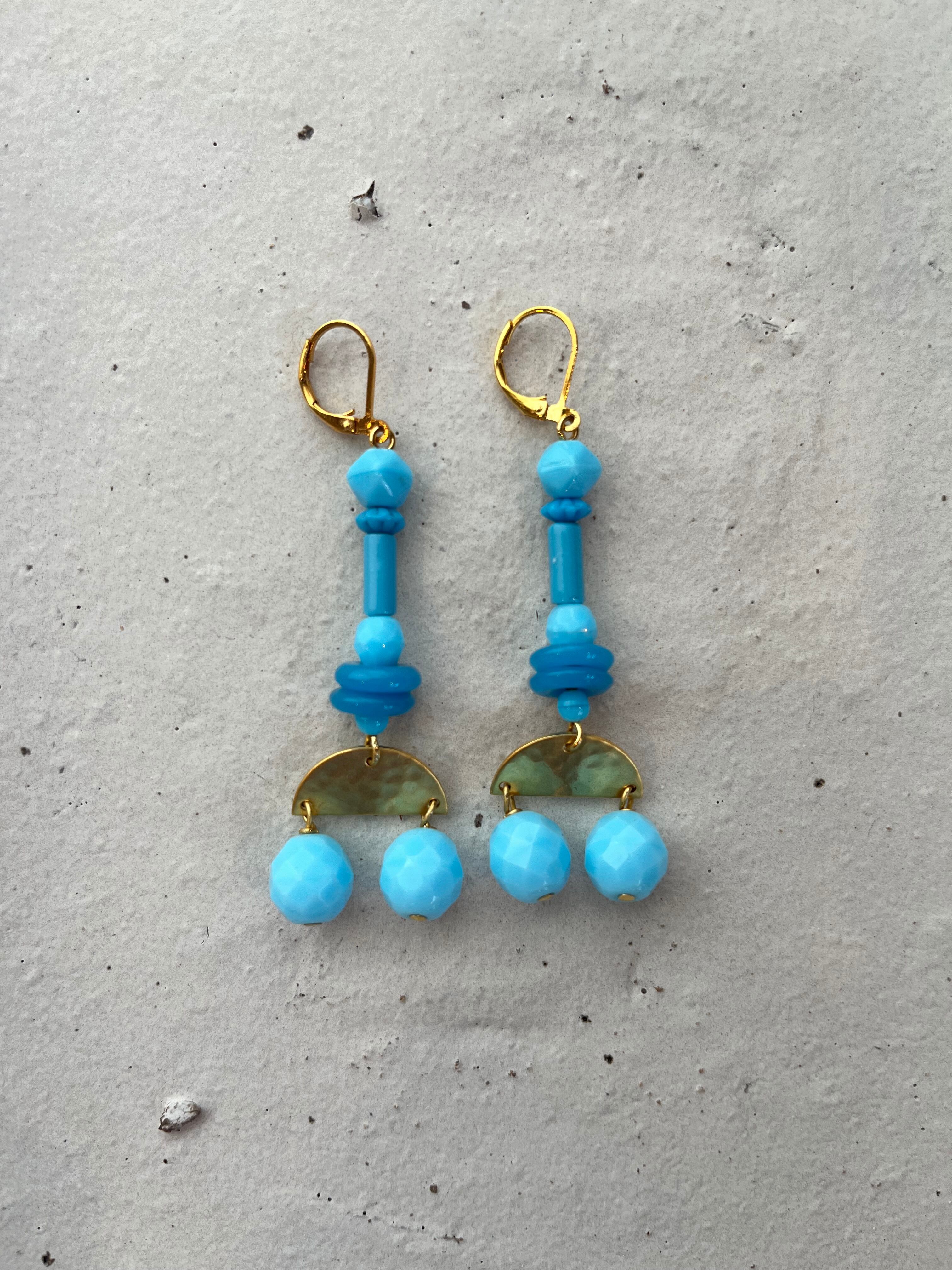 ◆作られた時代も作られた国もばらばらの美しい発色のスカイブルーのビーズとアメリカ製の半月型メタルパーツを組み合わせてピアスに仕上げました。それぞれのビーズが個性豊かでヴィンテージや現代のものもあります。発色の良さはありますが上品で本当に素敵です。色ものを身につけたくなる暖かい季節にはもちろんですが、洋服の色が落ち着く寒い季節のワンポイントとしても楽しんでご着用していただけます。