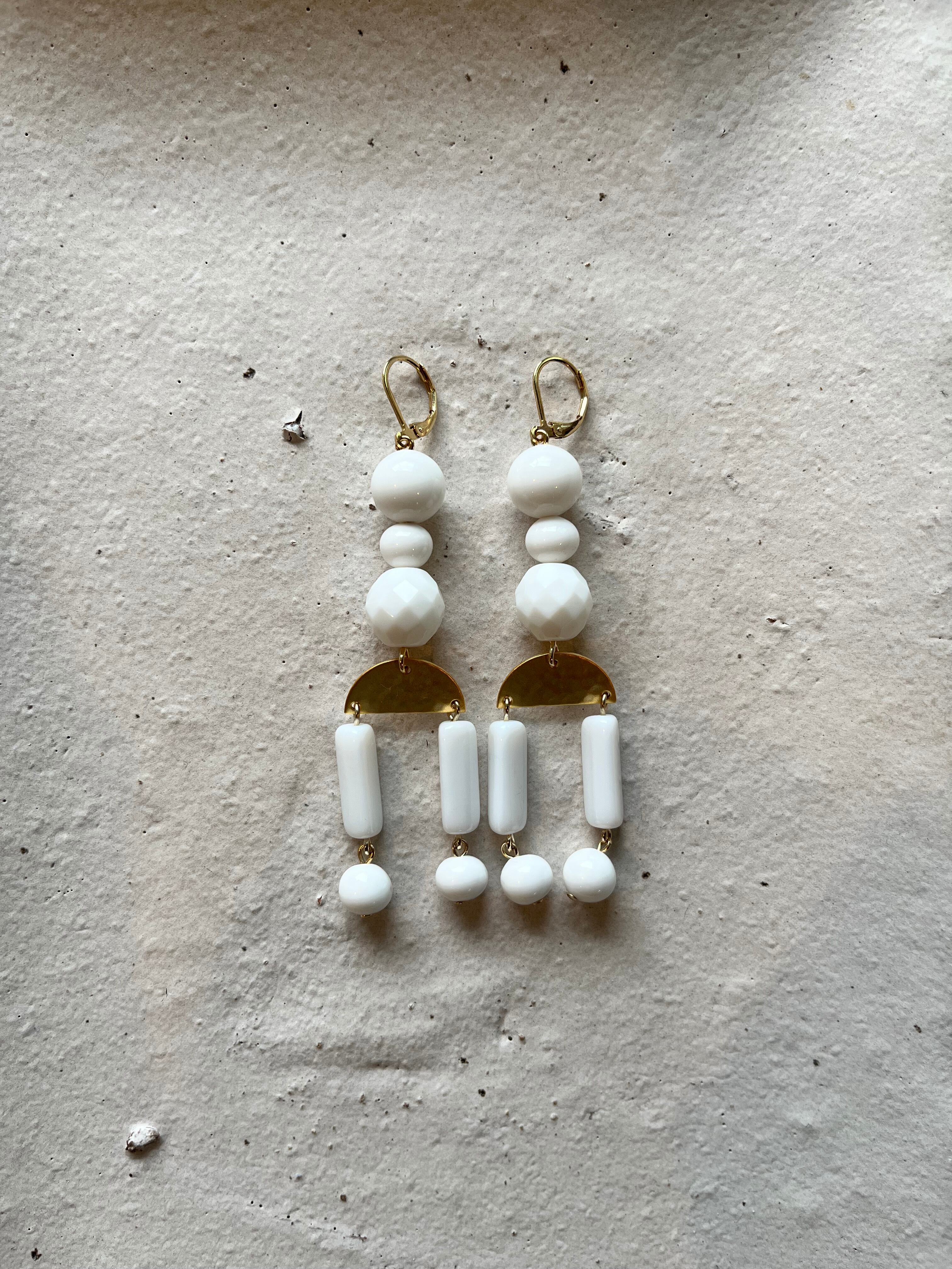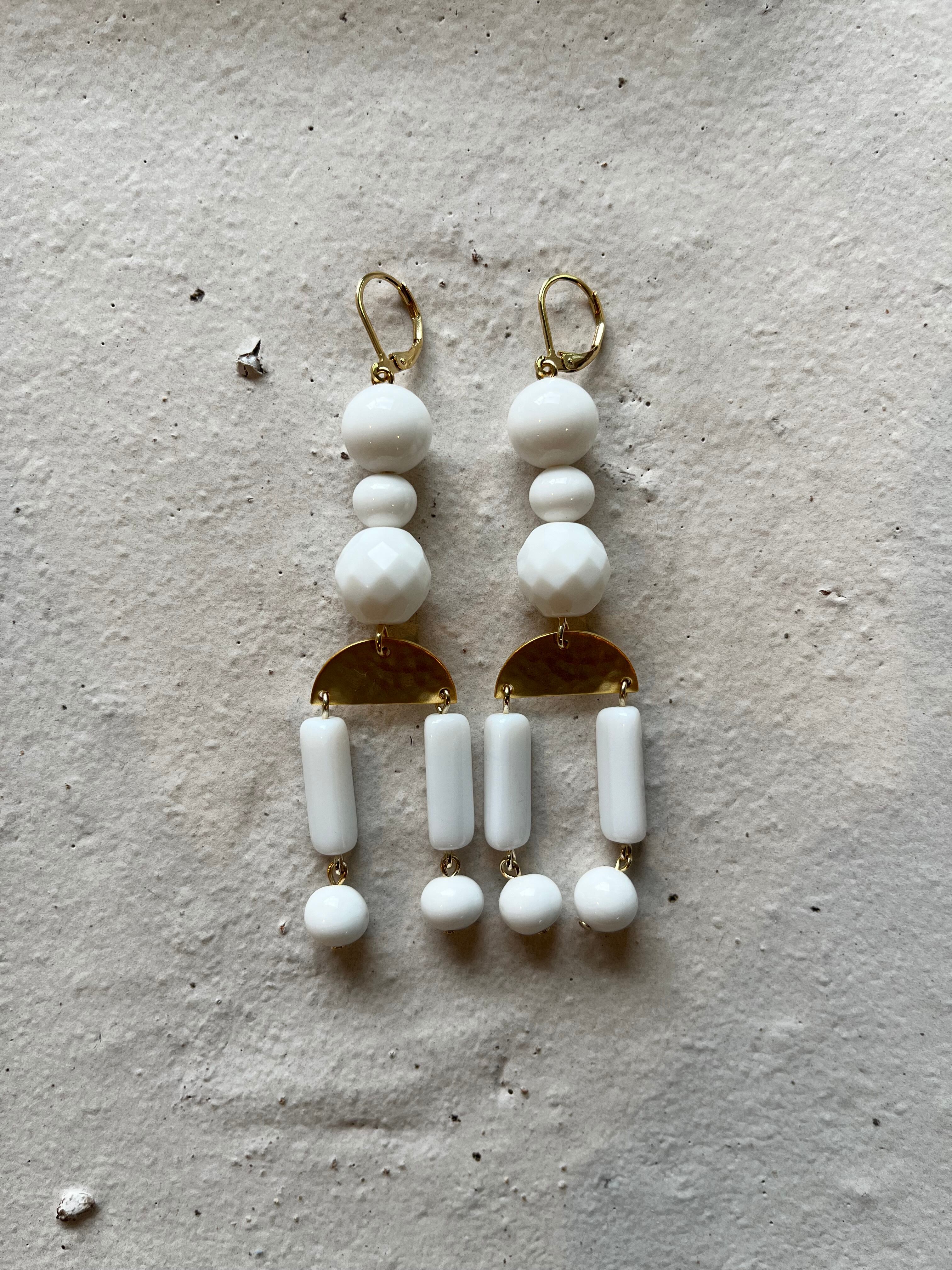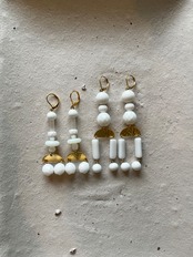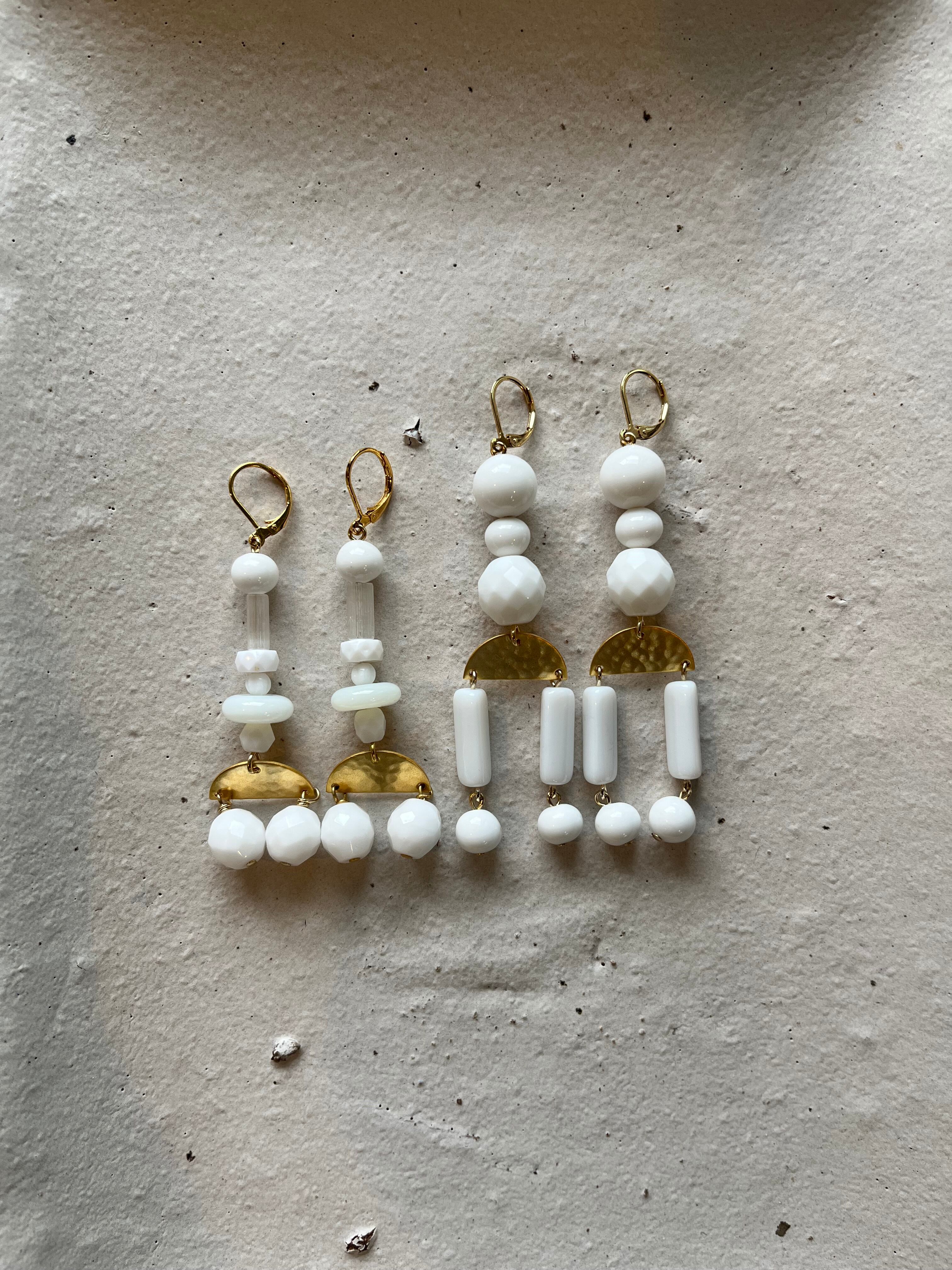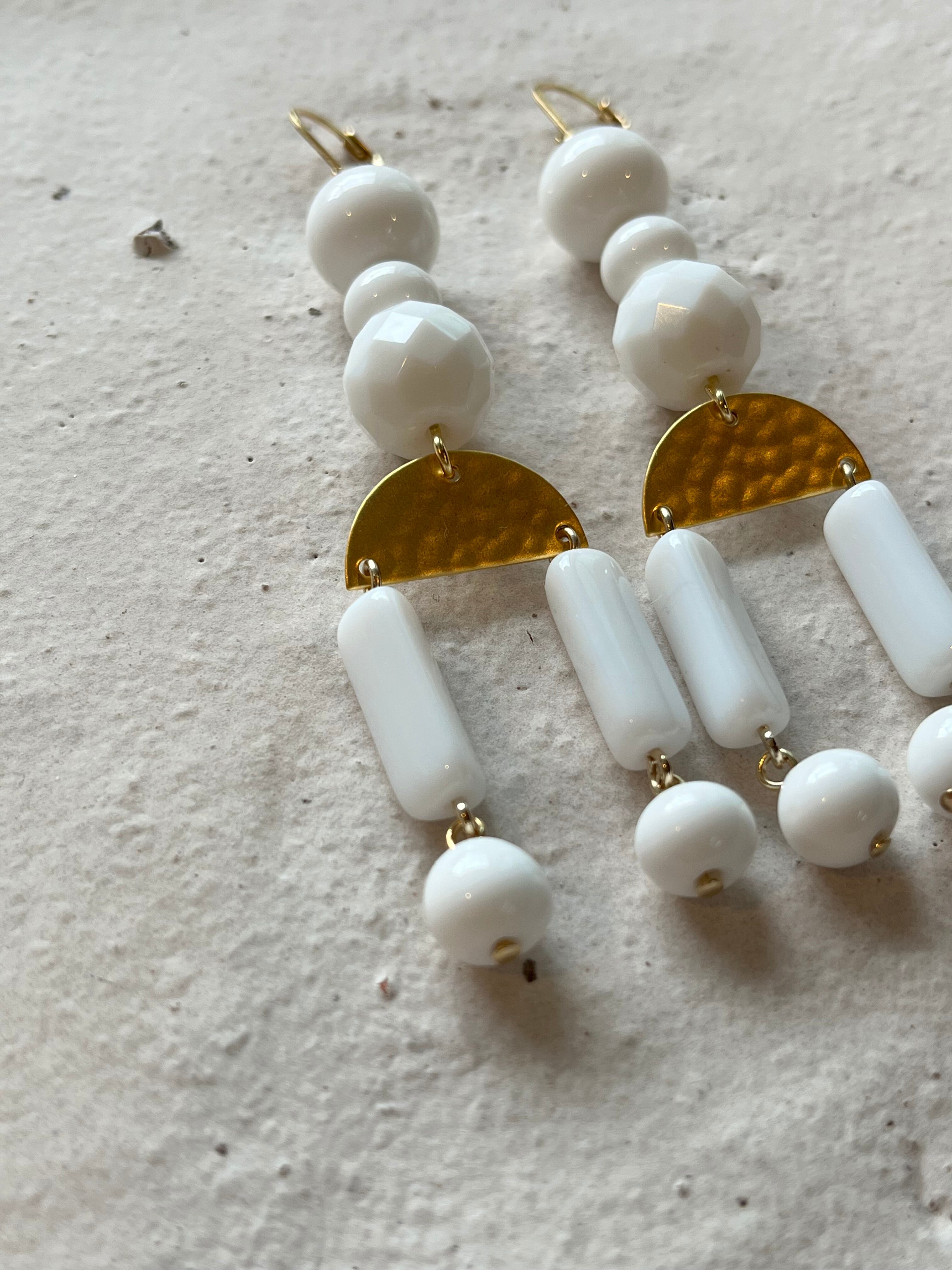 ◆作られた時代も作られた国も様々な美しい発色のホワイトのビーズとアメリカ製の半月型メタルパーツを組み合わせてピアスに仕上げました。それぞれのビーズが個性豊かでヴィンテージのものも現代のものもあります。発色の良さはありますが上品で本当に素敵です。色ものを身につけたくなる暖かい季節にはもちろんですが、洋服の色が落ち着く寒い季節のワンポイントとしても楽しんでご着用していただけます。