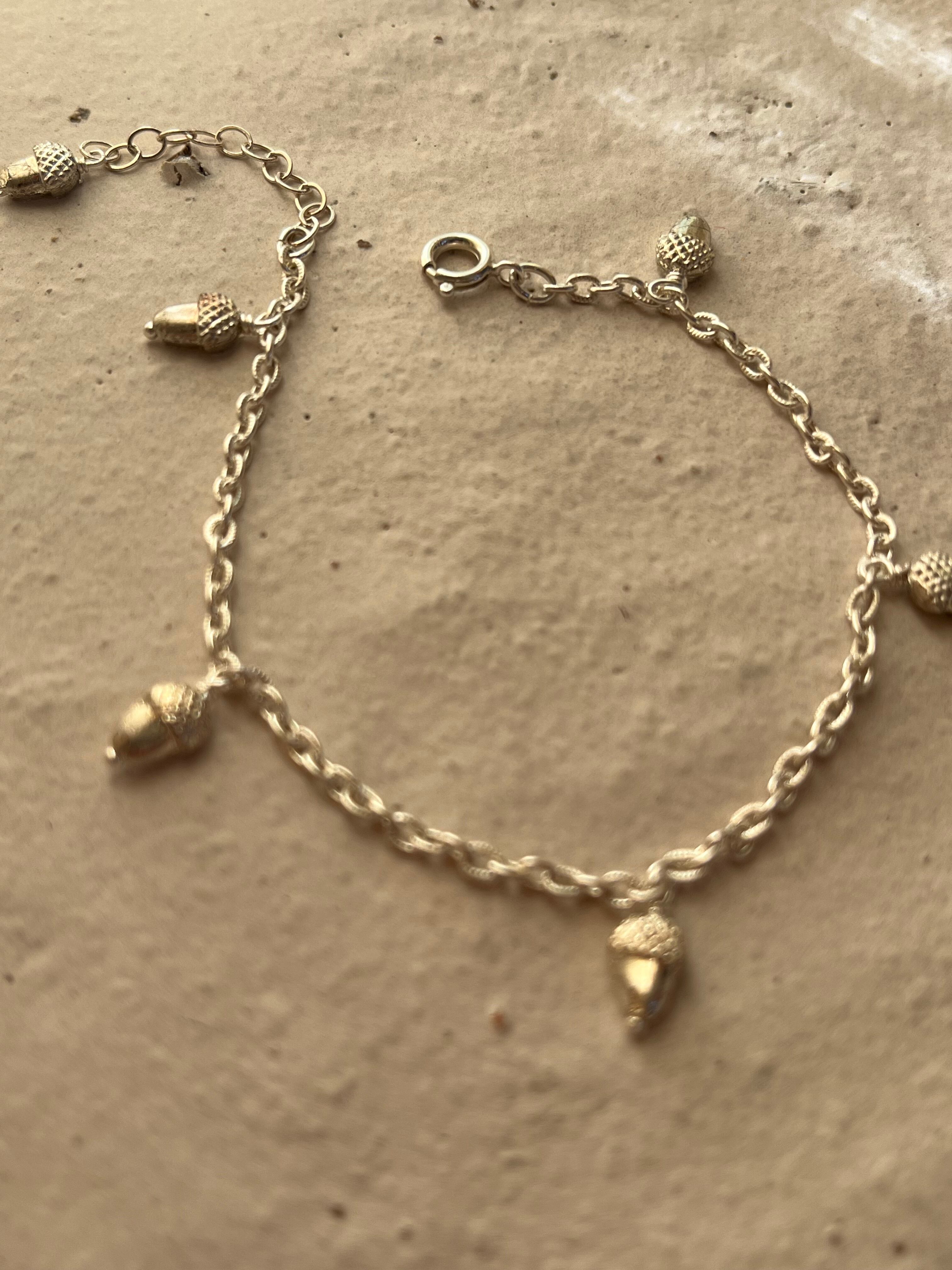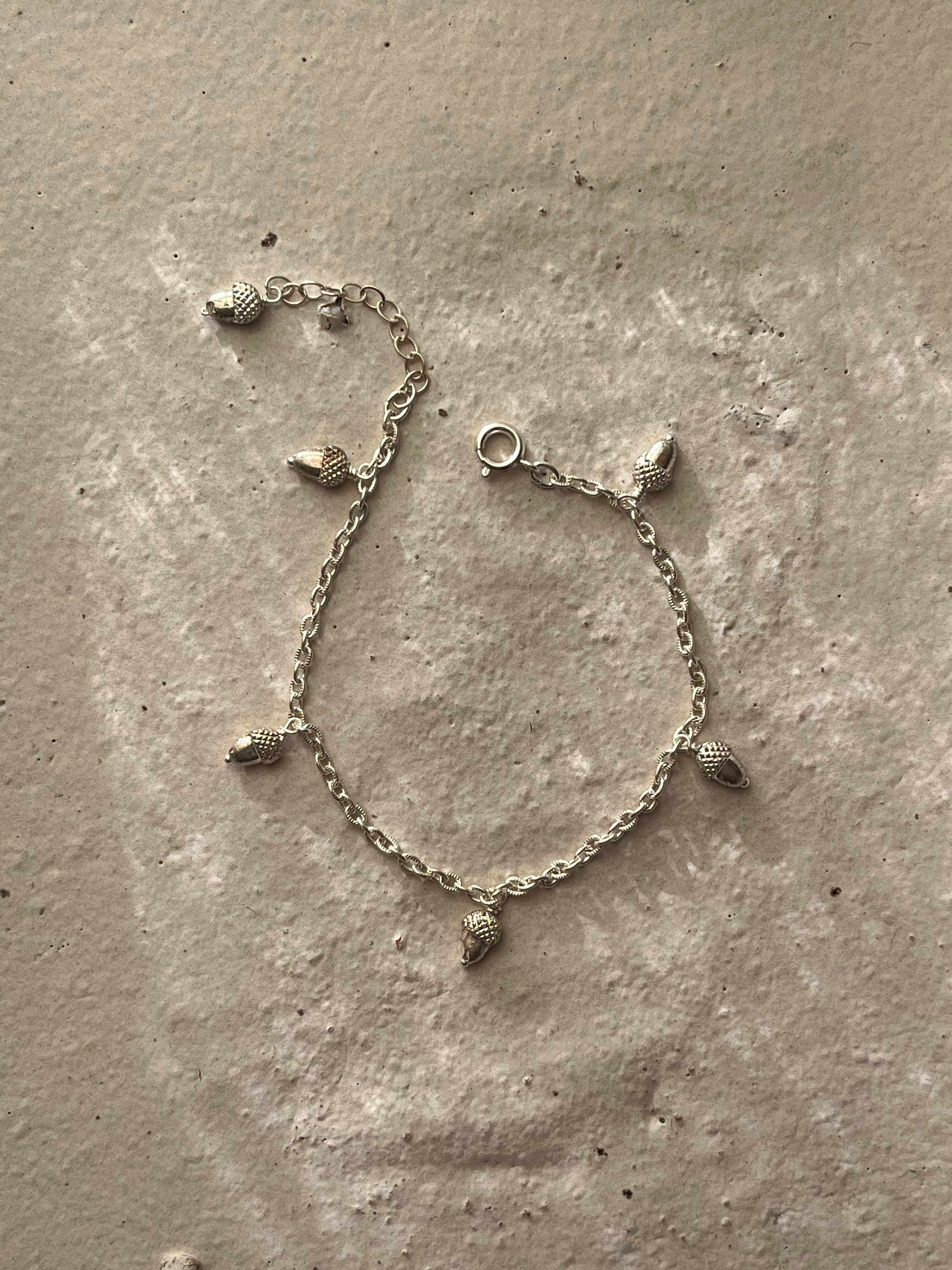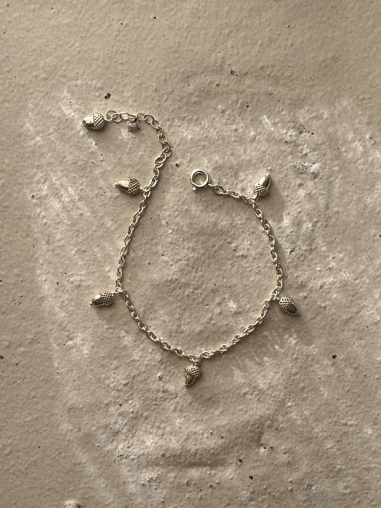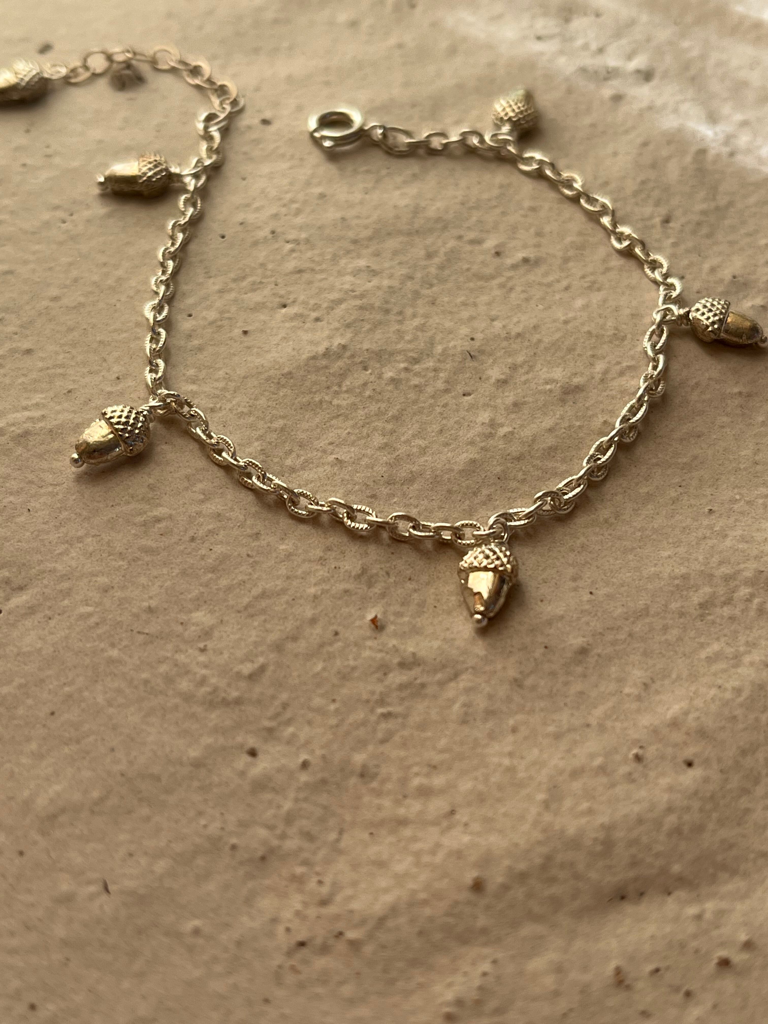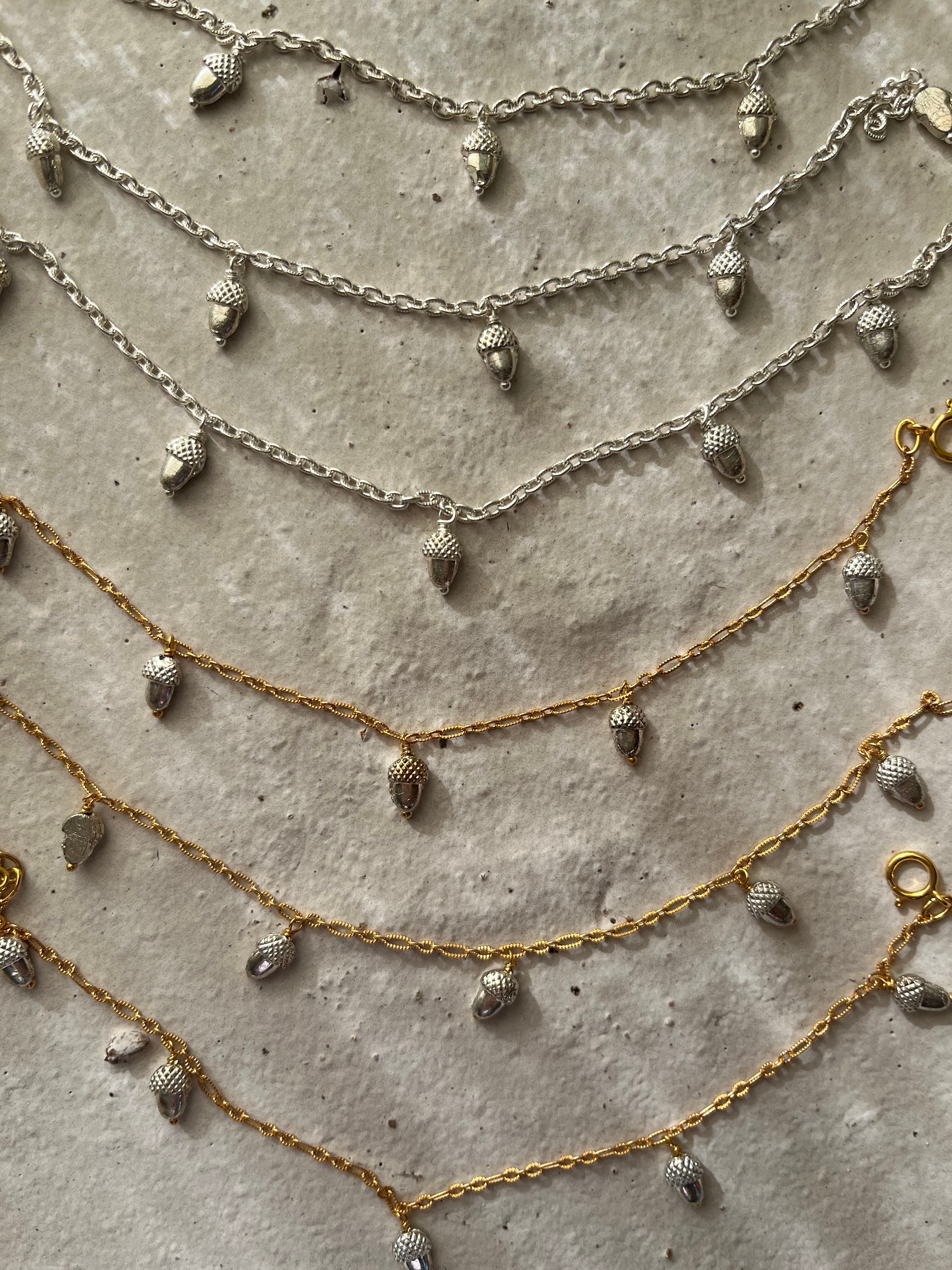 silver925と14kgf素材の華奢なチェーンにフランスヴィンテージの小さな小さなどんぐりのガラスビーズを下げました。どんぐりはガラスビーズにコーティングされているため経年でコーティングが剥げてはきます。