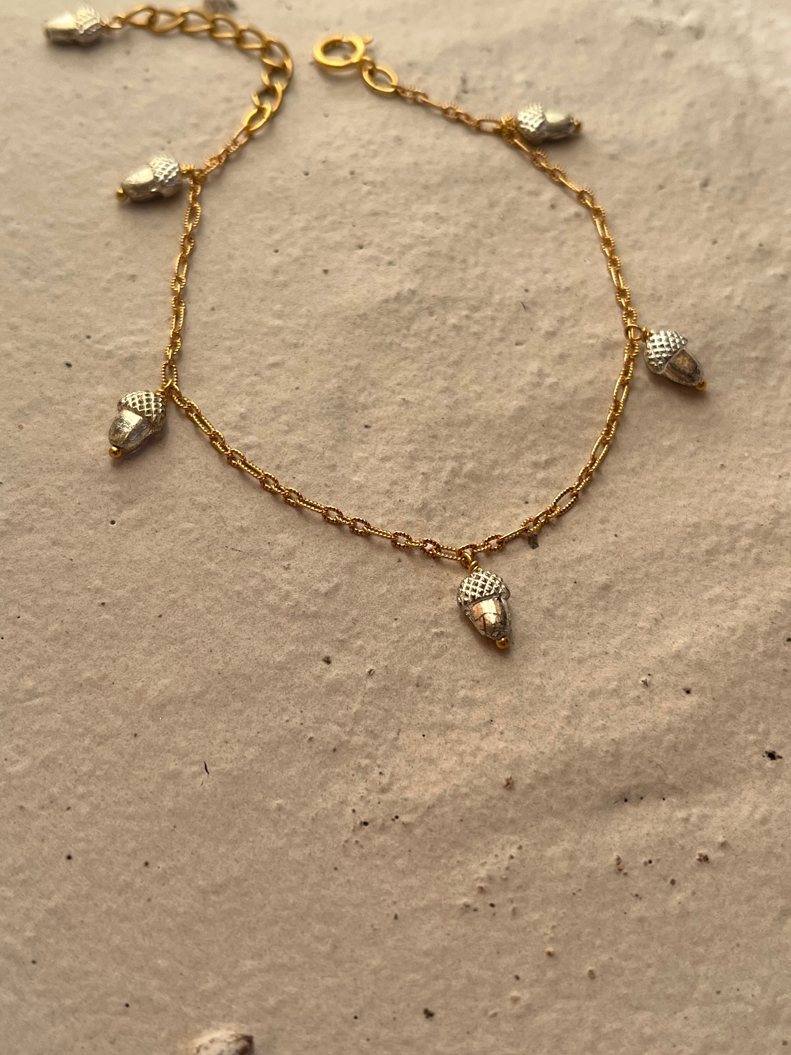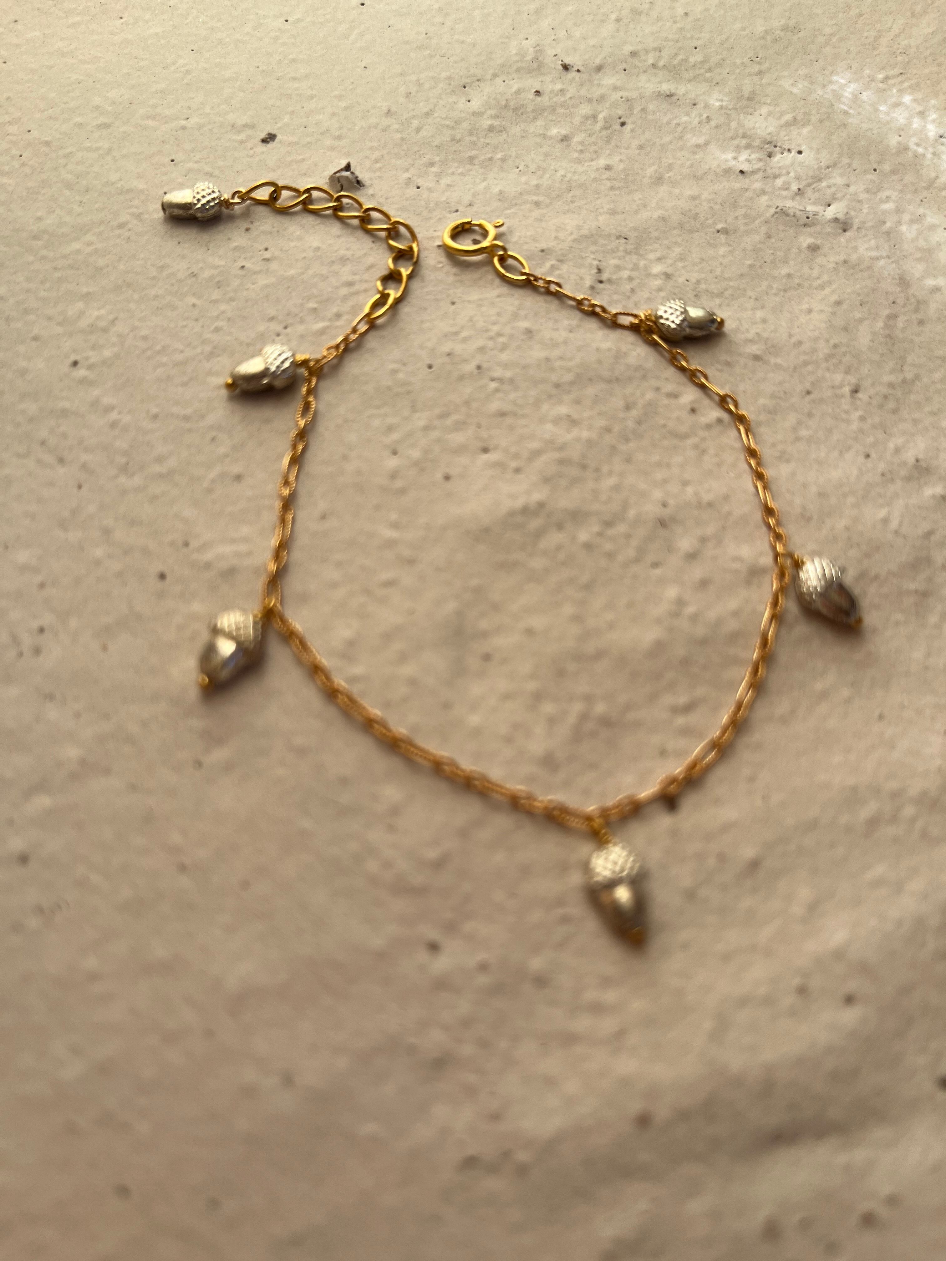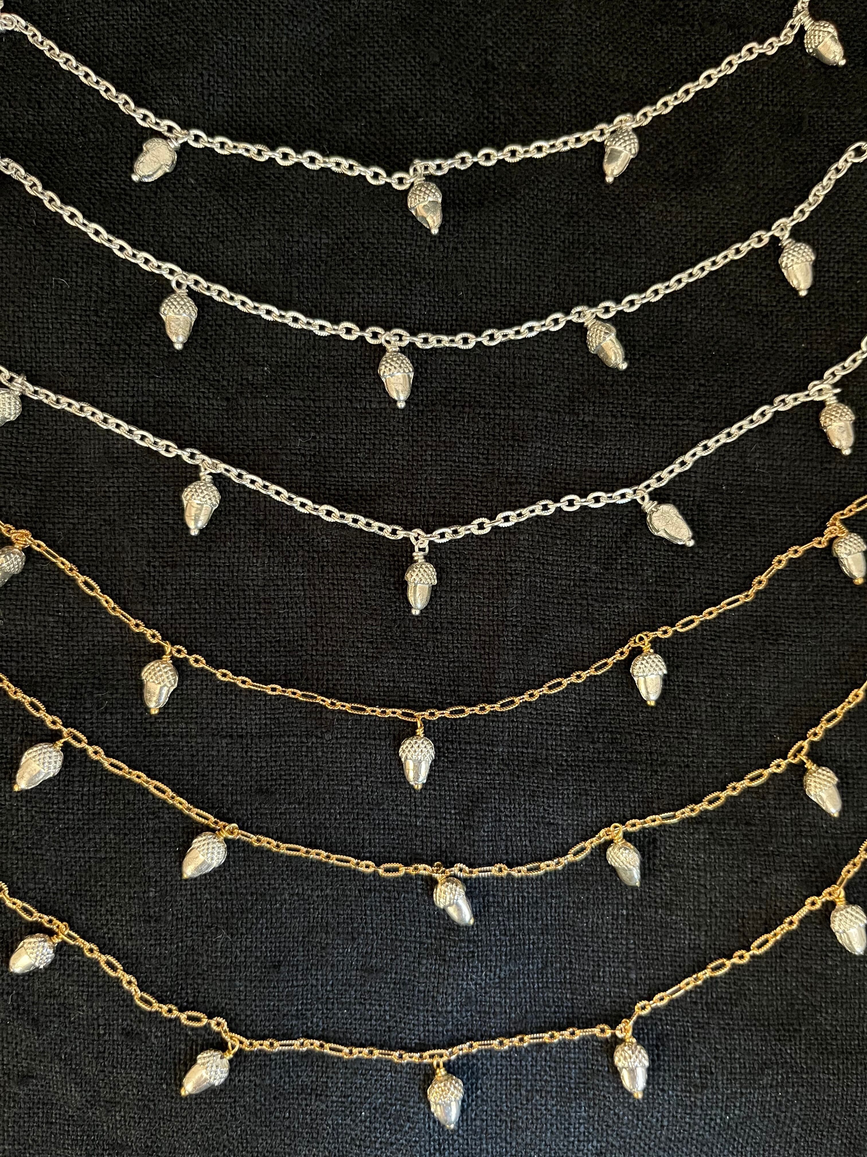 14kgf素材の華奢なチェーンにフランスヴィンテージの小さな小さなどんぐりのガラスビーズを下げました。チェーンはゴールドカラー、どんぐりはシルバーカラーになります。どんぐりはガラスビーズにコーティングされているため経年でコーティングが剥げてはきます。