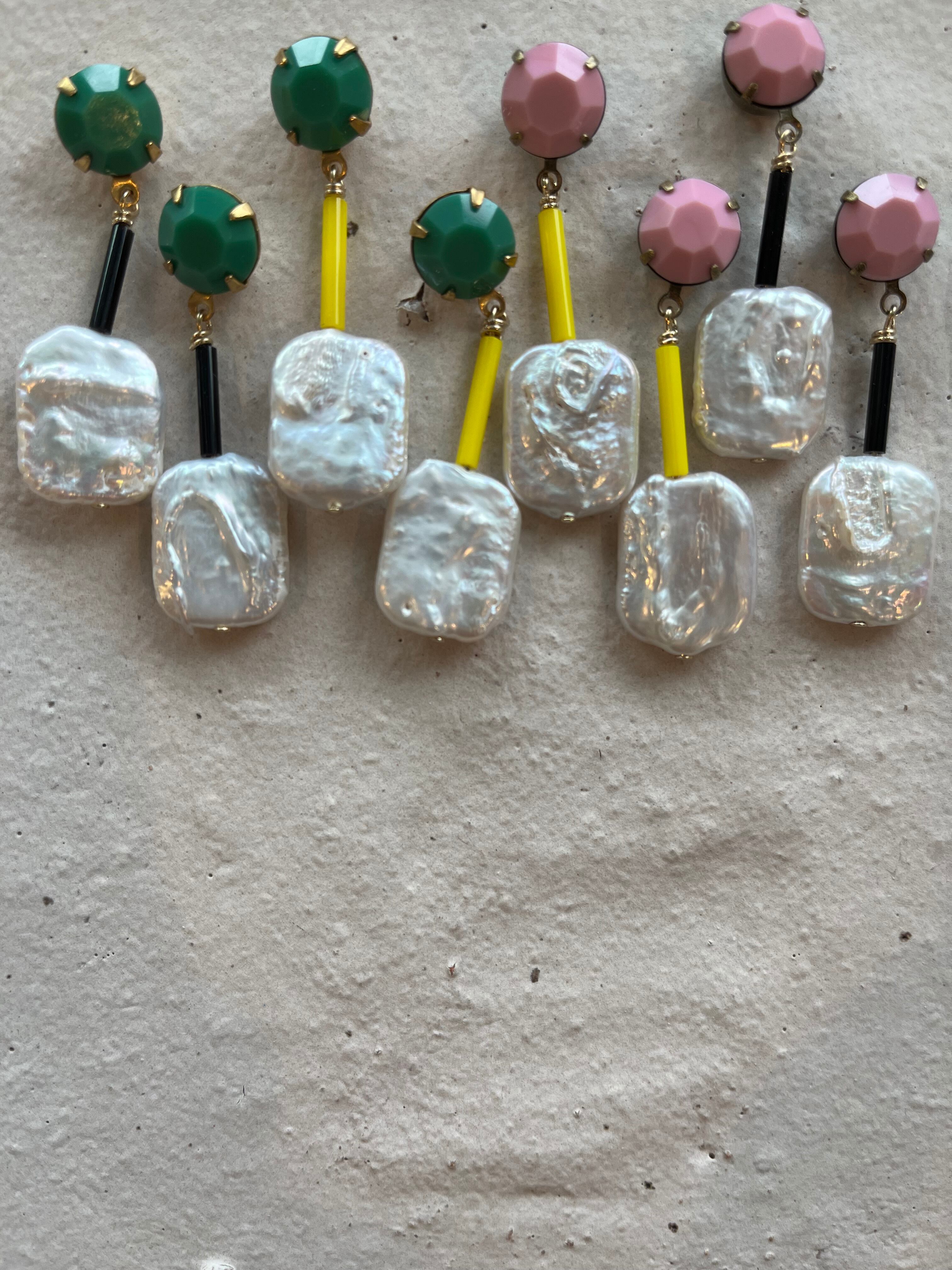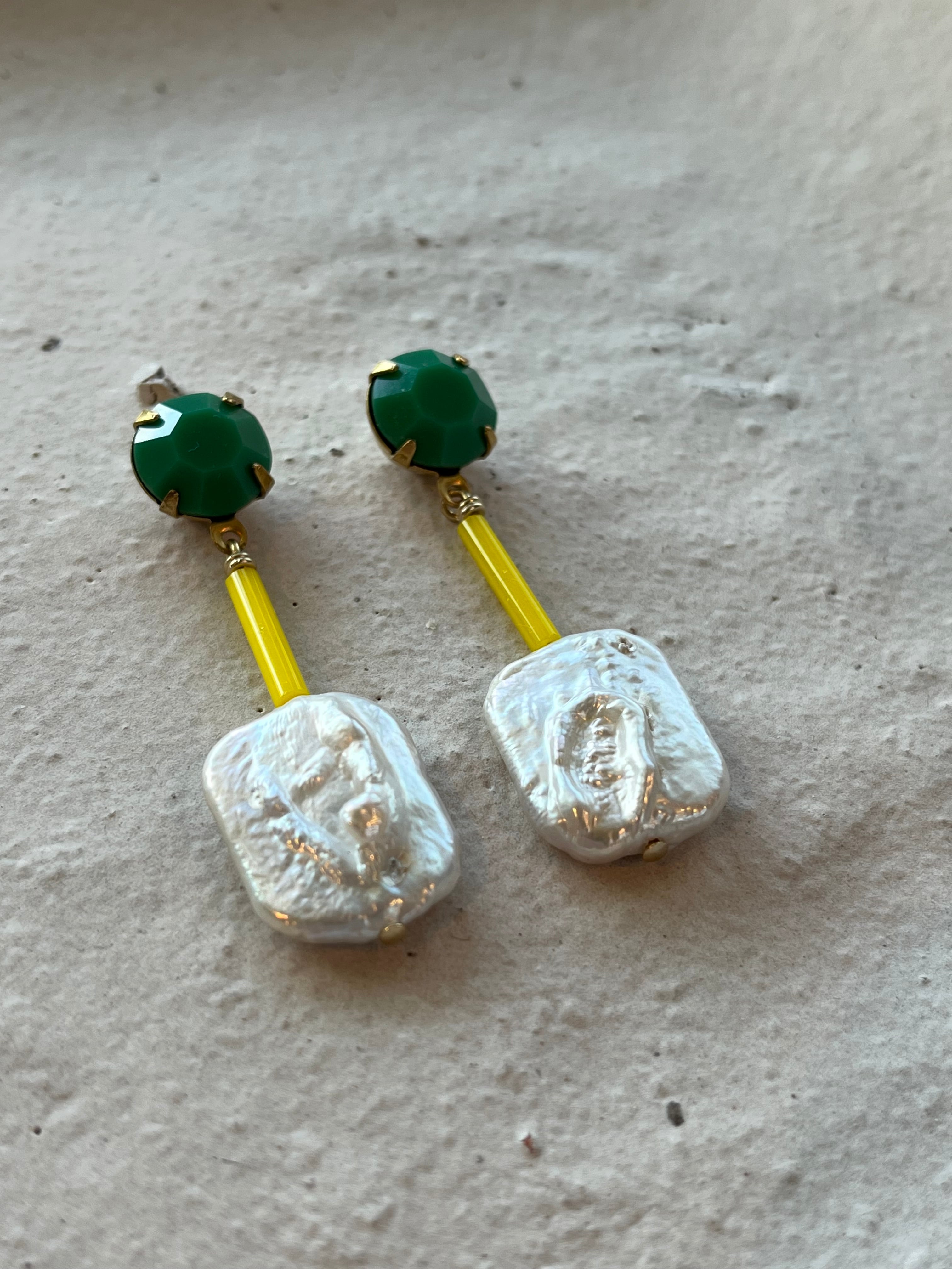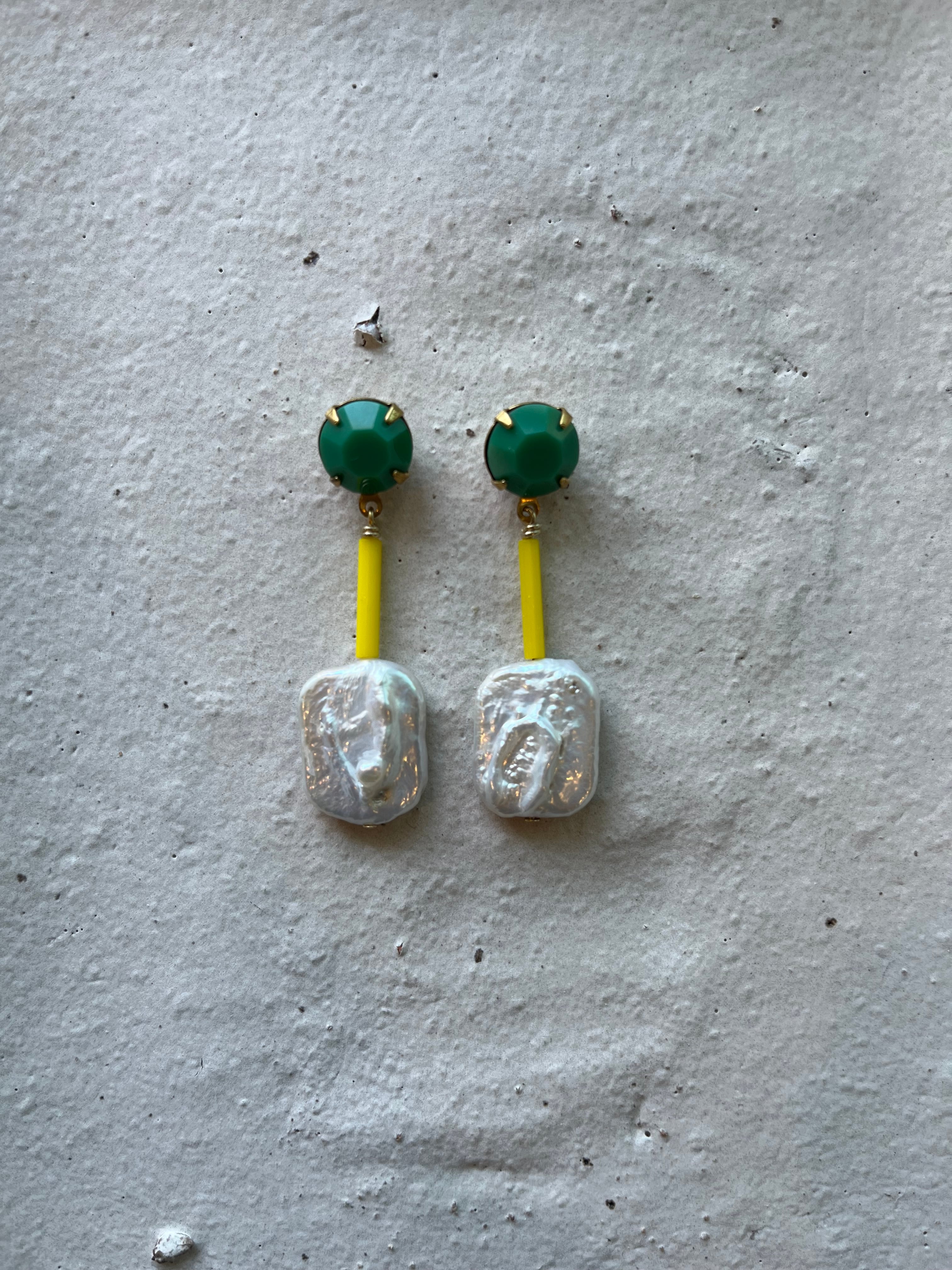 現代ビーズではなかなか見つからない発色のグリーンのガラス製カボション、同じく現代ビーズにはない長さと太さの絶妙な存在感のガラス竹ビーズ、波のうねりのような模様の入った淡水パール。