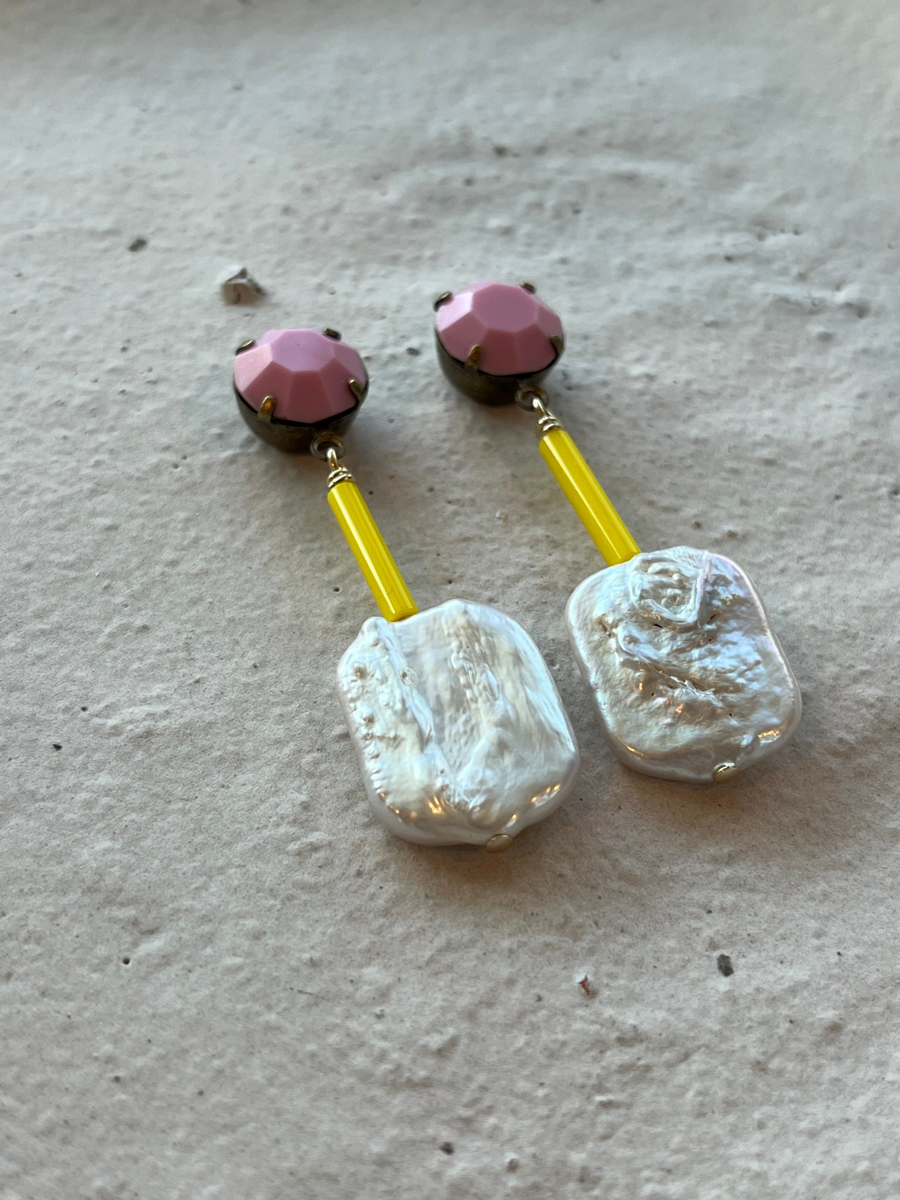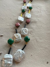 現代ビーズではなかなか見つからない落ち着いた発色のピンクのガラス製カボション、同じく現代ビーズにはない長さと太さの絶妙な存在感のガラス竹ビーズ、波のうねりのような模様の入った淡水パール。
