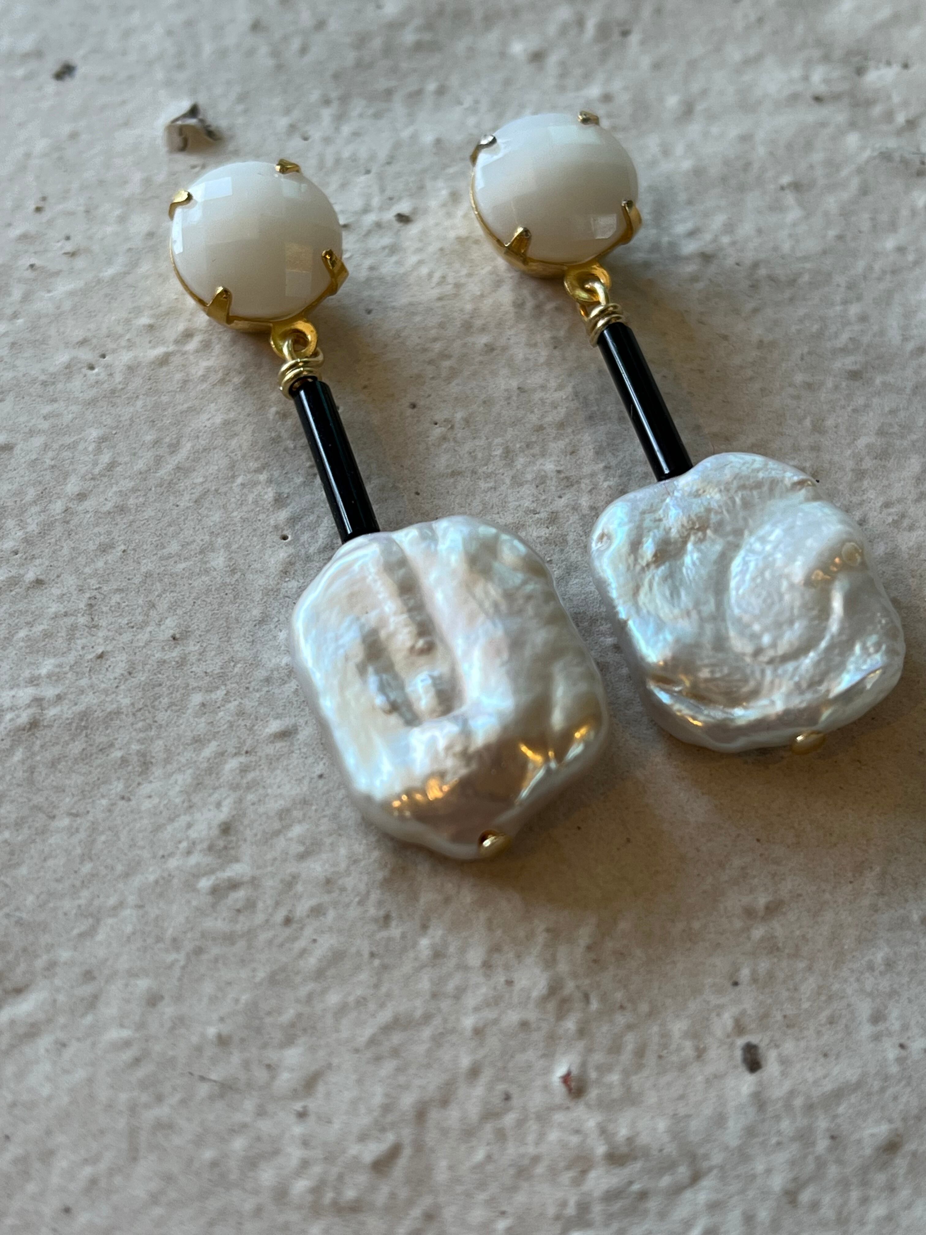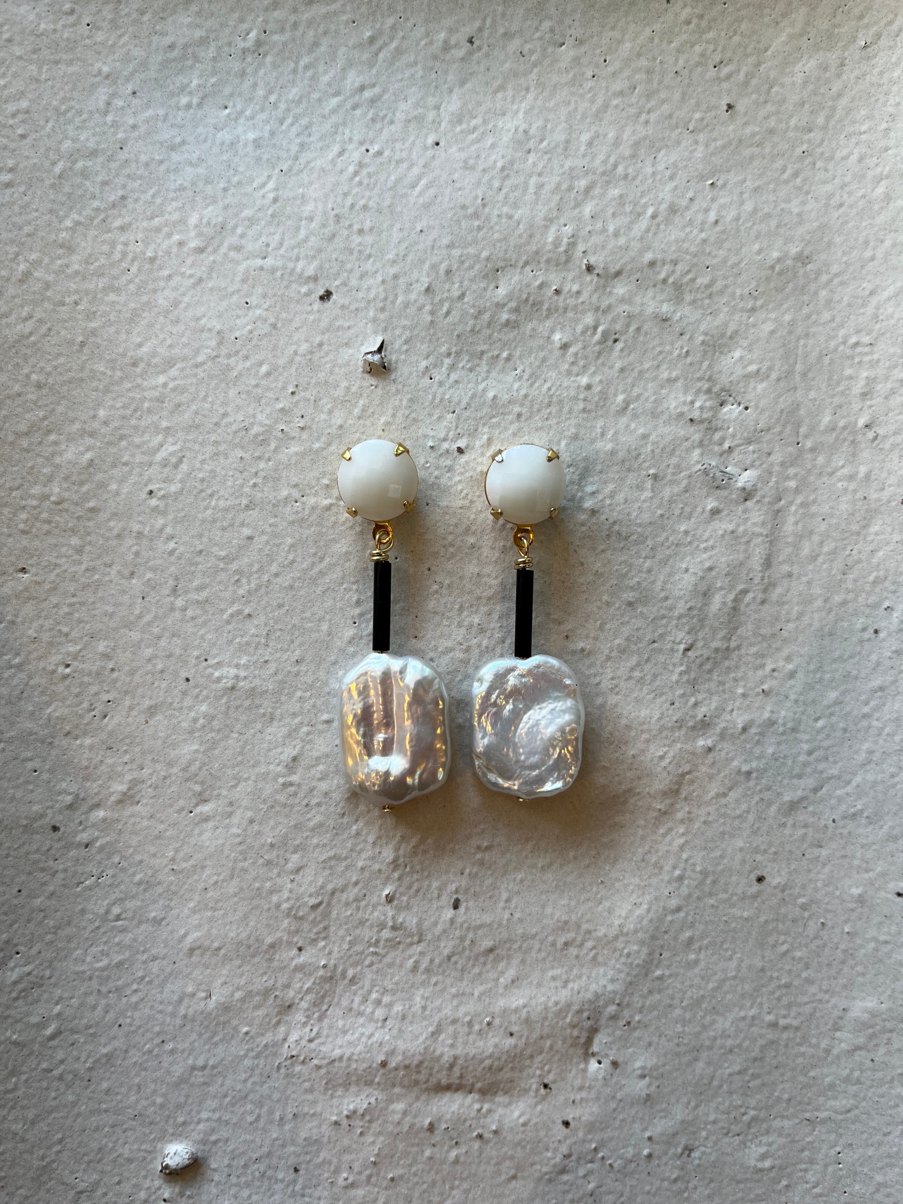 現代ビーズにはない細かなカットの入ったホワイトカラーのガラス製カボション、同じく現代ビーズにはない長さと太さの絶妙な存在感のガラス竹ビーズ、波のうねりのような模様の入った淡水パール。