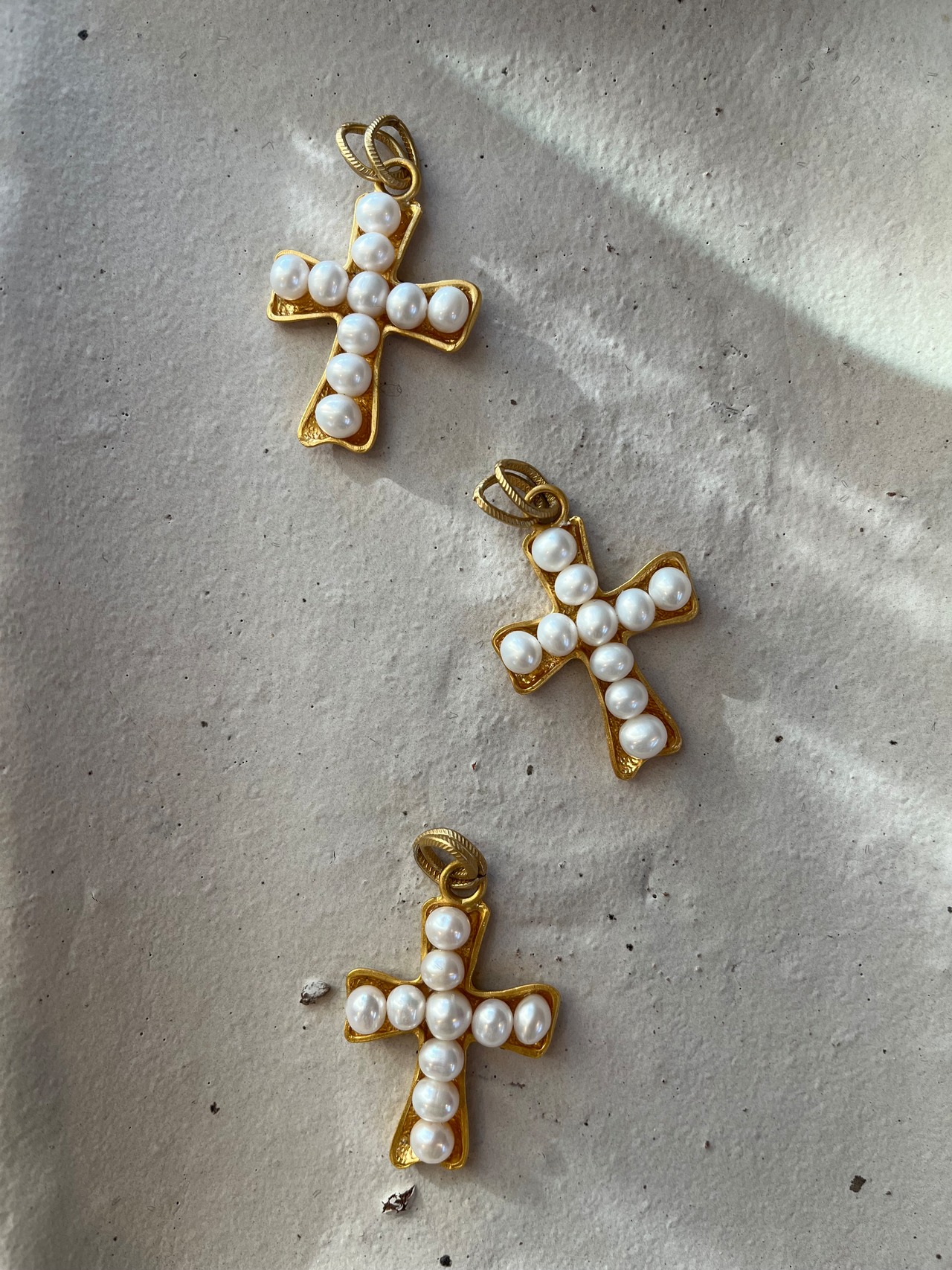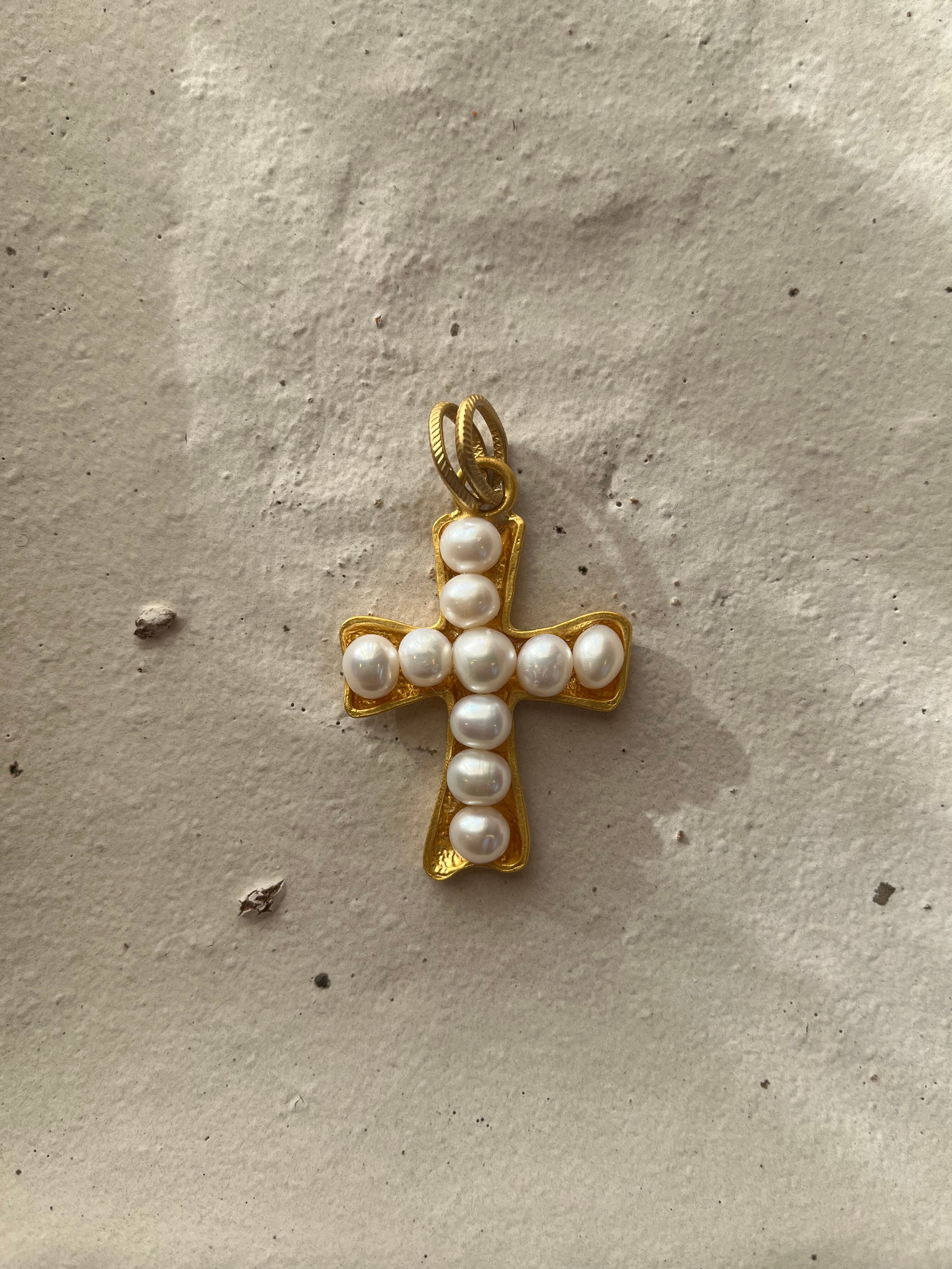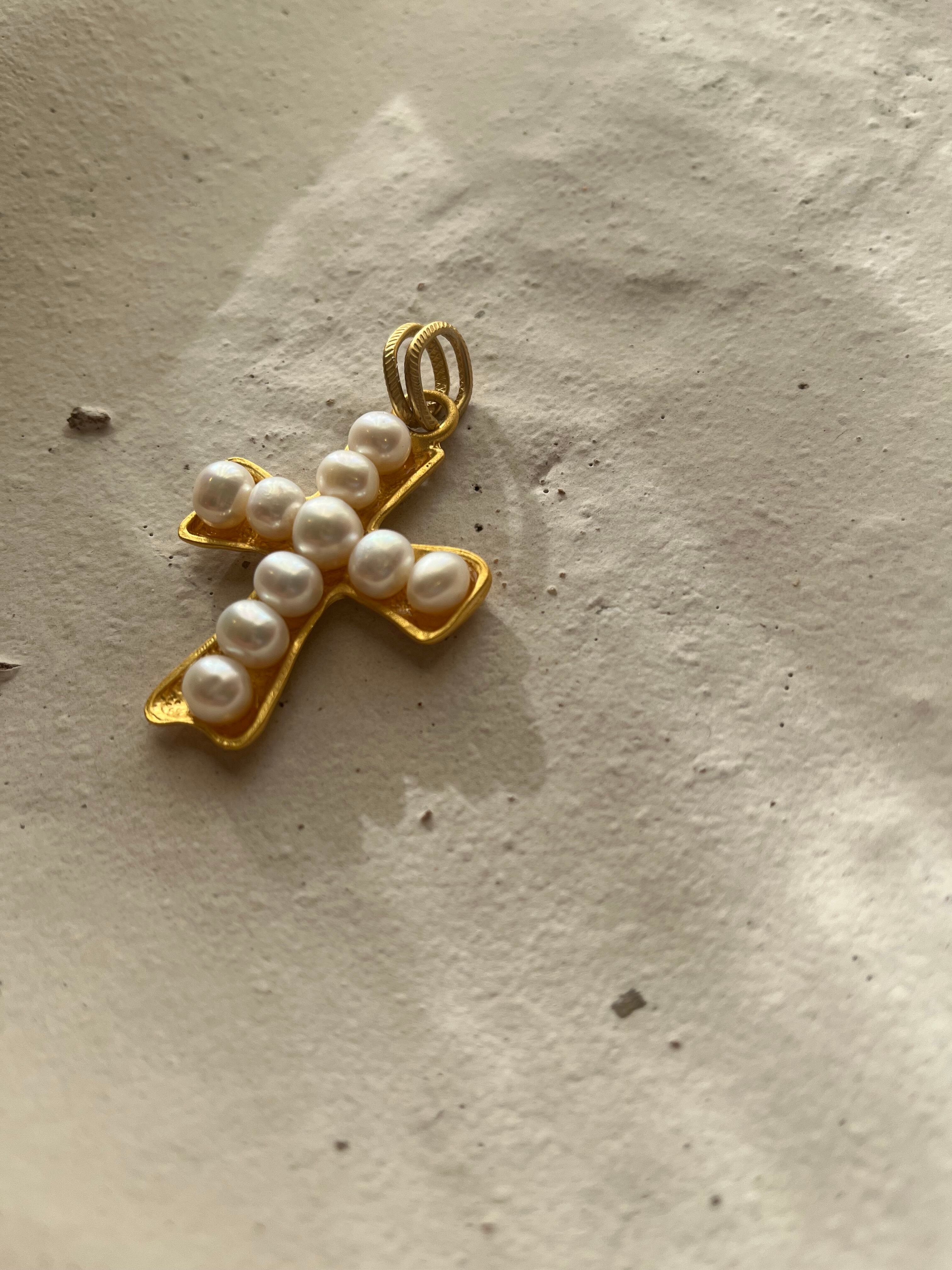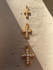 マットゴールドのしっかりとした作りのクロスパーツに淡水パールを敷き詰めた懐かしさもあり存在感もあるチャーム。淡水パールは天然素材のため個体差がございますため、素材の特性をご理解いただいた上でのご購入をお願いします。