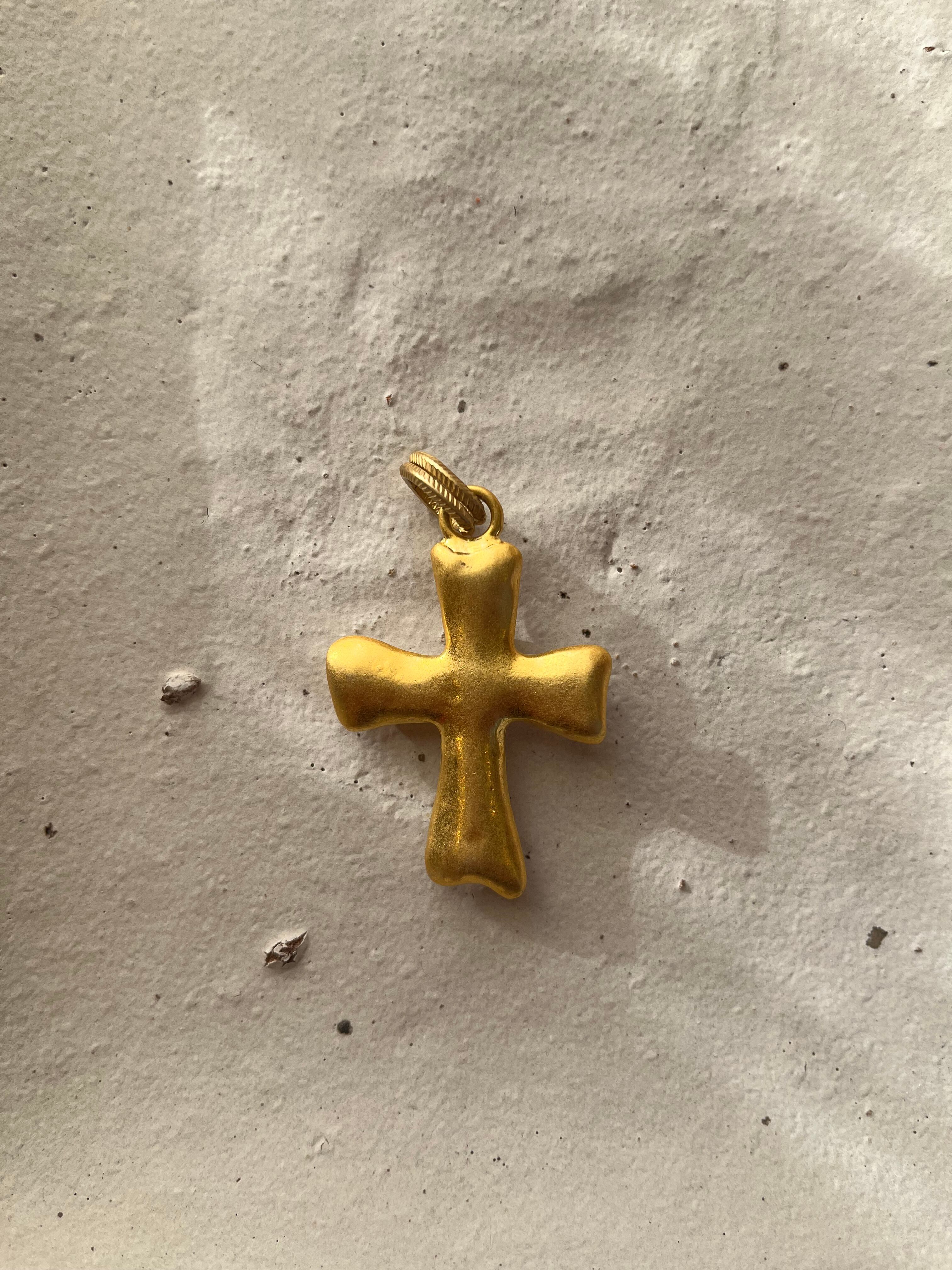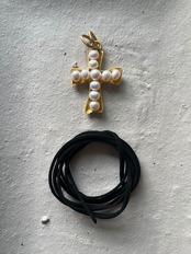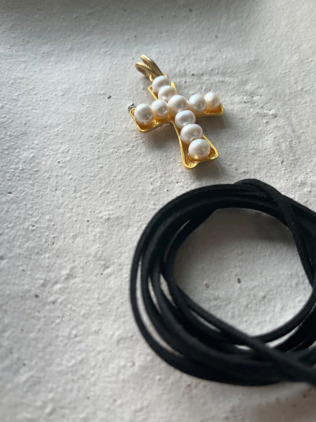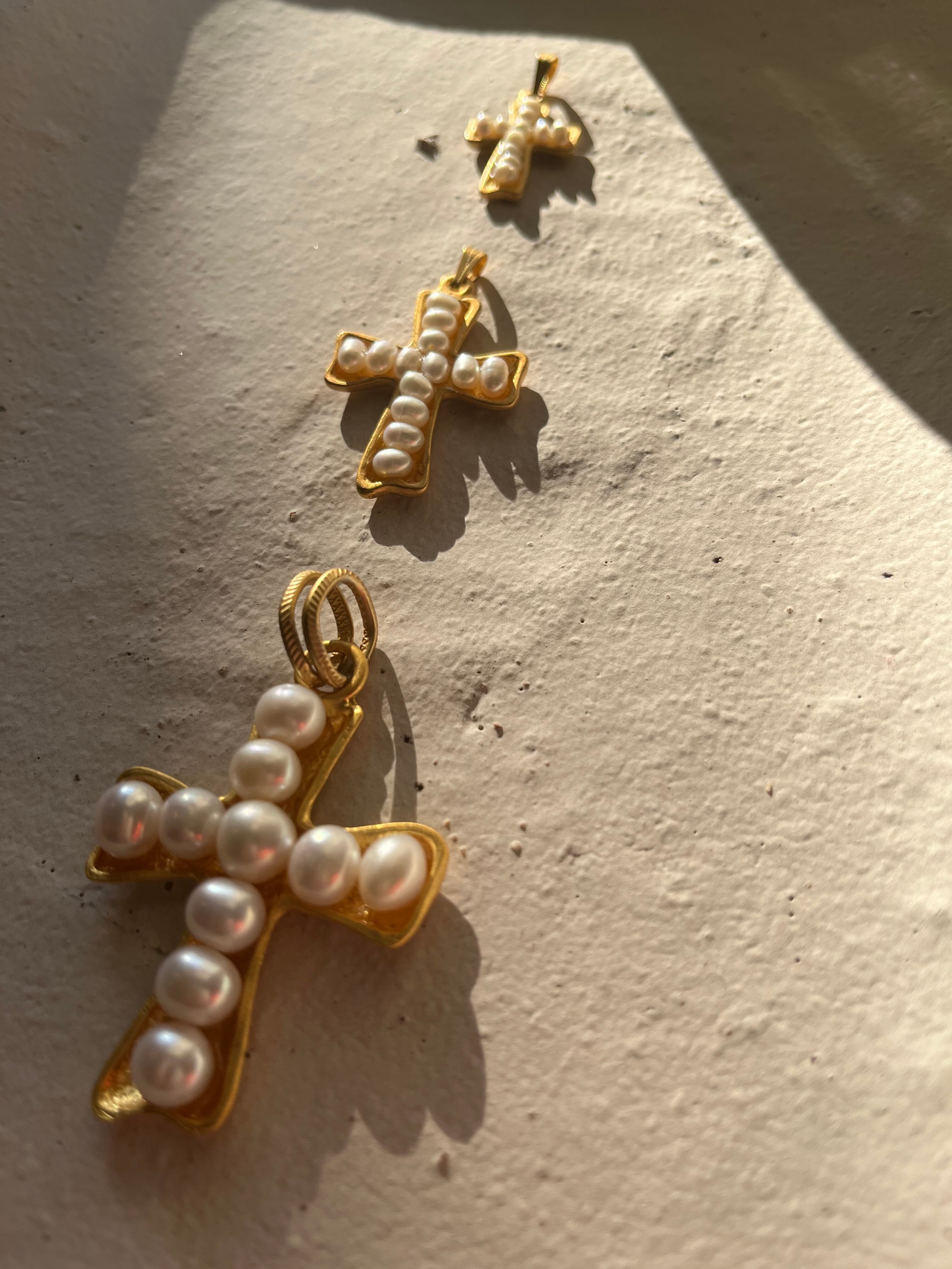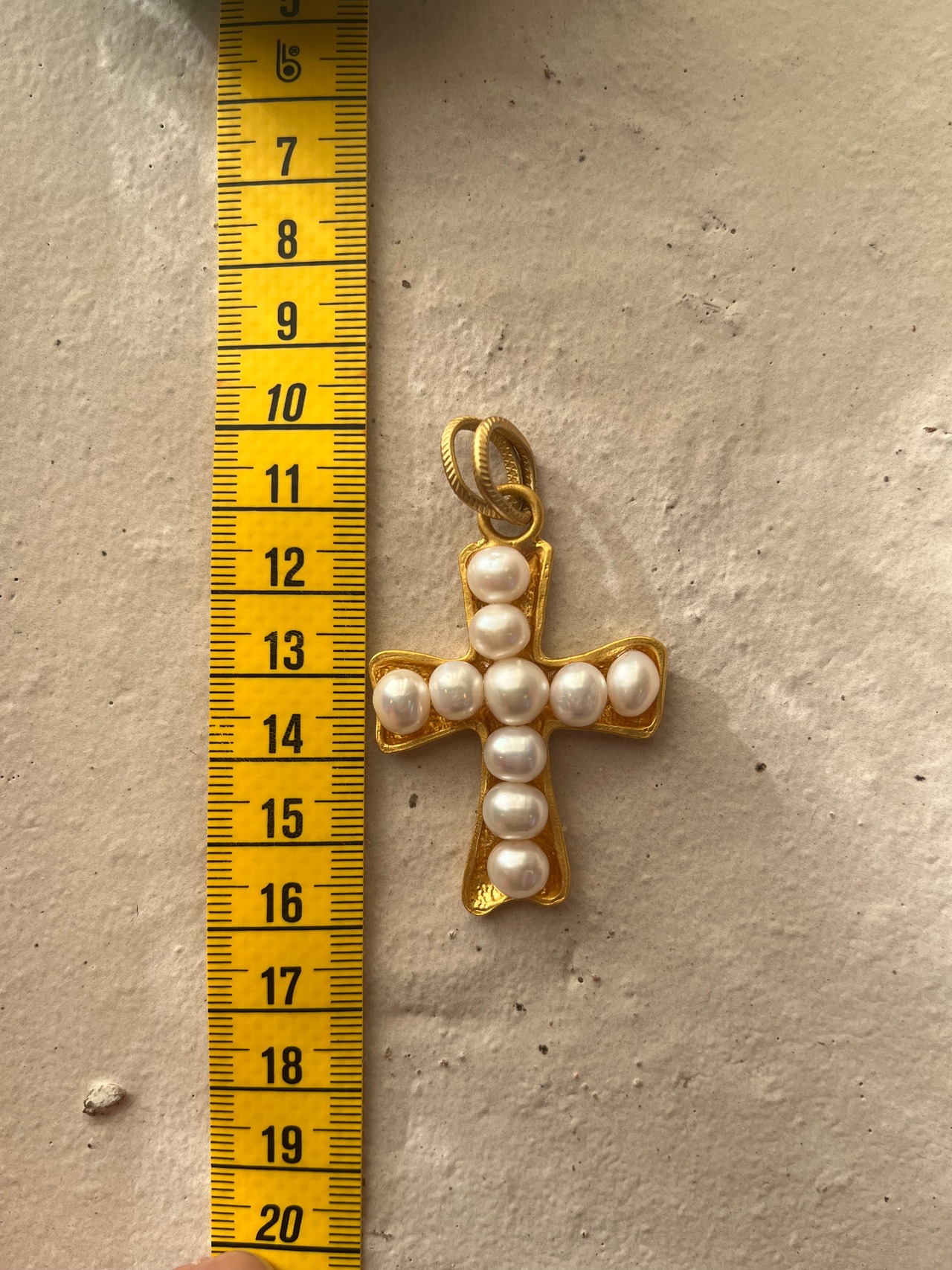 マットゴールドのしっかりとした作りのクロスパーツに淡水パールを敷き詰めた懐かしさもあり存在感もあるチャーム。淡水パールは天然素材のため個体差がございますため、素材の特性をご理解いただいた上でのご購入をお願いします。