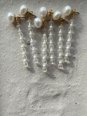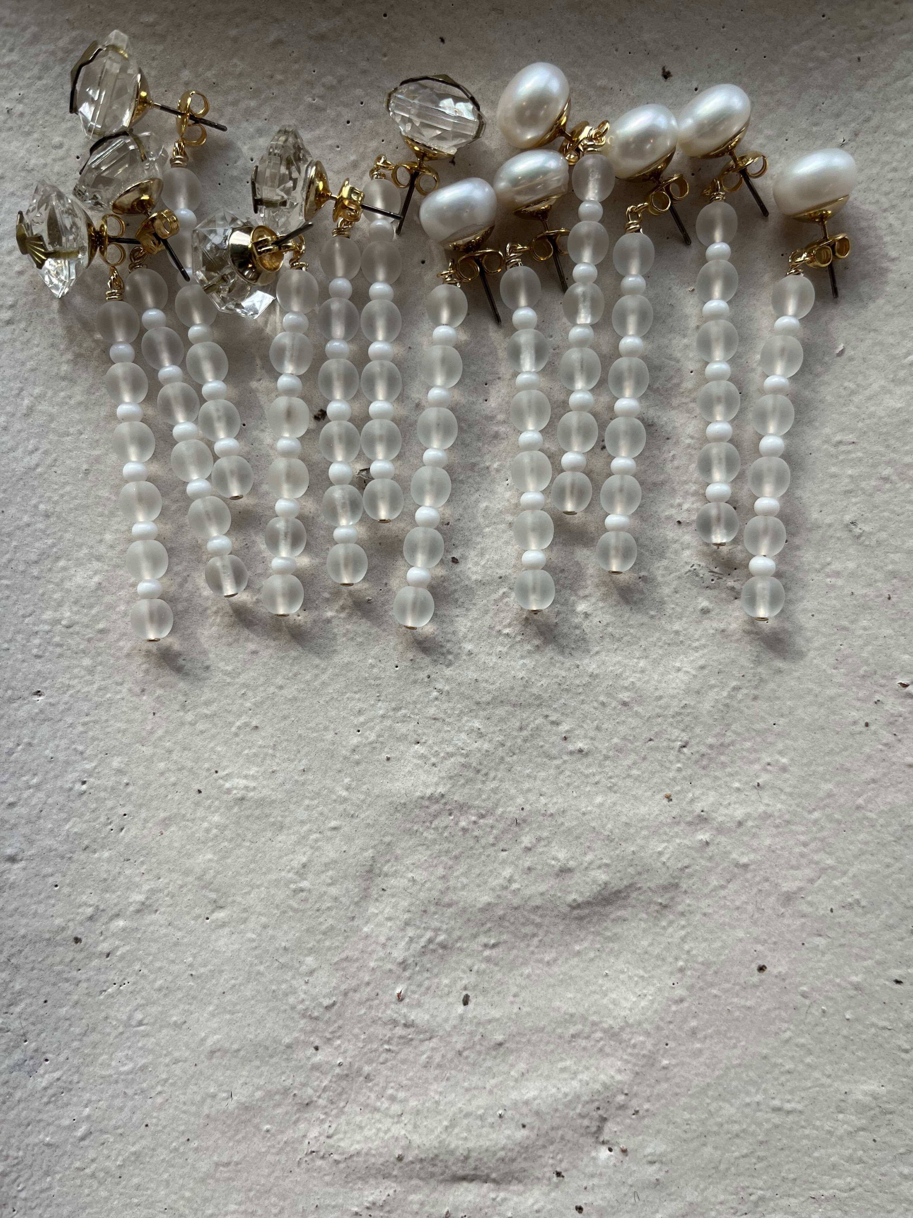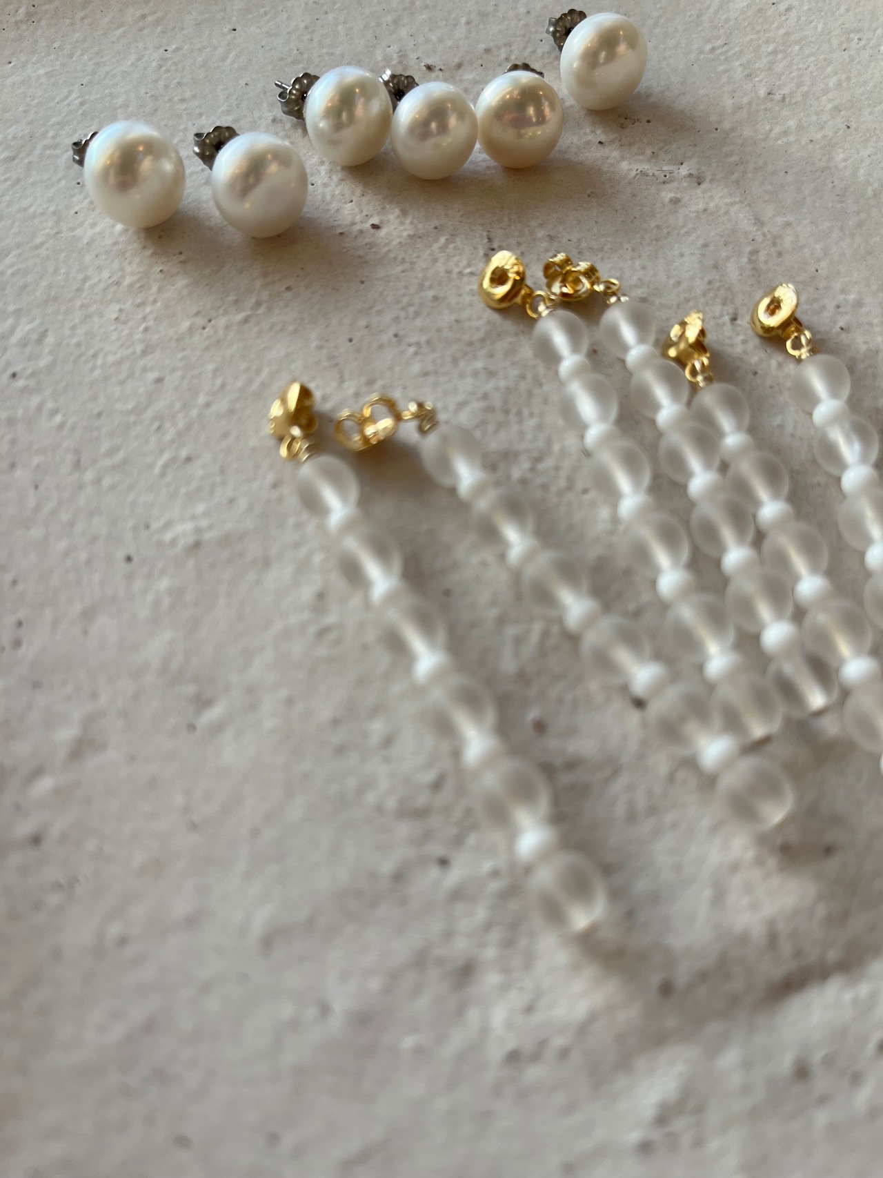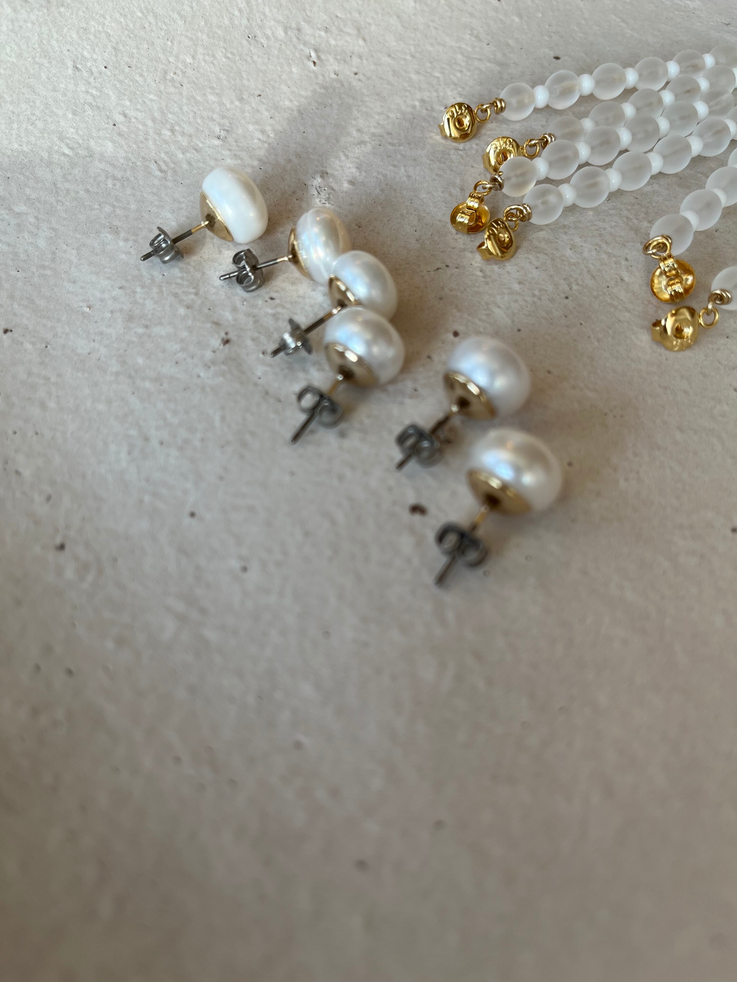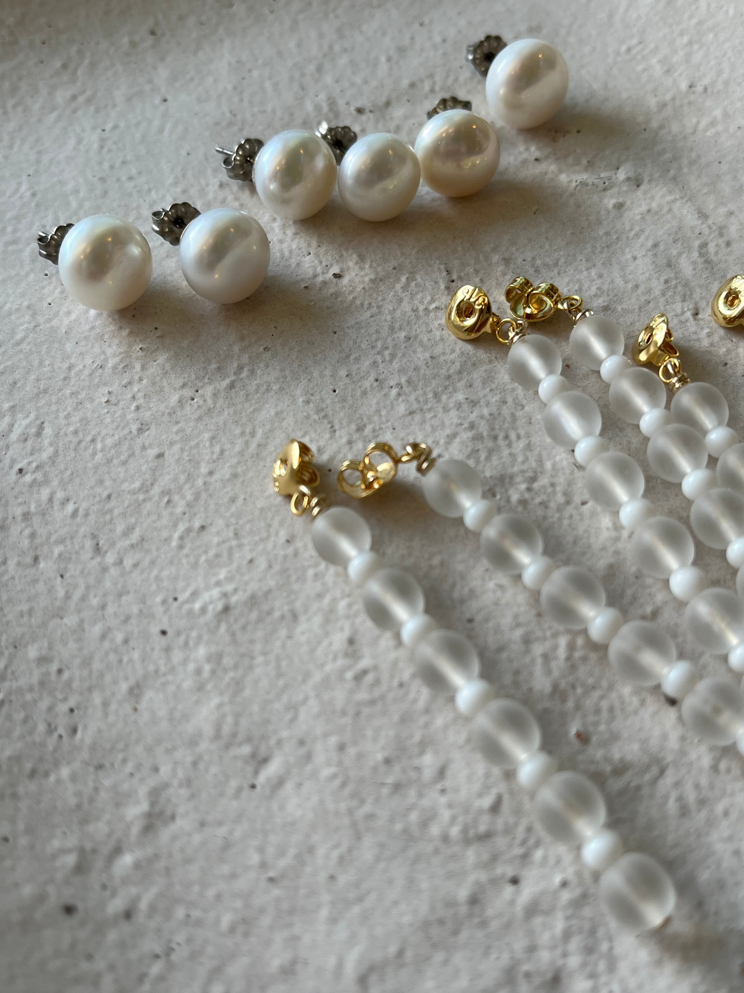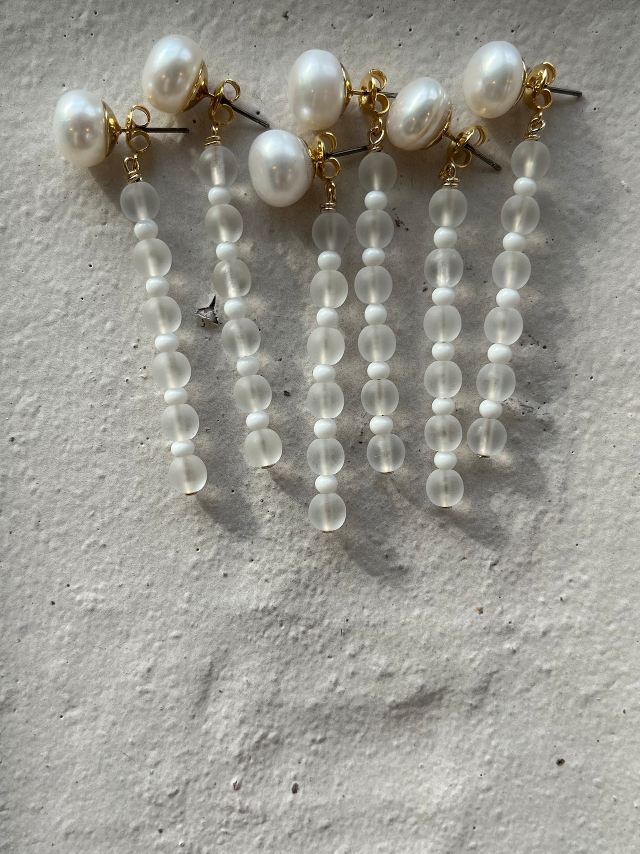 大粒の淡水パールのパーツをトップに使ったピアス。フロスト加工の丸玉ガラスビーズと小粒の日本製ヴィンテージを交互にして連ねたバー。