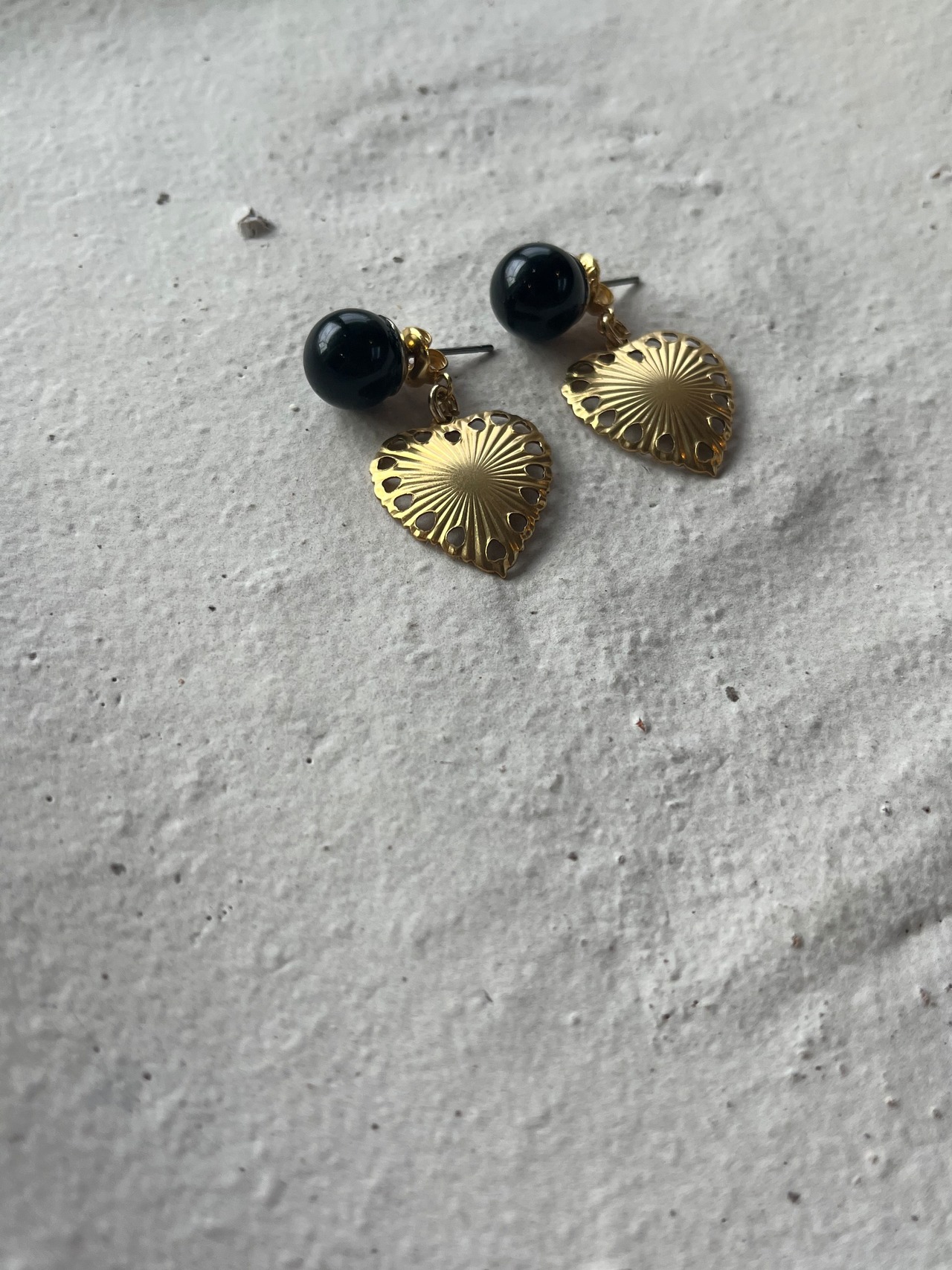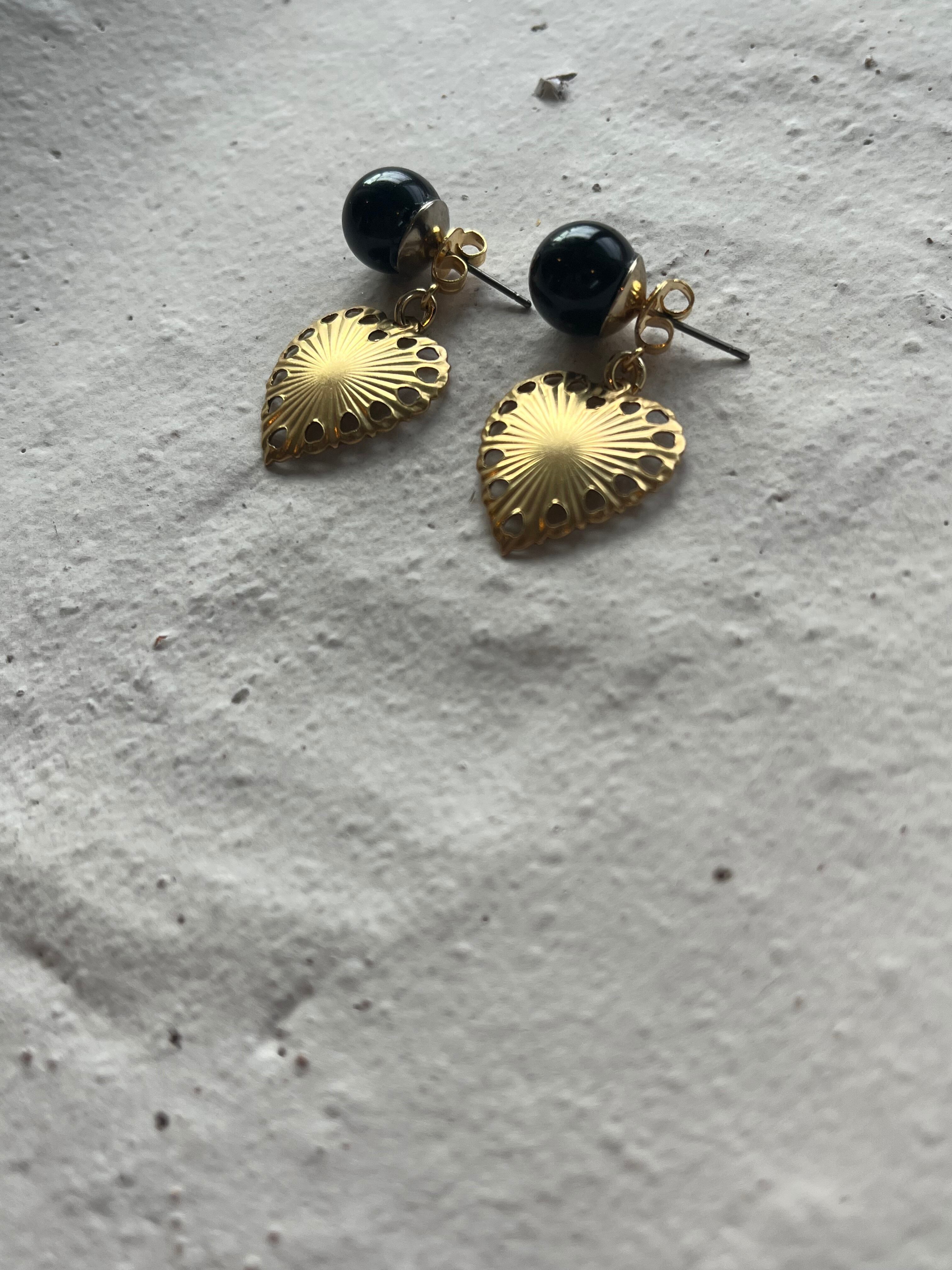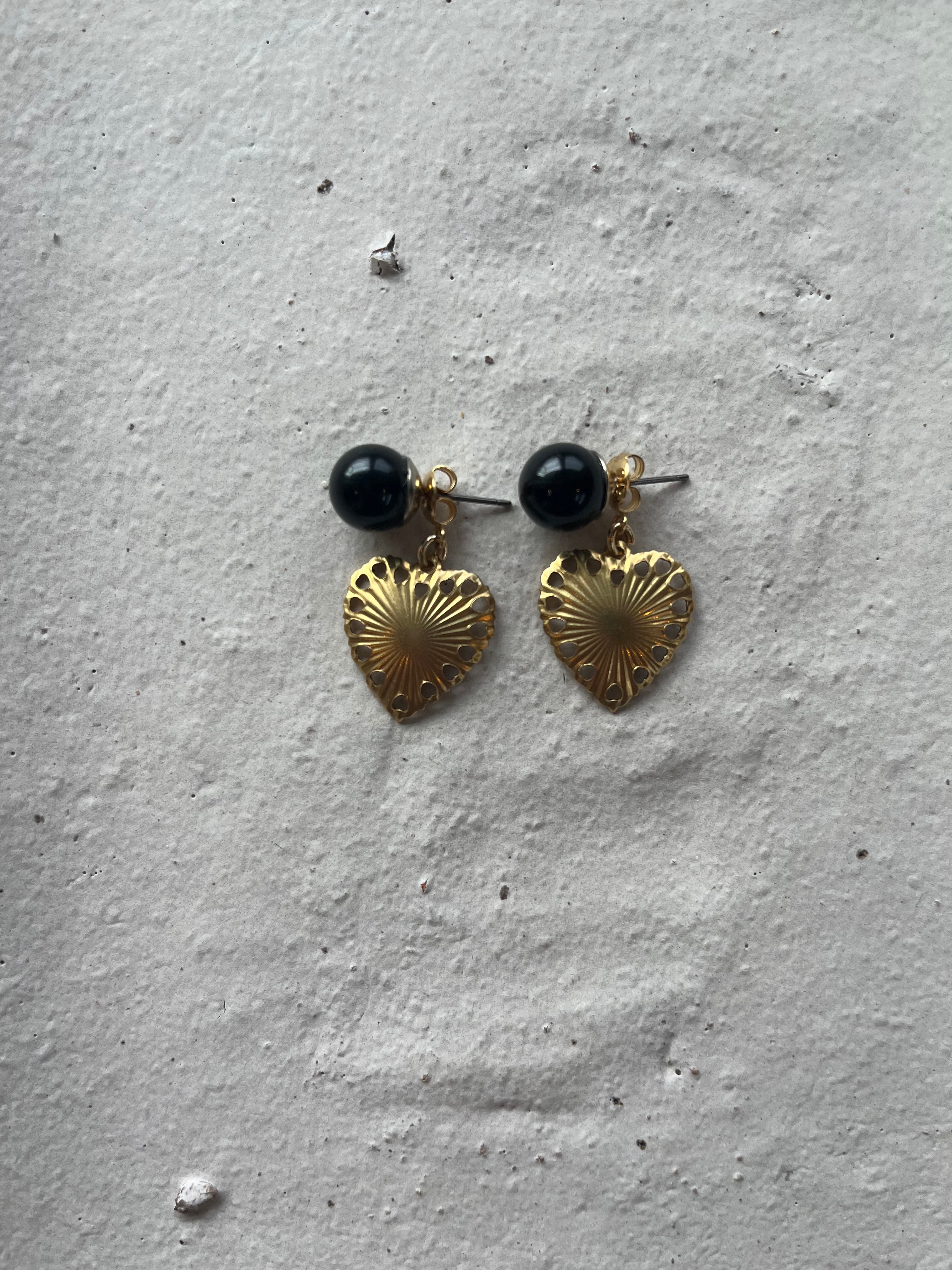 つやつやの丸ぽちブラックオニキス+ハートメタルパーツのキャッチのピアス。