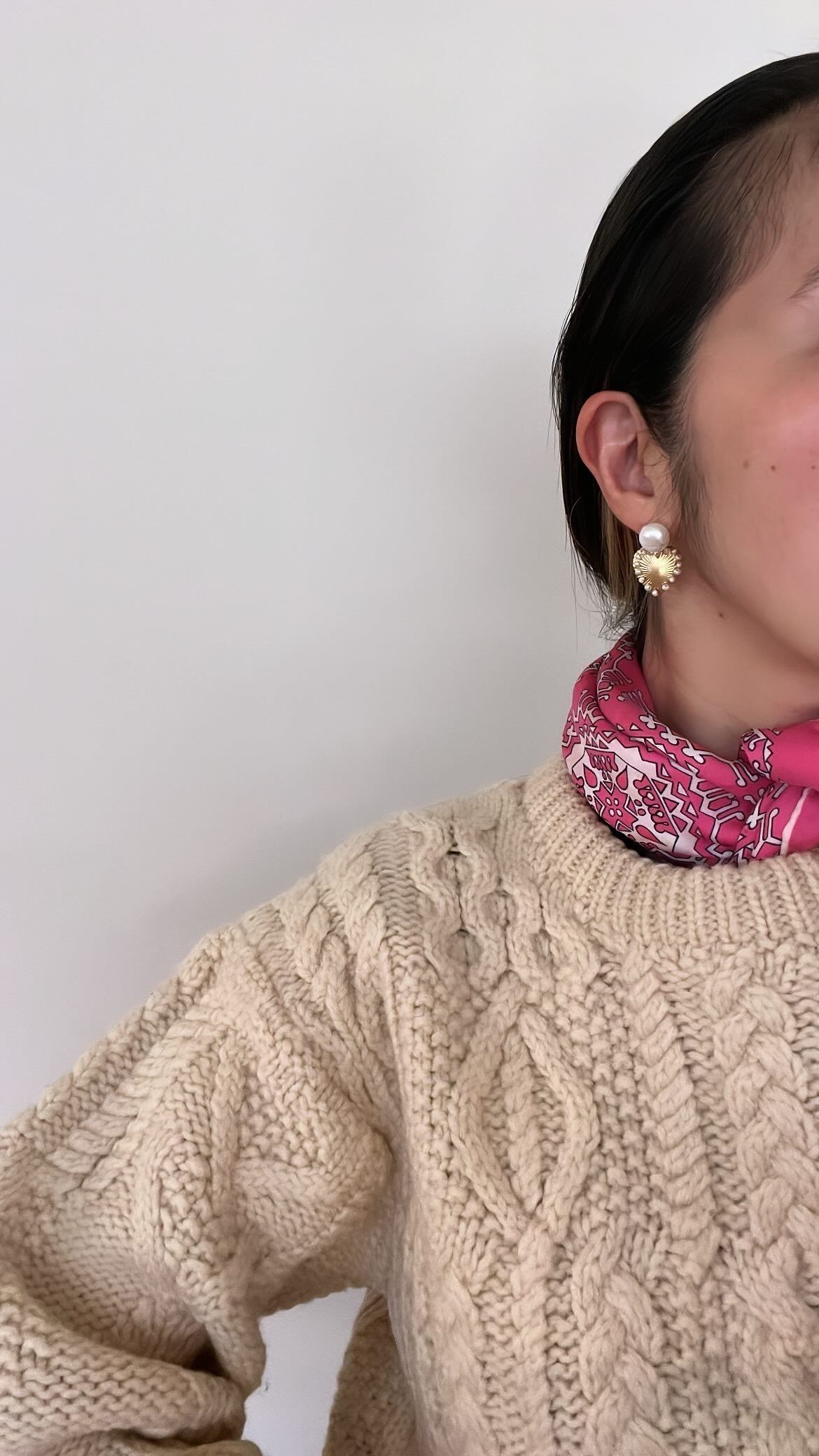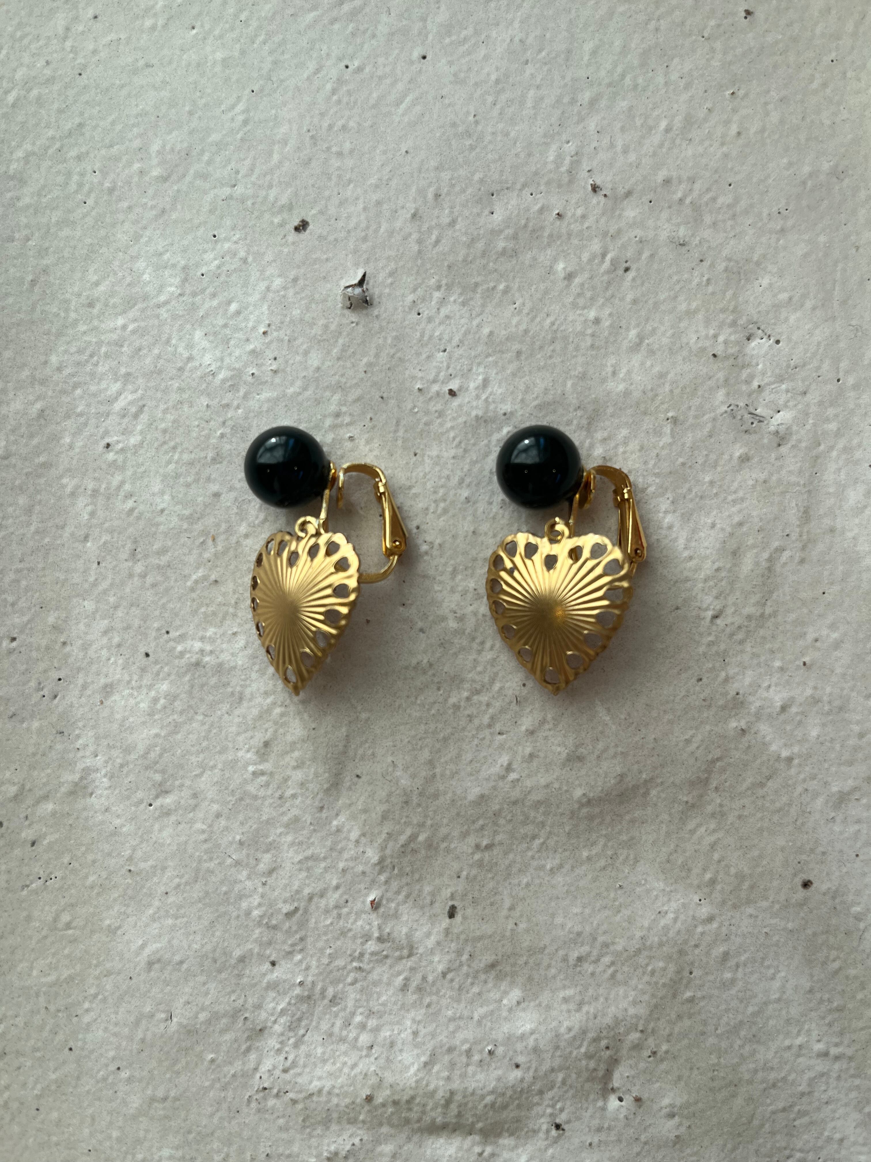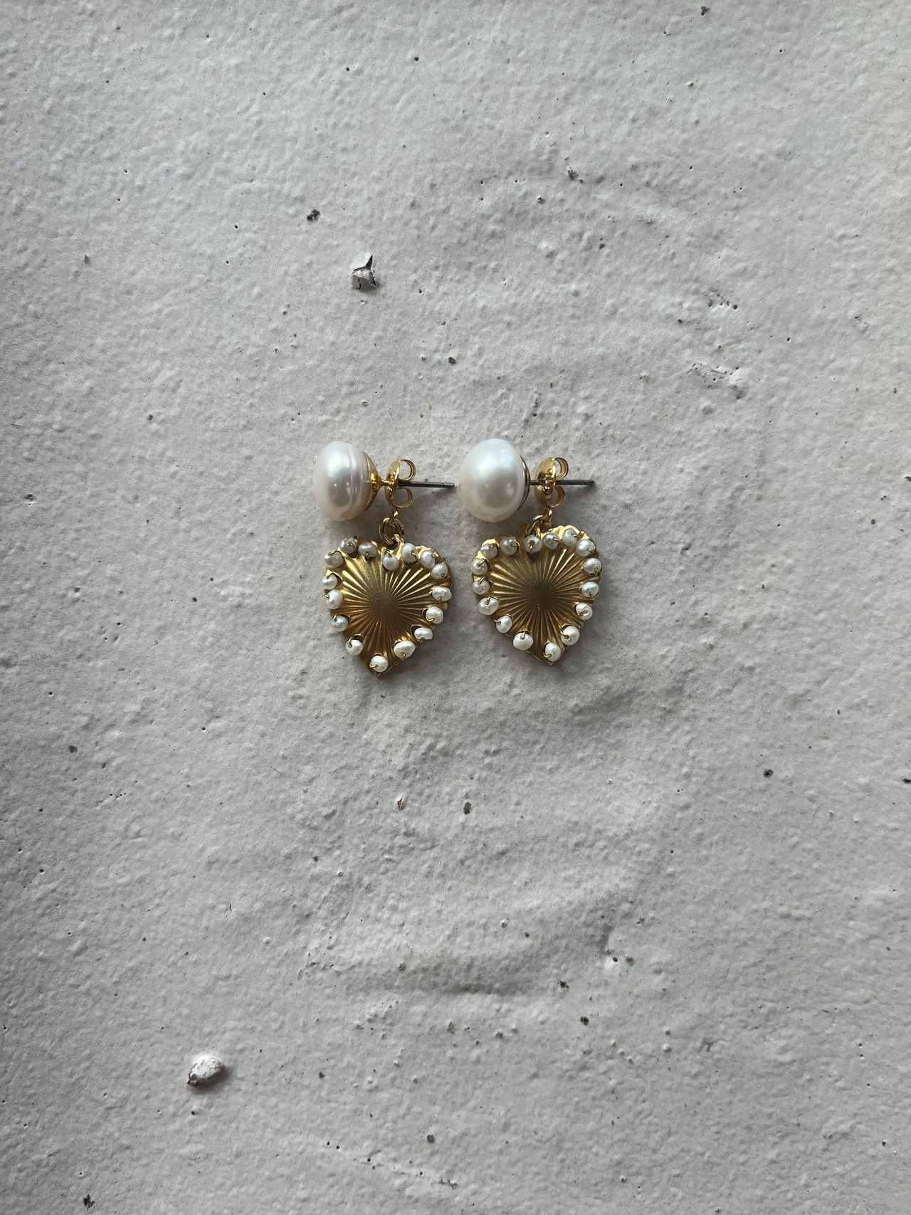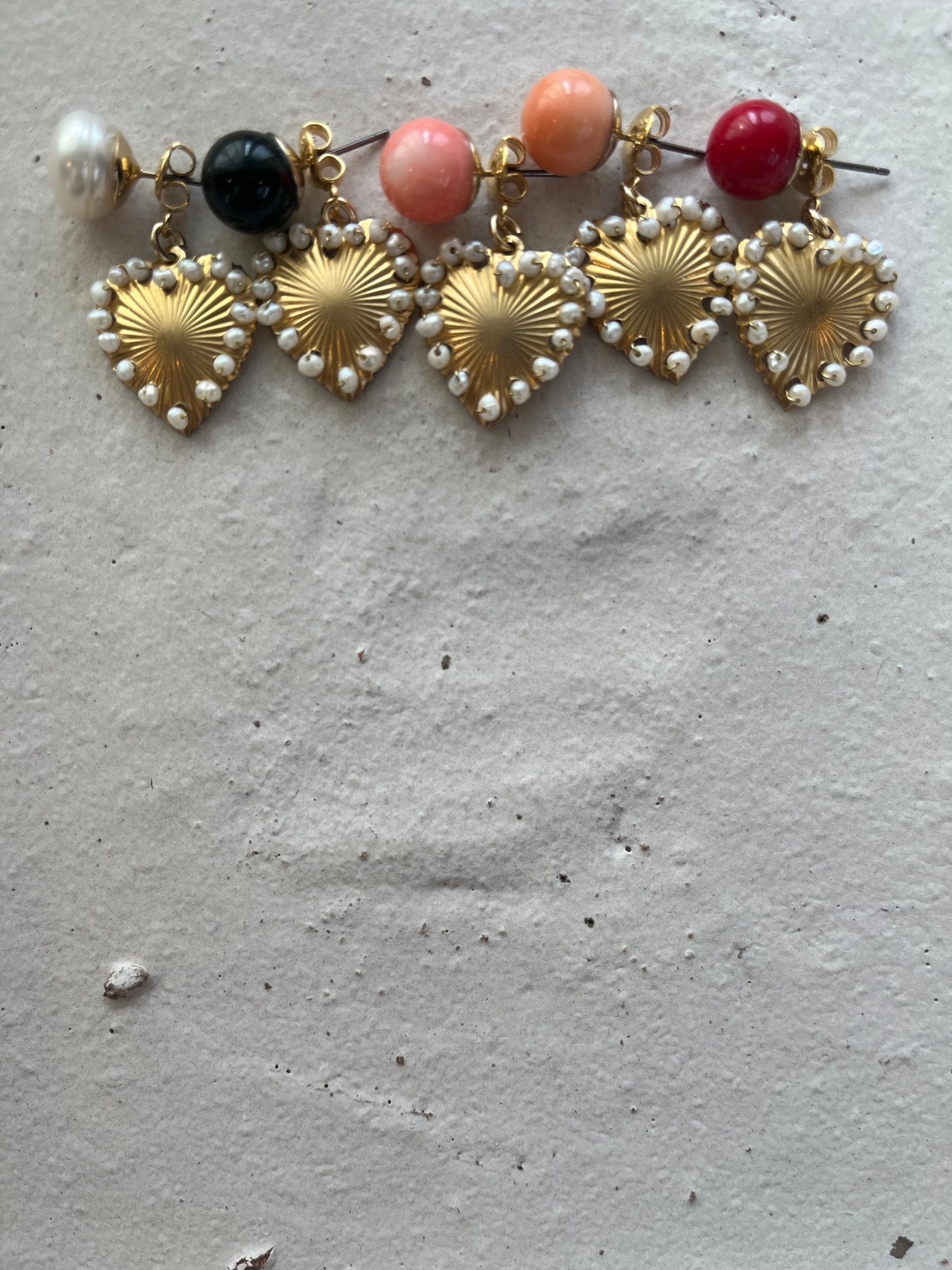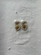 小さな淡水パールをワイヤーで縫い付けた放射線の入ったちょっと主張の強めのハートのキャッチは耳の後ろにきます。シンプルながらも遊びが入ったピアスに仕上がりました。