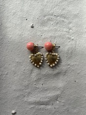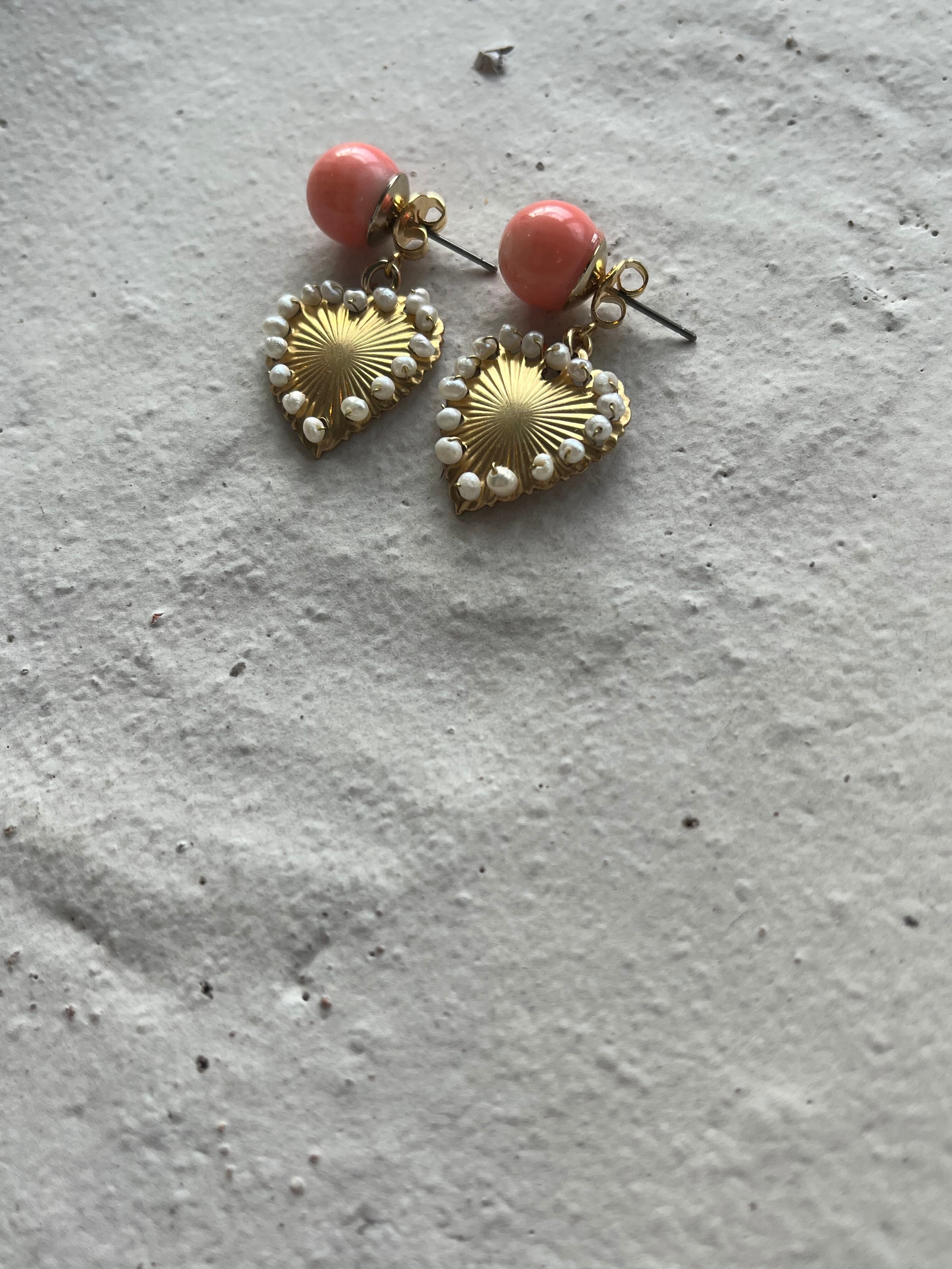 素材:珊瑚。ピアスポストはチタン。ハートメタルパーツは合金+キャッチはサージカルステンレス。予備のキャッチはチタン。