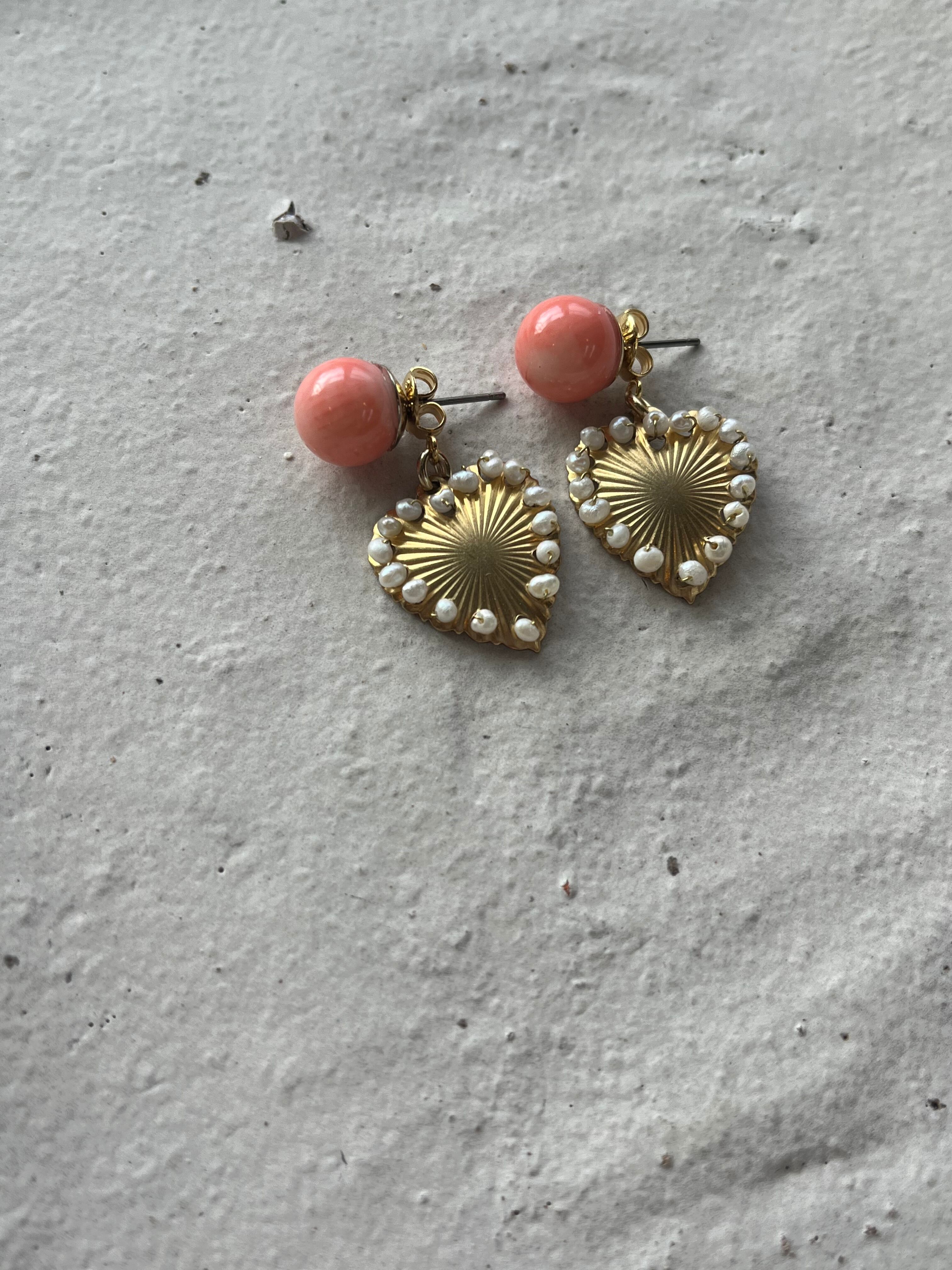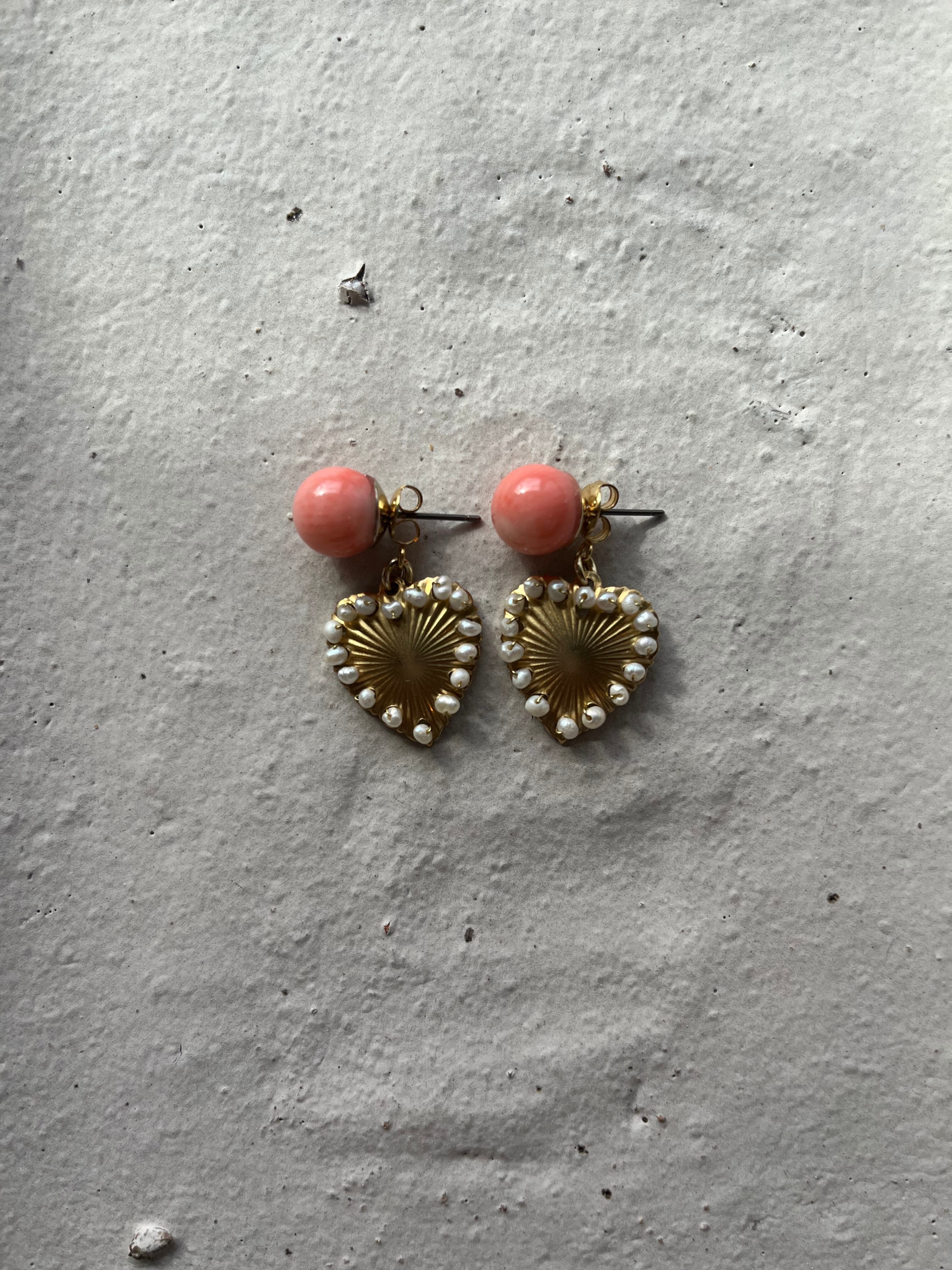 Metal heart catch pierced earrings【Pink Coral&Pearl heart】