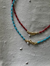 細めのお作りですが発色が良いビーズでしっかりとした存在感。ビーズ間には極小かそれより小さな小さなシードビーズをチョイスしました。シードビーズもアンティークかヴィンテージを。