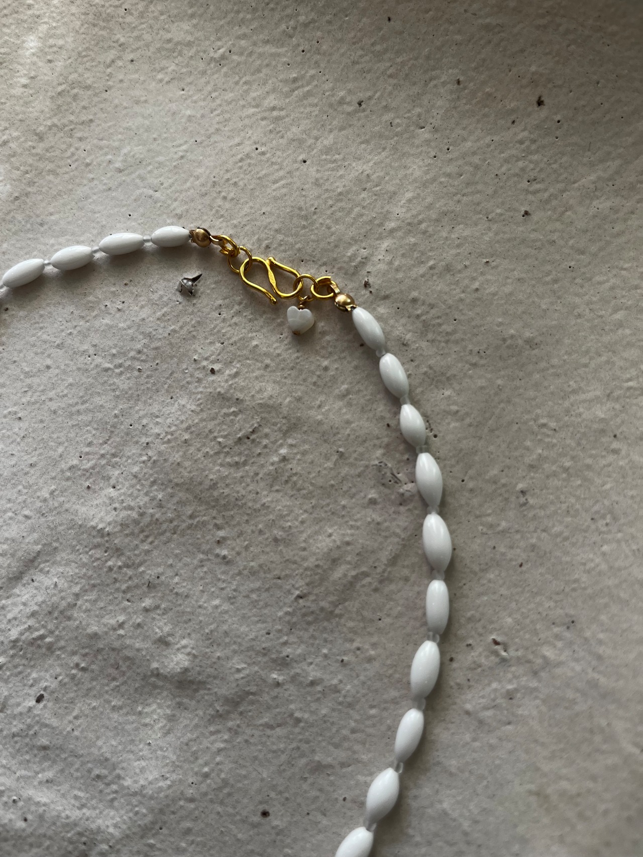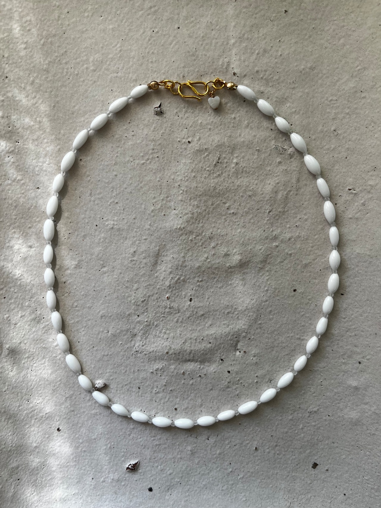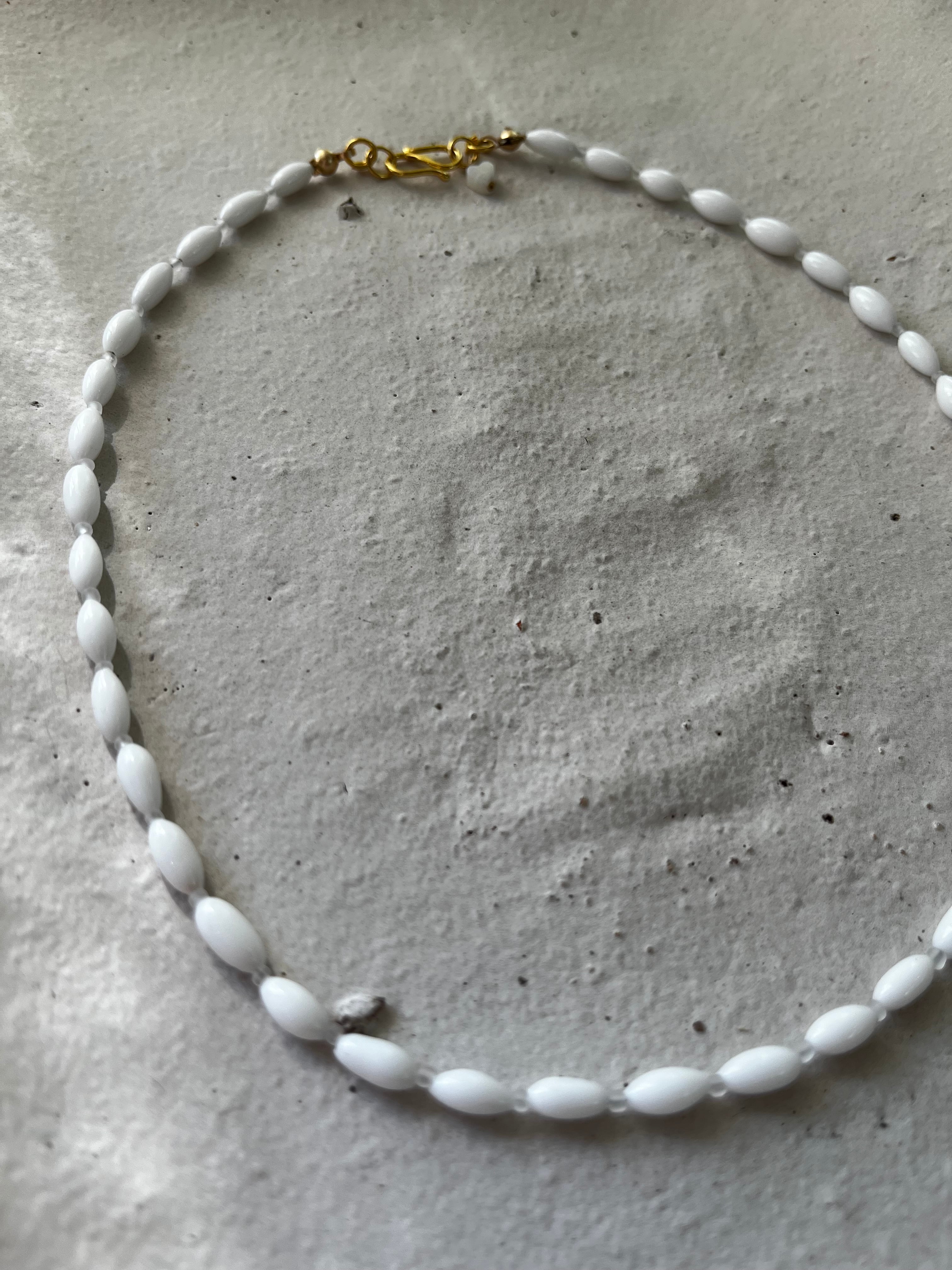 ジャパンヴィンテージのガラスビーズを使った軽いチョーカータイプのネックレス。ミルキーなホワイトは肌馴染みも良く程よいアクセントになります。間に入れたシードビーズはマットになります。