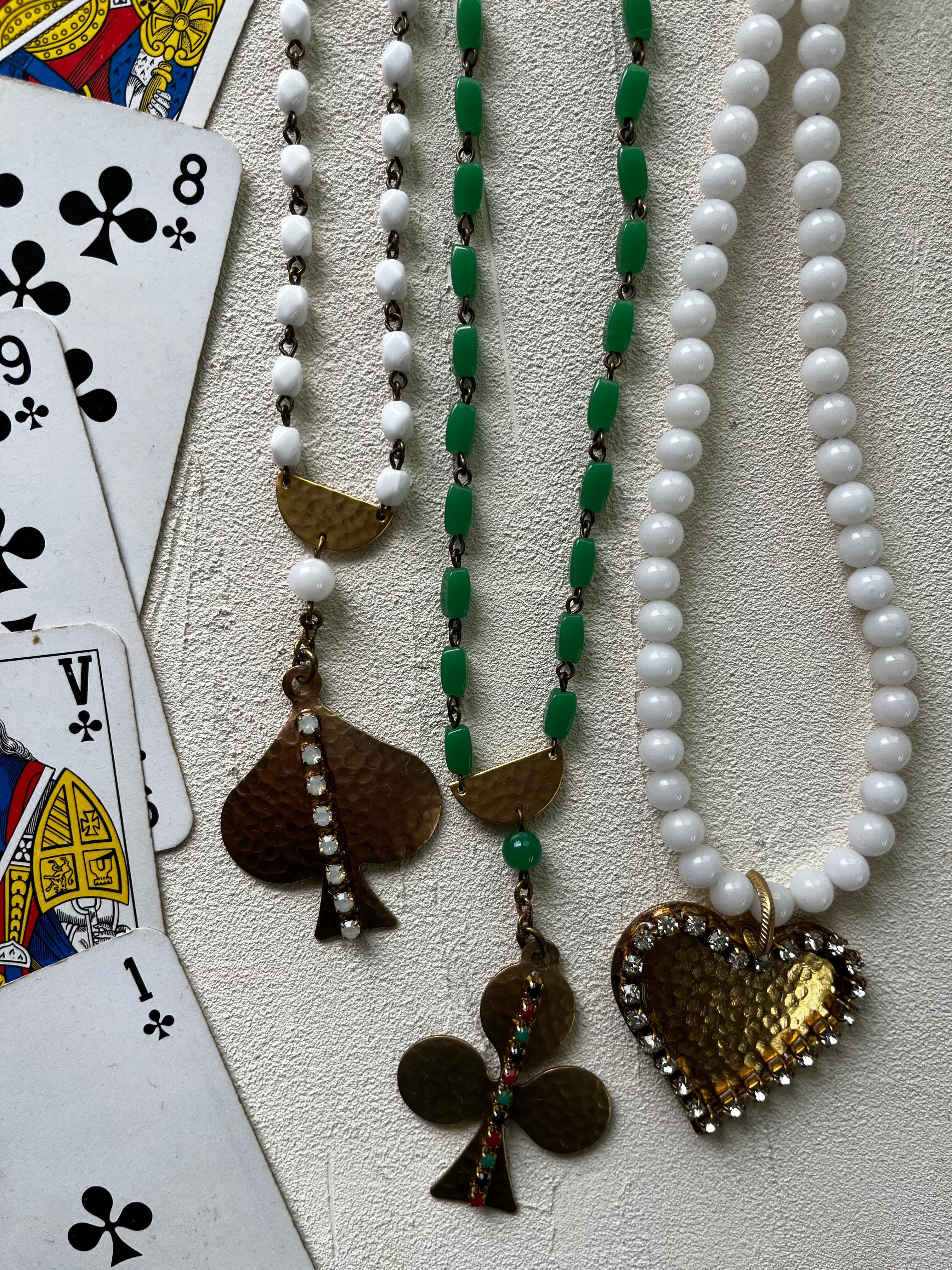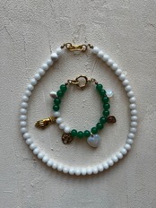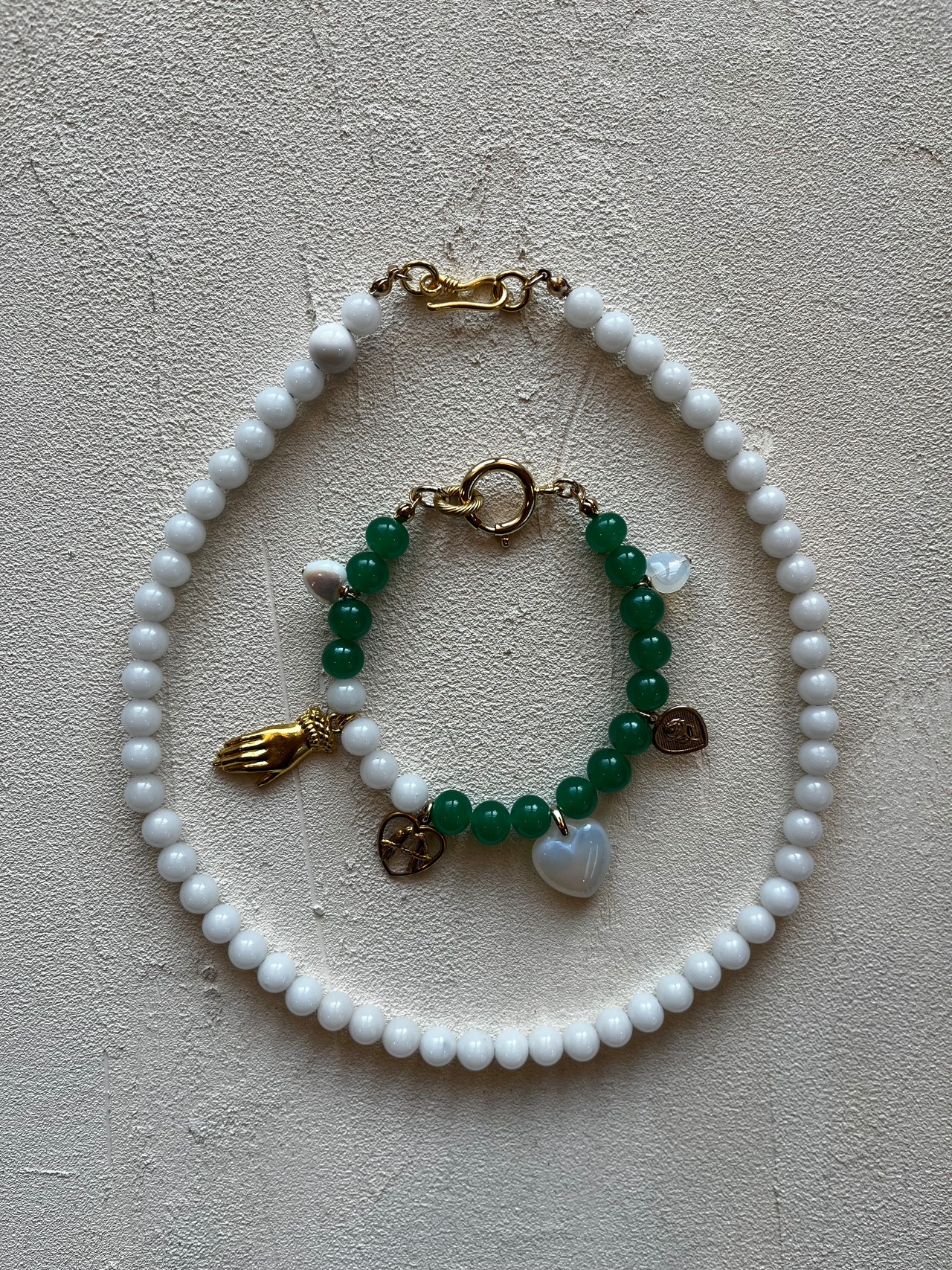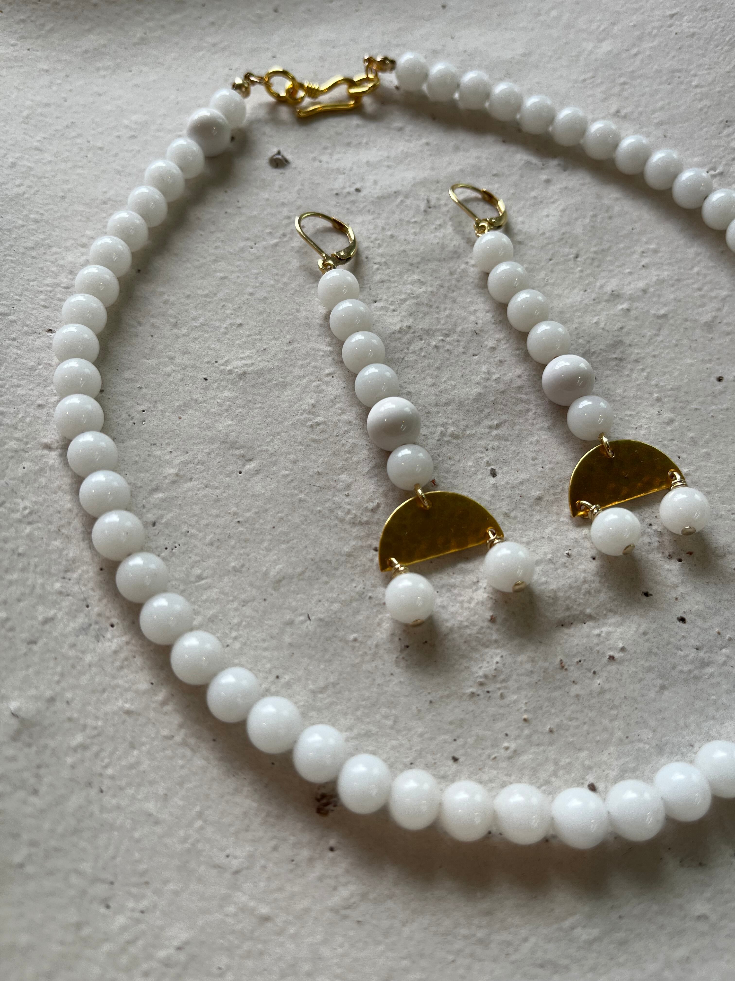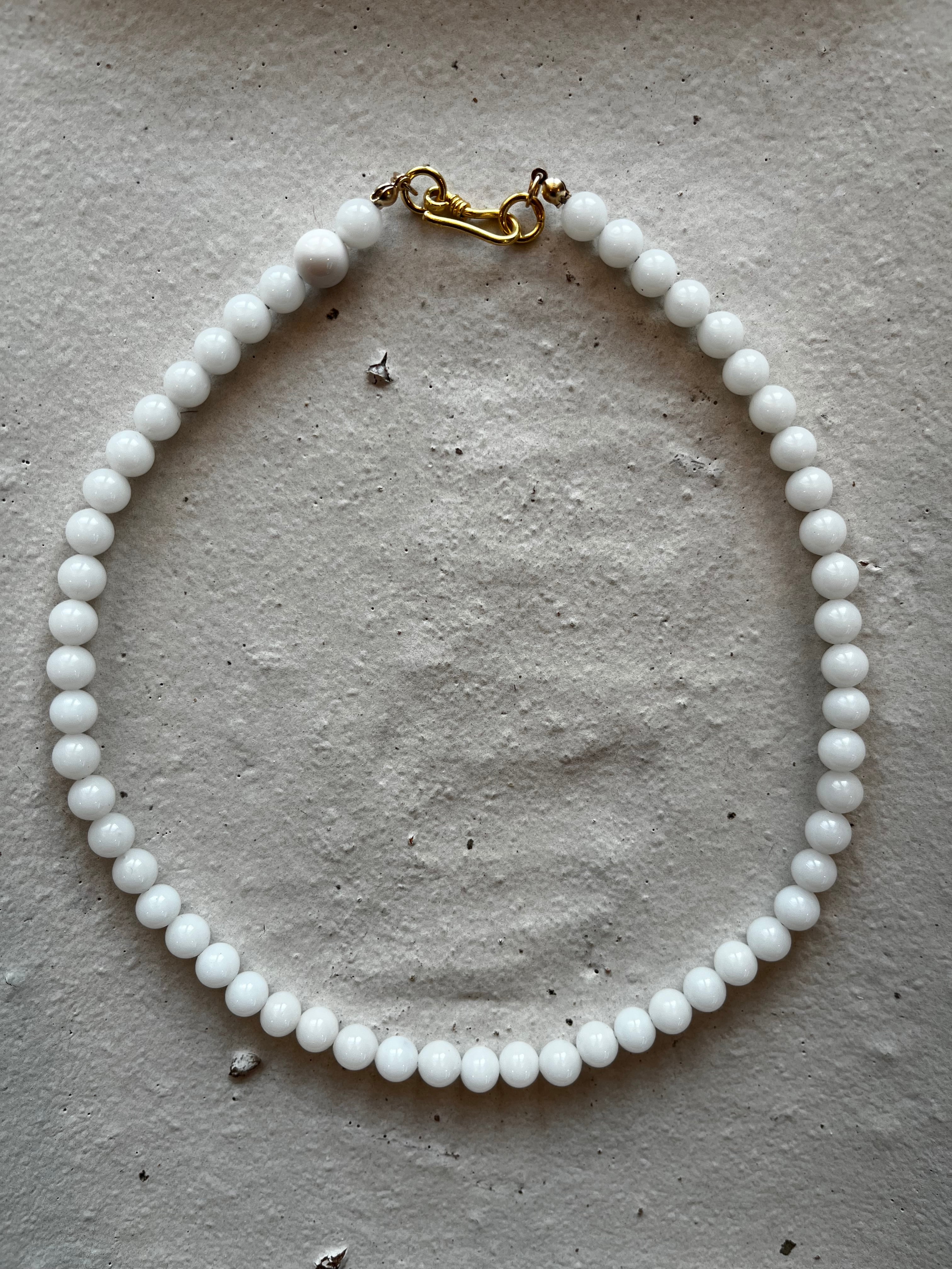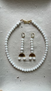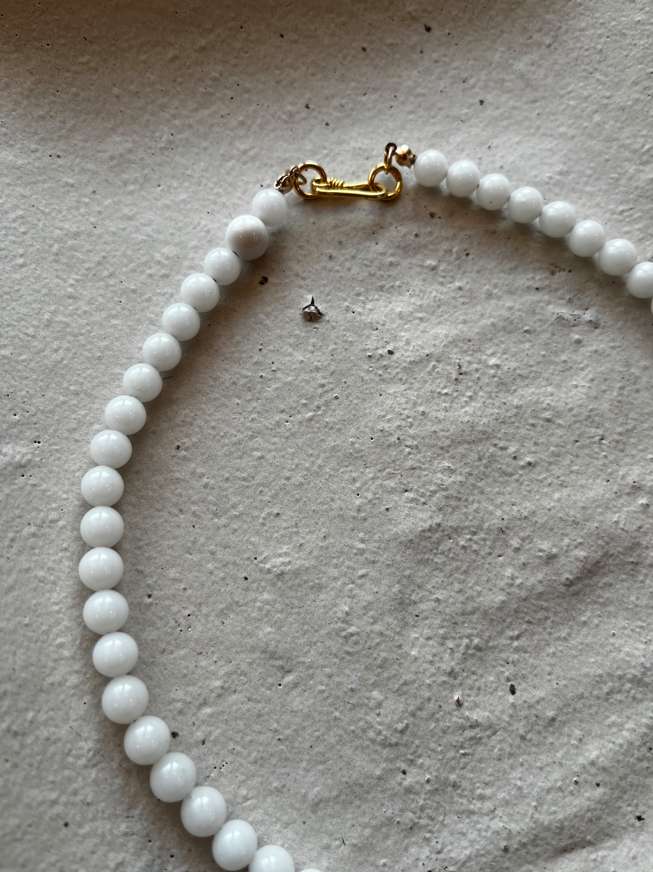 美しい美しいホワイトのビーズ。日本製のヴィンテージガラスです。柔らかいけれど存在感もある乳白色。柔らかな印象の中にも少し引き締めてくれる色が欲しくて、チョークホワイトに近い色のホワイトオニキスの天然石のビーズを一粒だけ入れました。